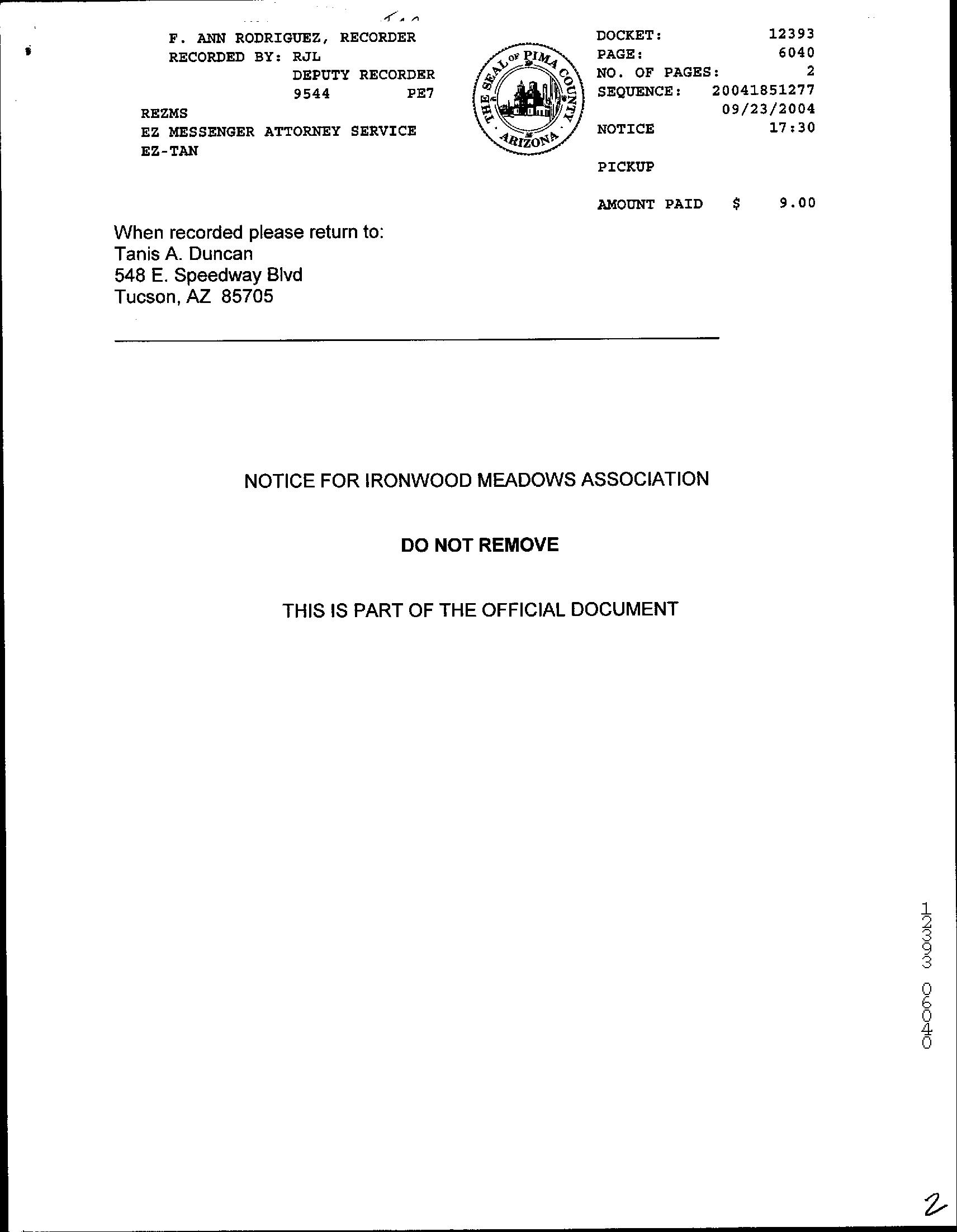 County: Pima Zoning: Stories: 1 APN: 225-03-4420 Acres: 0 16 Roof Material: Built Up Subdivision: Ironwood Meadows Cooling: Refrigeration Prior Sale Price: Census Tct / Blk: 004623 / 2005 Fireplace: Prior Sale Date: 1st Mtg / Type: $101,500 / Conventional Parking Type: Garage Prior Rec Date: Res / Comm Units: 1 / Flood Zone Code: X Prior Sale Doc #: