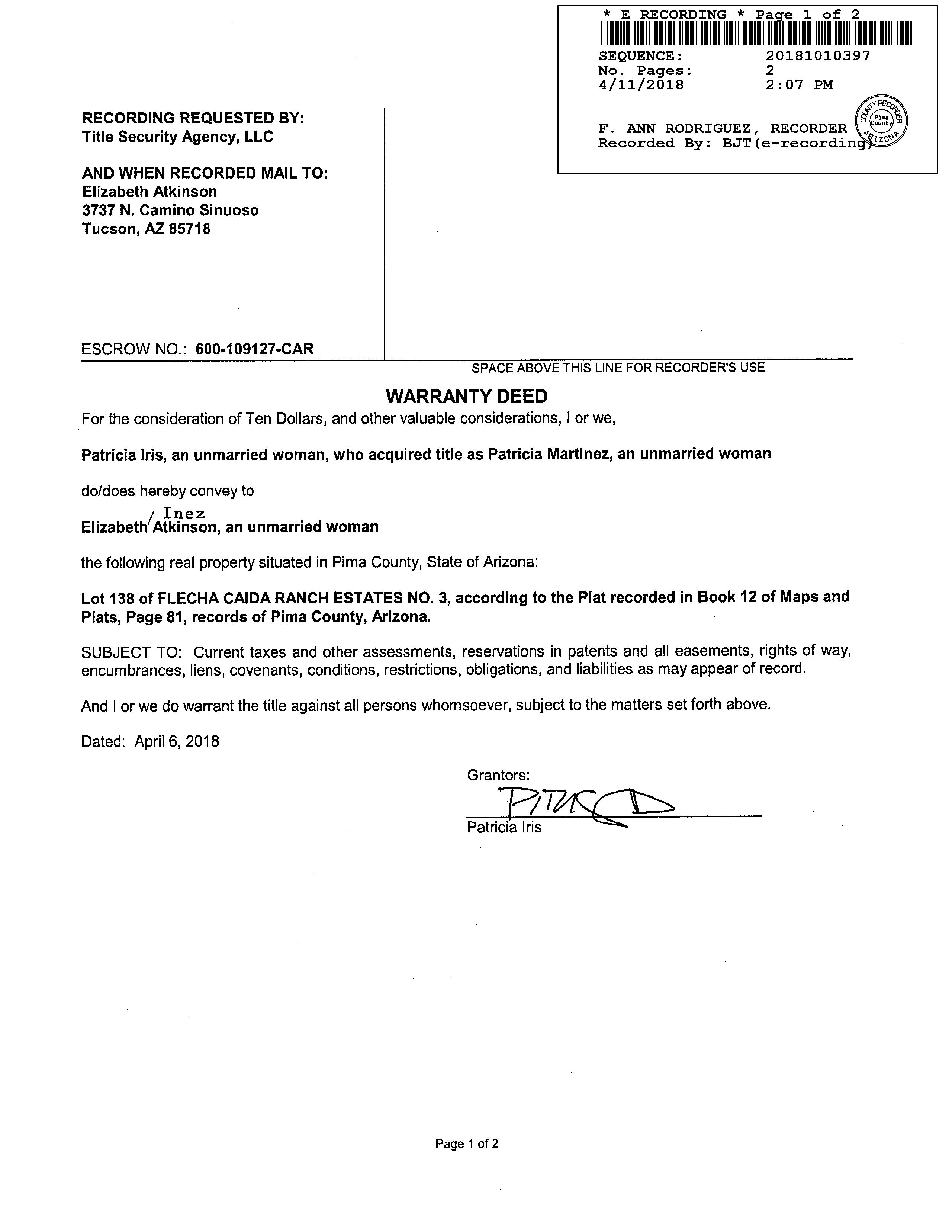 Owner Name: Atkinson Elizabeth Inez / APN / Alternate APN: 109-24-0130 / Deed Type: Warranty Deed