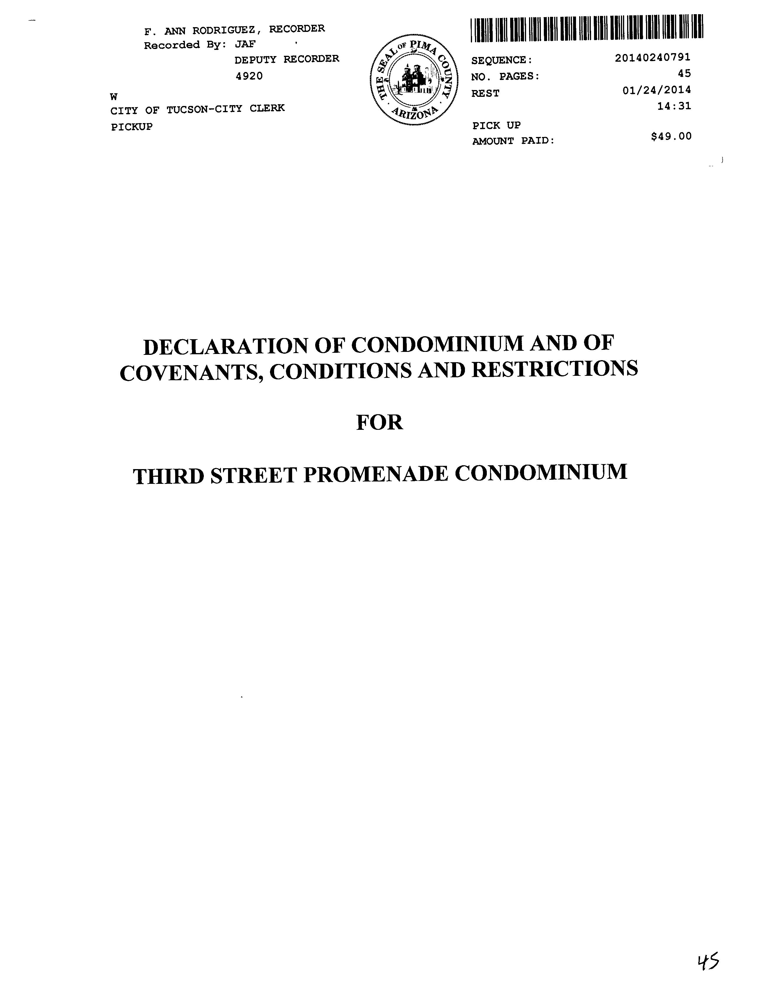 PARCEL: 125-11-5490 PARCEL: 125-11-5490 INSTRUMENT REC DATE OWNER: MOOTHART JOHN D/JOANNE 2018 1510119 05/31/2018 MAIL: 3830 E 3RD ST UNIT 2102 TUCSON, AZ 85716 PLAT: LOT 00005 BLOCK LEGAL: THIRD STREET PROMENADE CONDOMINIUM SQ20140240790 BLDG 2 UNIT 5 & INT IN COMMON ELEMENTS PER DEED RESTRICTION CURRENT TAXES INFORMATION THROUGH 10/21/2022 LAND IMPR EXEMPT RATE AREA SPECIAL DISTRICTS PRIMARY 17,260 0 0 11.1537 0150 SECONDARY 50 17,210 0 2.7742 2022 TOTAL TAX BILLED 2,403.94 2022 TAX AMT TAX DUE INTEREST DATE PAID TOTAL DUE FIRST HALF 1,201.97 1,201.97 16.03 1,218.00 SECOND HALF 1,201.97 1,201.97 0.00 1,201.97 TOTAL CURRENT TAXES DUE 11/22 2,419.97 12/22 2,435.99 (ESTIMATED)