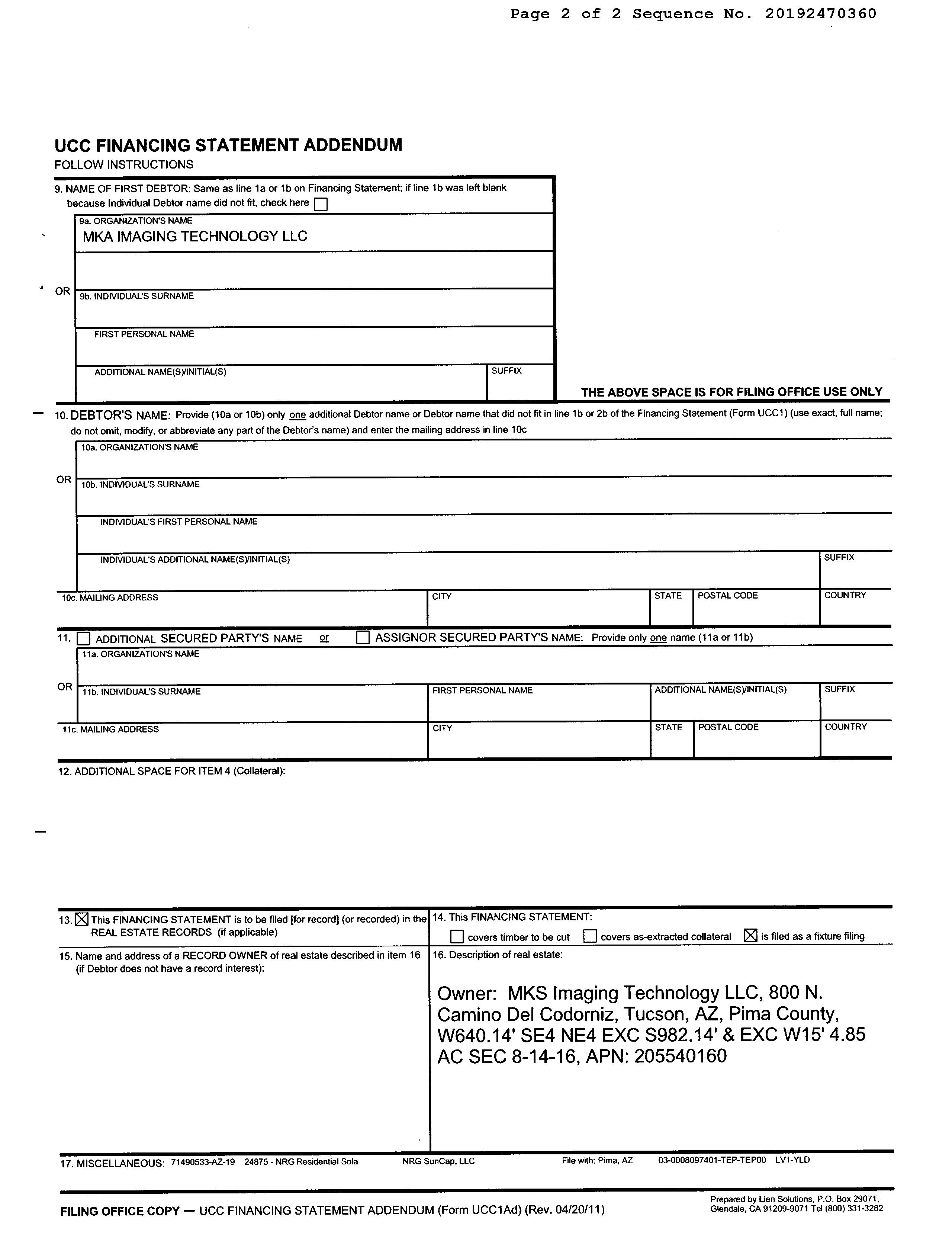 Mailing Address : 800 N Camino Del Codorniz, Tucson AZ 85748-7111 C010