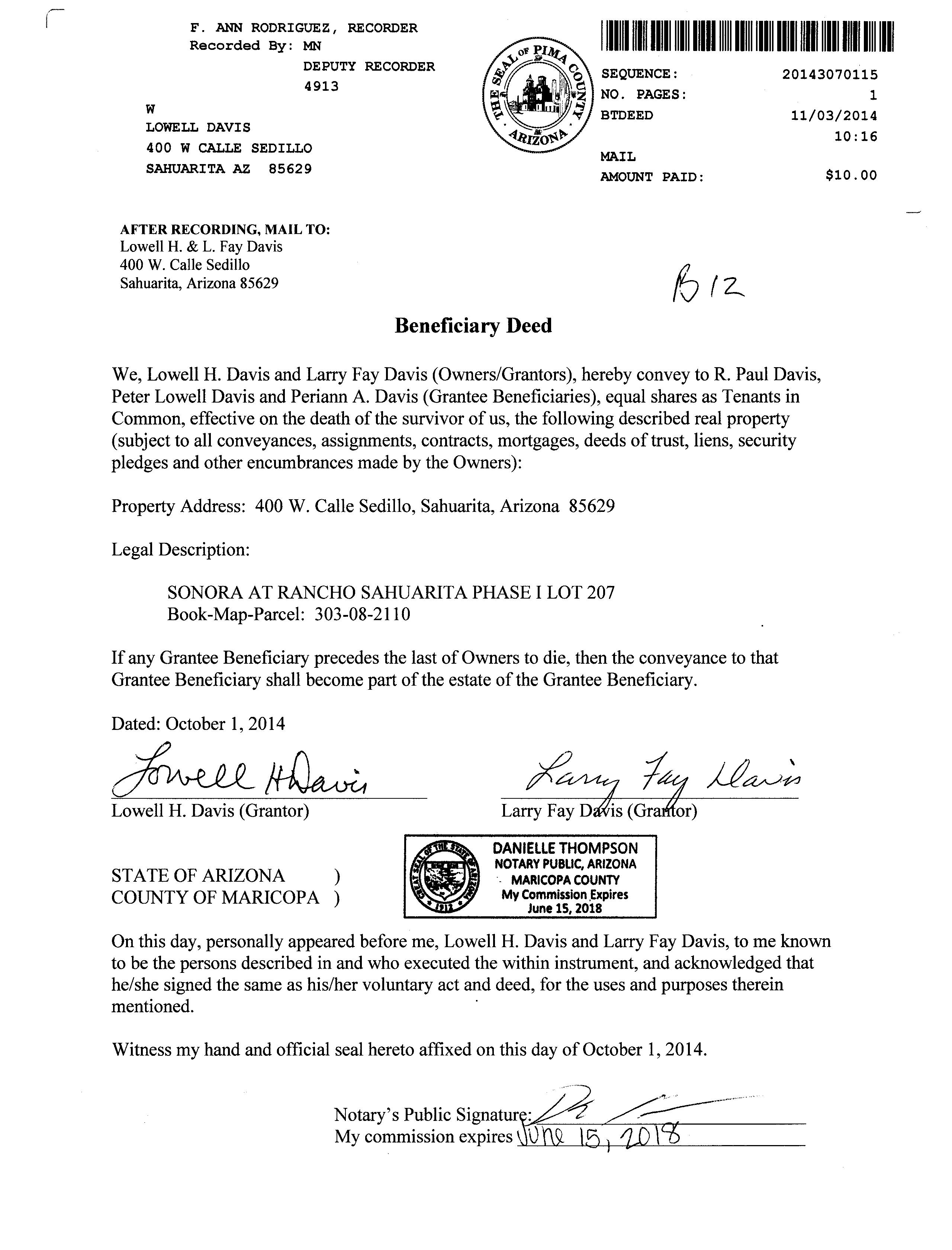 Mailing Address : 400 W Calle Sedillo, Sahuarita AZ 85629-8104 R005