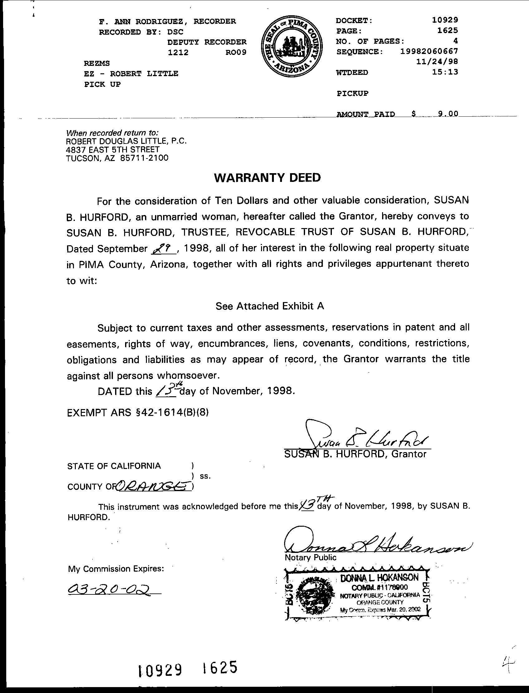 OWNER: HURFORD SUSAN B TR 10301 2224 05/23/1996 SITUS: 4010 W CAMINO NUESTRO PC MAIL: 31561 TABLE ROCK DR STE 420 LAGUNA BEACH CA 92651-8333 LEGAL: PC IN CENTER OF SE4 5.00 AC SEC 19-13-13 CURRENT TAXES INFORMATION THROUGH 11/25/2022 LAND