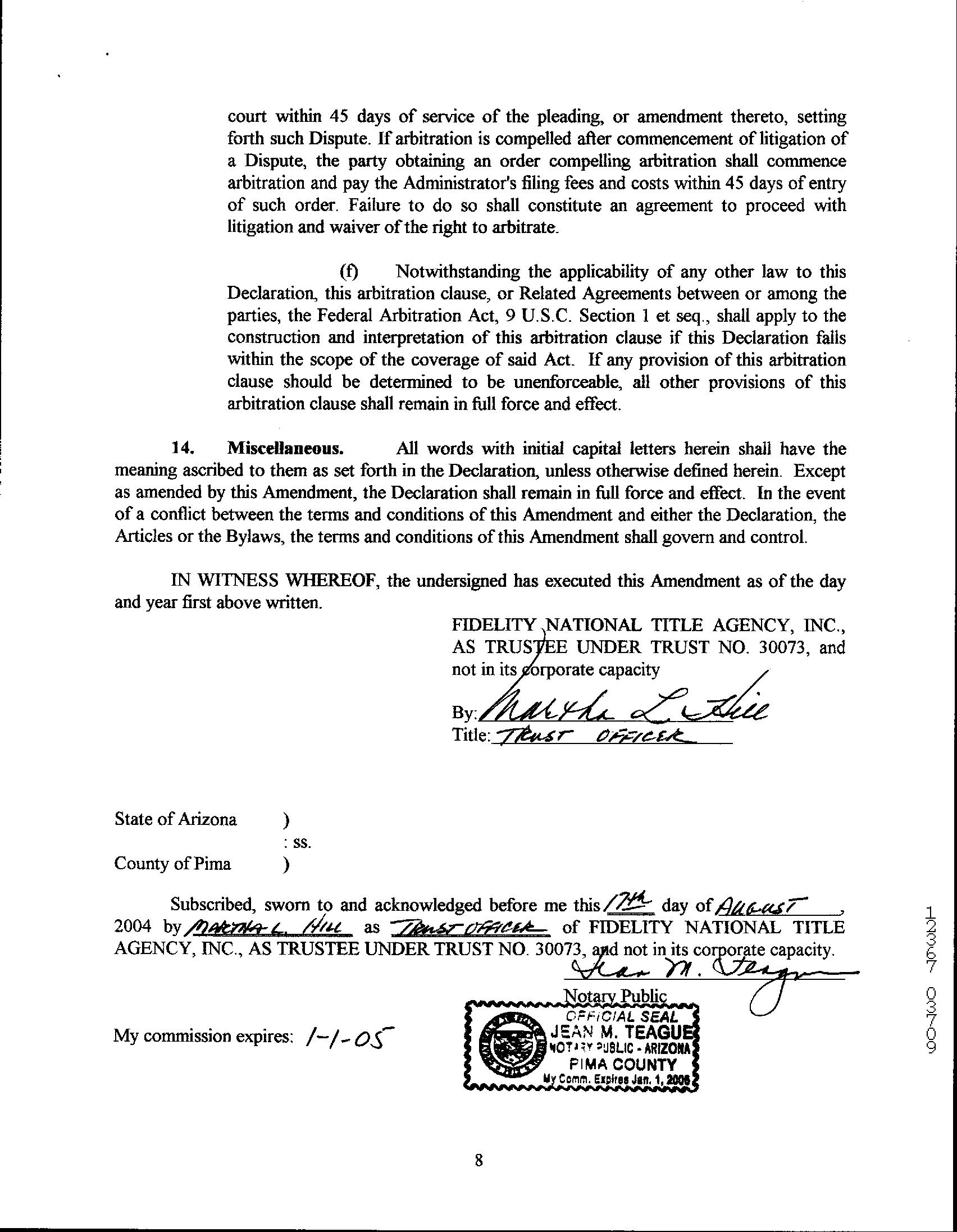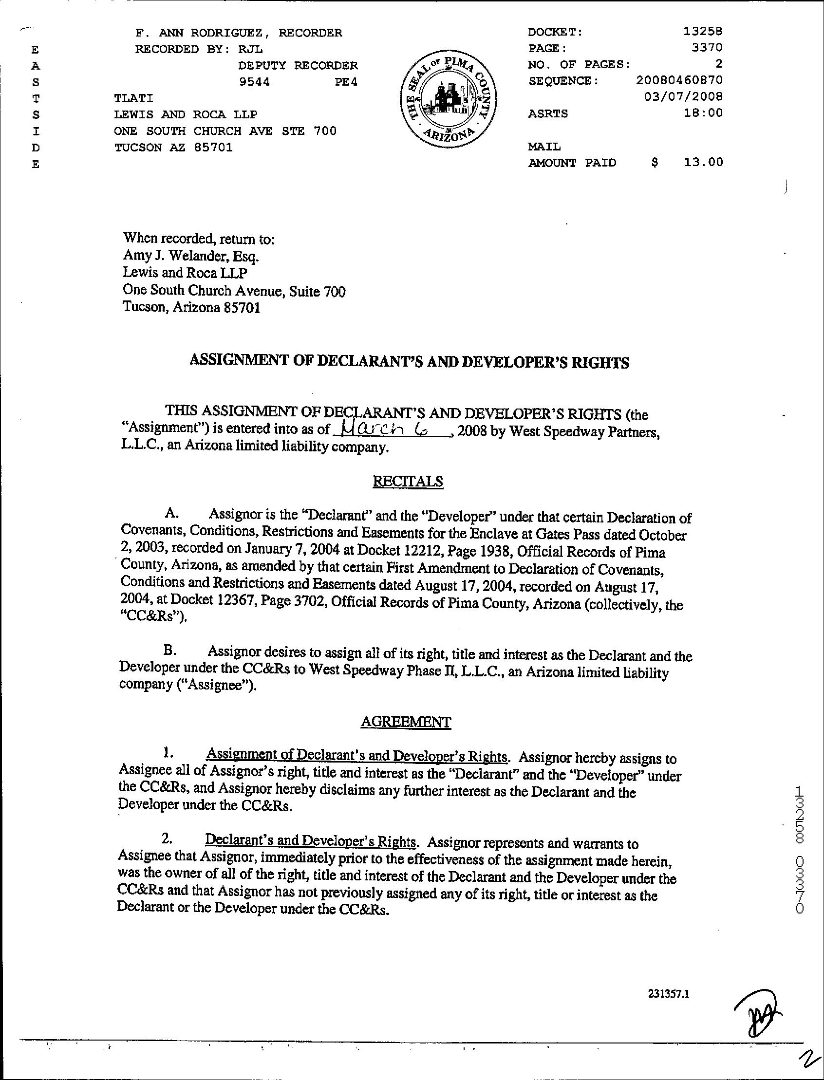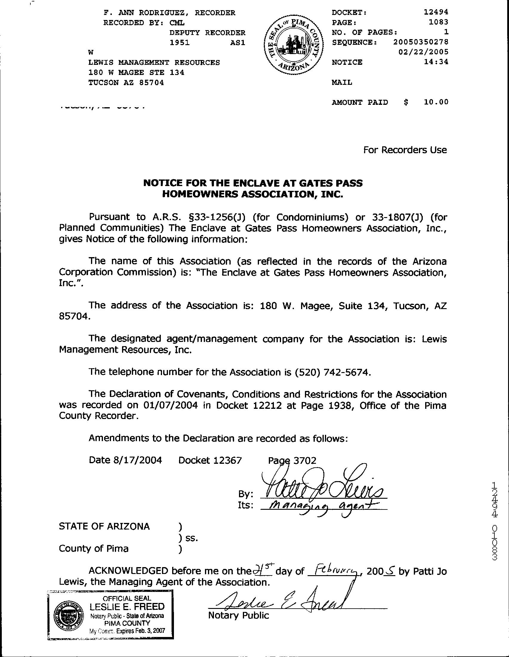 ©2021 First American Financial Corporation and/or its affiliates. All rights reserved. NYSE: FAF 05252610821 COVENANTS, CONDITIONS & RESTRICTIONS PREPARED FOR : First American Title Insurance Company, and the operating divisions thereof, make no express or implied warranty respecting the information presented and assume no responsibility for errors or omissions. First American, the eagle logo, First American Title, and firstam.com are registered trademarks or trademarks of First American Financial Corporation and/or its affiliates. 4091 W. Gates Creek Ct. Tucson, AZ 85745