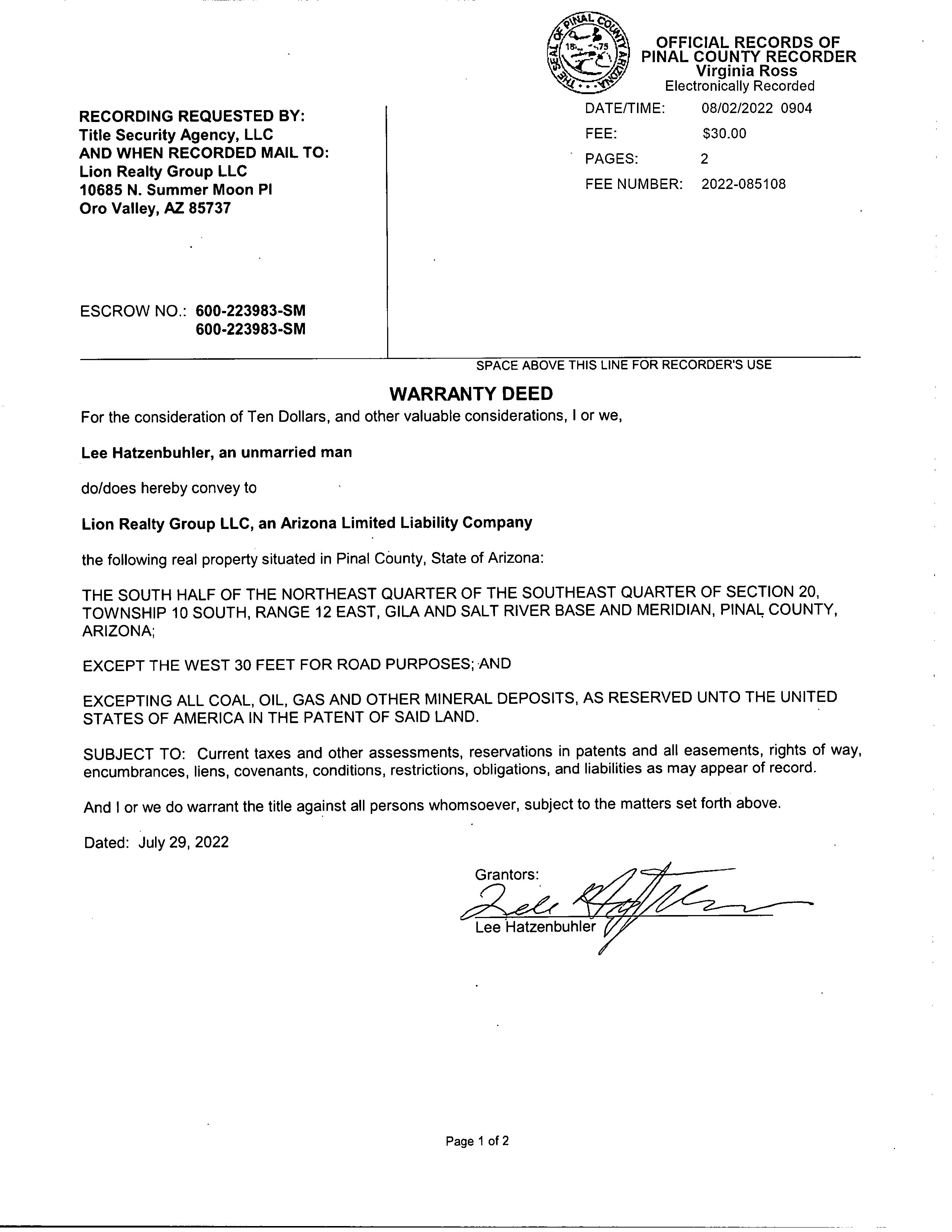 Subject Property : E Derrio Canyon Rd Marana AZ 85653 Owner Information Owner Name : Lion Realty Group Llc Mailing Address : 10685 N Summer Moon Pl, Oro Valley AZ 85737-8631 R062 Vesting Codes : / / Corporation Location Information Legal Description : S1/2 Ne Se Of Sec 20-10s-12e 20.00 Ac (4) County : Pinal, Az APN : 304-07-011B Township-Range- Sect : 10S-12E-20 Map Reference : 2010S12E Last Market Sale Information Recording/Sale Date : 08/02/2022 / 07/29/2022 Deed Type : Warranty Deed Sale Price : $70,000 Price Per SqFt : $0.08 Document # : 85108 Title Company : Title Sec Agcy Llc Seller Name : Hatzenbuhler Lee Prior Sale Information Prior Rec/Sale Date : 06/06/1997 Prior Deed Type : Deed (reg) Prior Sale Price : $190,000 Property Information Land Use : Vacant Land (nec) Lot Acres : 20.00 State Use : rurundetermined-Vac-NonSubd Zoning : GENERAL RURAL ZONE Lot Size : 871,200 Tax Information Total Value : $56,131 Tax Year : 2021 Current AssessedYear : 2023 Land Value : $56,131 Property Tax : $656.90 Current YearValue :Total $15,612 Total TaxableValue : $5,653 Tax Rate Area : 0500 Current YearValue :Land $15,612 Assessed Year : 2021 Market Value : $56,131 Customer Name : Lisa Mrazek Customer Company Name : First American Title Insurance Company Prepared On : 08/12/2022 © 2022 CoreLogic. All rights reserved