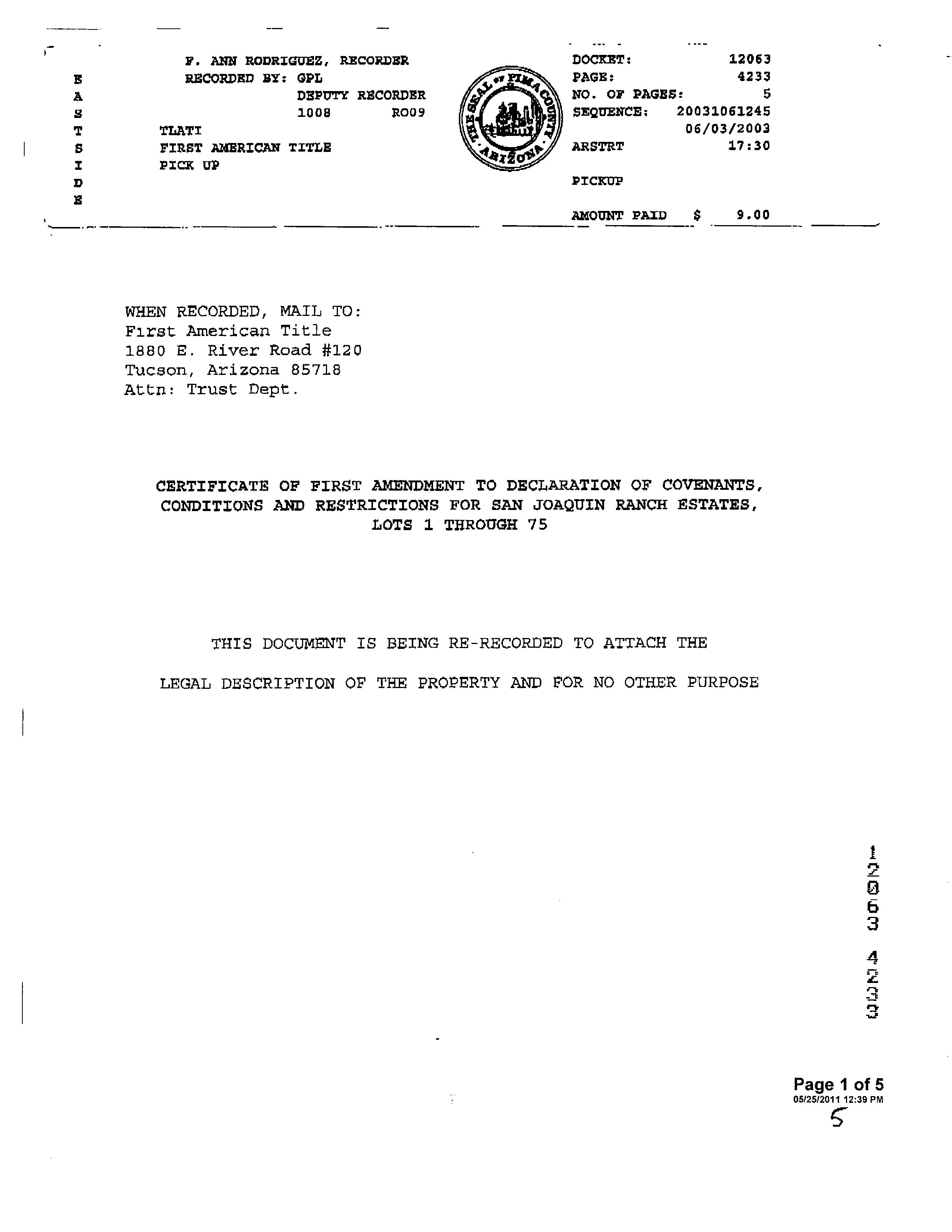 PREPARED FOR : First American Title Insurance Company, and the operating divisions thereof, make no express or implied warranty respecting the information presented and assume no responsibility for errors or omissions. First American, the eagle logo, First American Title, and firstam.com are registered trademarks or trademarks of First American Financial Corporation and/or its affiliates. 4495 North Via De La Granja Tucson, AZ 85718