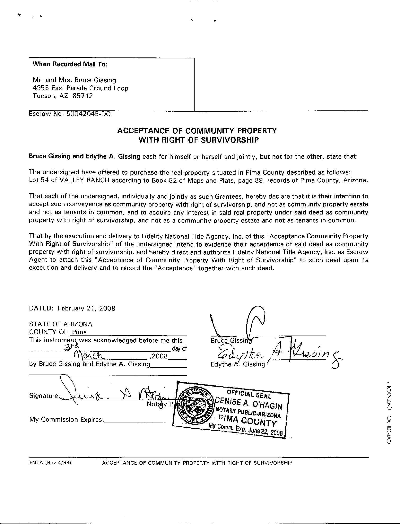 Subject Property : 4955 E Parade Ground Loop Tucson AZ 85712 Owner Information Owner Name : Gissing Mailing Address : 4729 E Sunrise Dr, Tucson AZ 85718-4534 C062 Vesting Codes : / / Revocable Trust Owner OccupiedIndicator : A Location Information Legal Description : Valley Ranch Lot 54 County : Pima, Az APN : 110-10-1790 Census Tract / Block : 29.06 / 1 Subdivision : Valley Ranch Township-Range- Sect : 13S-14E-35 Map Reference : 35-13S-14E Legal Book/Page : 52-89 School District : Tucson Unified Legal Lot : 54 Munic/Township : Tucson Unified Market Area : 50 Owner Transfer Information Recording/Sale Date : 11/25/2015 / 11/23/2015