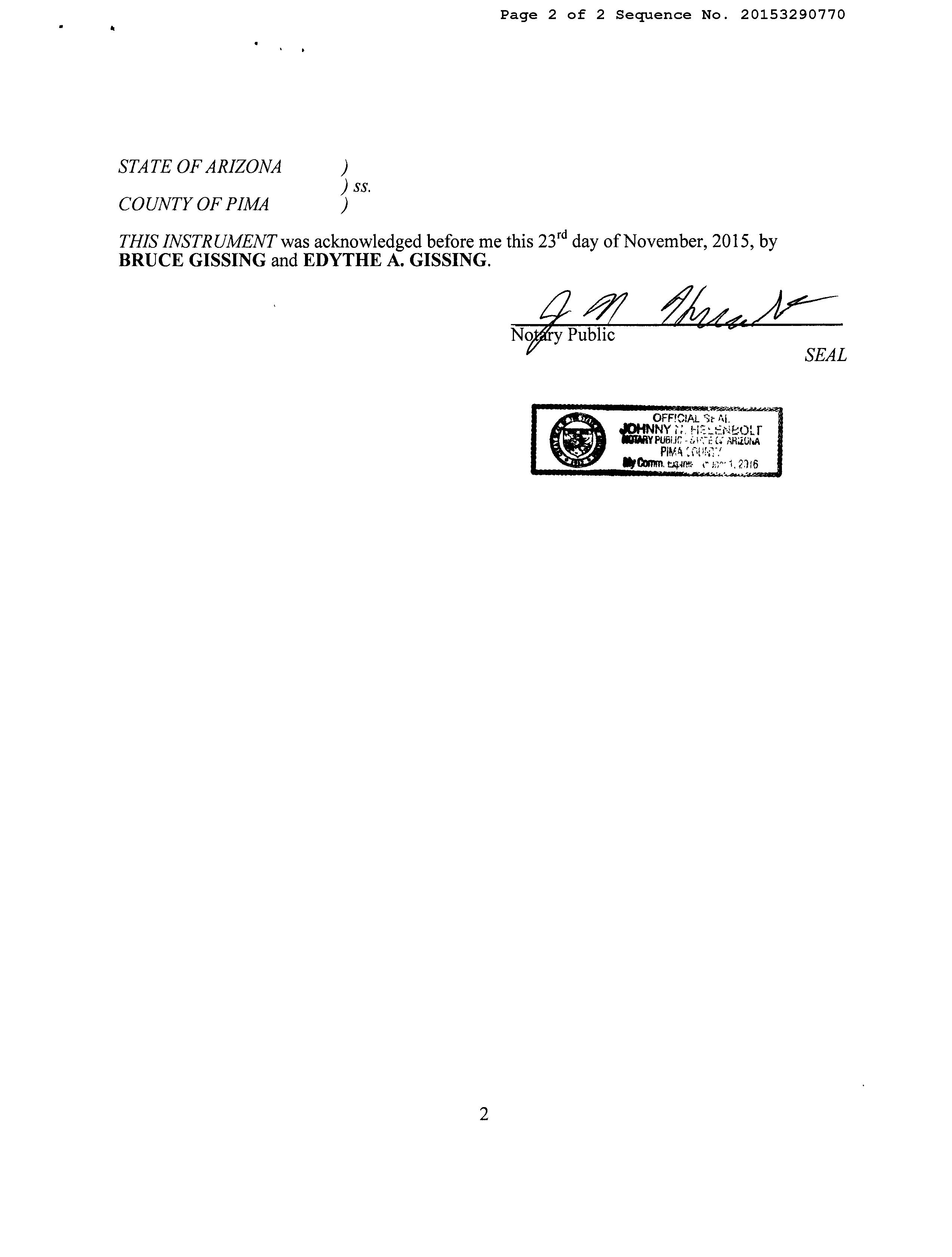 + FIRST AMERICAN TITLE, FC0, JSTI PIMA, AZ 08/30/2022 11:41AM R9C8 INVESTIGATIVE SEARCH RESULTS PAGE 1 OF 1 SEARCH PARAMETERS PARCEL: 110-10-1790 PARCEL: 110-10-1790 INSTRUMENT REC DATE OWNER: GISSING BRUCE & EDYTHE A CP/RS 13254 2560 03/03/2008 SITUS: 4955 E PARADE GROUND LP TUC MAIL: 4729 E SUNRISE DR PMB 382 TUCSON AZ 85718-4534 PLAT: LOT 00054 BLOCK LEGAL: VALLEY RANCH LOT 54 CURRENT TAXES INFORMATION THROUGH 07/28/2022 LAND IMPR EXEMPT RATE AREA SPECIAL DISTRICTS PRIMARY 50,568 0 0 11.6619 0150 SECONDARY 50 58,747 0 2.8778 2021 TOTAL TAX BILLED 6,512.02 2021 TAX AMT TAX DUE INTEREST DATE PAID TOTAL DUE FIRST HALF 3,256.01 0.00 0.00 09/16/2021 0.00 SECOND HALF 3,256.01 0.00 0.00 03/07/2022 0.00 TOTAL CURRENT TAXES DUE 08/22 0.00 09/22 0.00 IMPROVEMENTS BYPASS BLDG SQFT 3,010 FULL CASH VALUE 587,975 YEAR BUILT 2001 LAND USE 01 51 NUMBER OF STORIES 1.0 LOT SIZE 1 STDLT STORIES HEIGHT 0 SCHOOL DISTRICT 0150 EXTERIOR WALLS FRAME WOOD LAND FULL CASH VALUE 502 GRADE MATERIALS IMPR FULL CASH VALUE 587,473 SALES SALE DATE SALE AMOUNT INSTRUMENT TYPE SELLER NAME VALIDITY 03/03/2008 730,000 13254 2560 WD WEICHERT RELOCATION RESOUR 08/29/2003 592,000 12125 9430 D SAAVEDRA EDUARDO/VICKY P 12/13/2001 554,500 11695 3948 WD PARADE GROUND DEVELOPMENT 12/13/2001 485,000 11695 3947 SD CROMWELL PARTNERS LLC ADDITIONAL PROPERTY INFORMATION STANDARD LAND USE: SFR END SEARCH