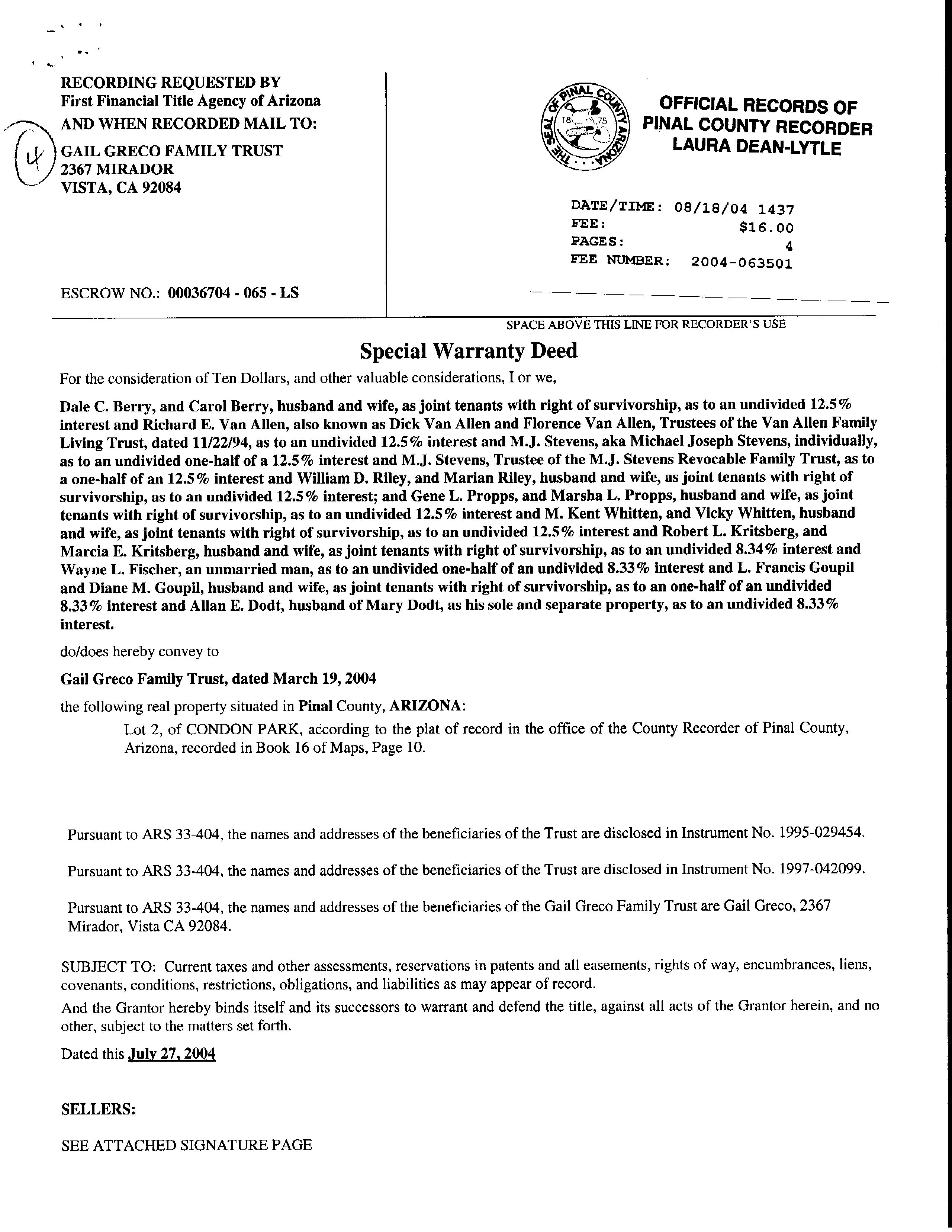 Subject Property : E Rodeo Rd Casa Grande AZ 85122 Owner Information Owner Name : Greco Gail Mailing Address : 2367 Mirador, Vista CA 92084-2833 C061 Vesting Codes : / / Trust Location Information Legal Description : Beg At Sw Cr Of Ne Ne Of Sec 8-6s-6e; Th N-650.3' Th E-30' To Pobth N-602.19' To Pt Of Curve Th Nely Along Curve 46.73' Th E-559.61' Th S-630' Th W-590.3' To Pob Sec 8-6s-6e 8.34 Ac County : Pinal, Az APN : 504-07-010C Census Tract / Block : 13.05 Subdivision : Condon Park Township-Range- Sect : 06S-06E-08 Map Reference : 0806S06E Legal Lot : 2 Last Market Sale Information Recording/Sale Date : 08/18/2004 / 07/00/2004 1st Mtg Amount/Type : $115,750 / Pp Sale Price : $215,750 1st Mtg Int. Rate/Type : / Fixed Rate Loan Document # : 63501 1st Mtg Document # : 63502 Deed Type : Warranty Deed Price Per SqFt : $0.59 Title Company : First Fin'l Title Agency Seller Name : Berry Dale C Prior Sale Information Prior Rec/Sale Date : 04/13/1990 / 04/13/1990 Prior Deed Type : Special Warranty Deed Prior Doc Number : 1669-439 Property Information Land Use : Vacant Land (nec) Lot Acres : 8.34 State Use : rurundetermined-Vac-NonSubd Zoning : UNDESIGNATED Lot Size : 363,290 Customer Name : Lisa Mrazek Customer Company Name : First American Title Insurance Company Prepared On : 08/31/2022 © 2022 CoreLogic. All rights reserved