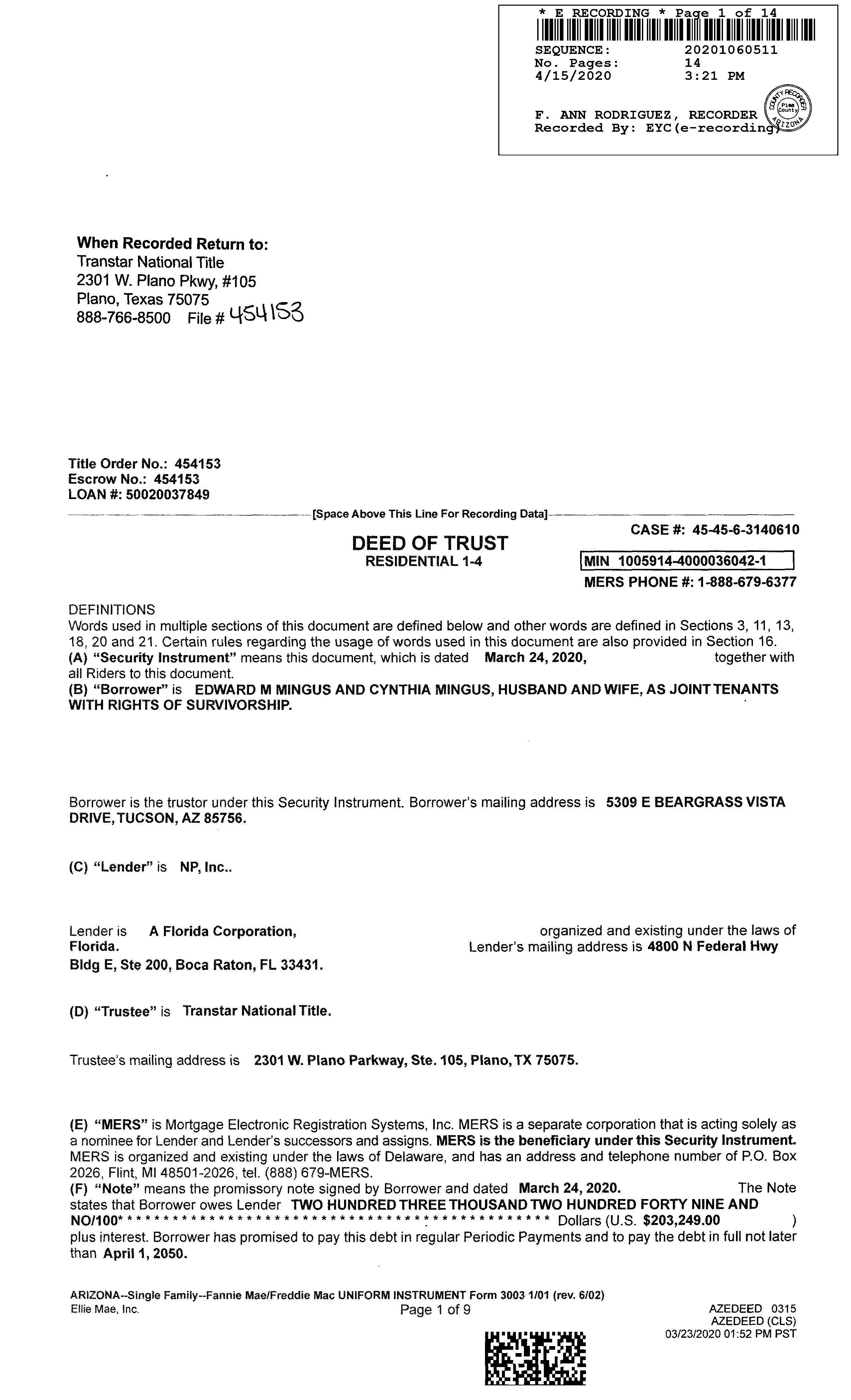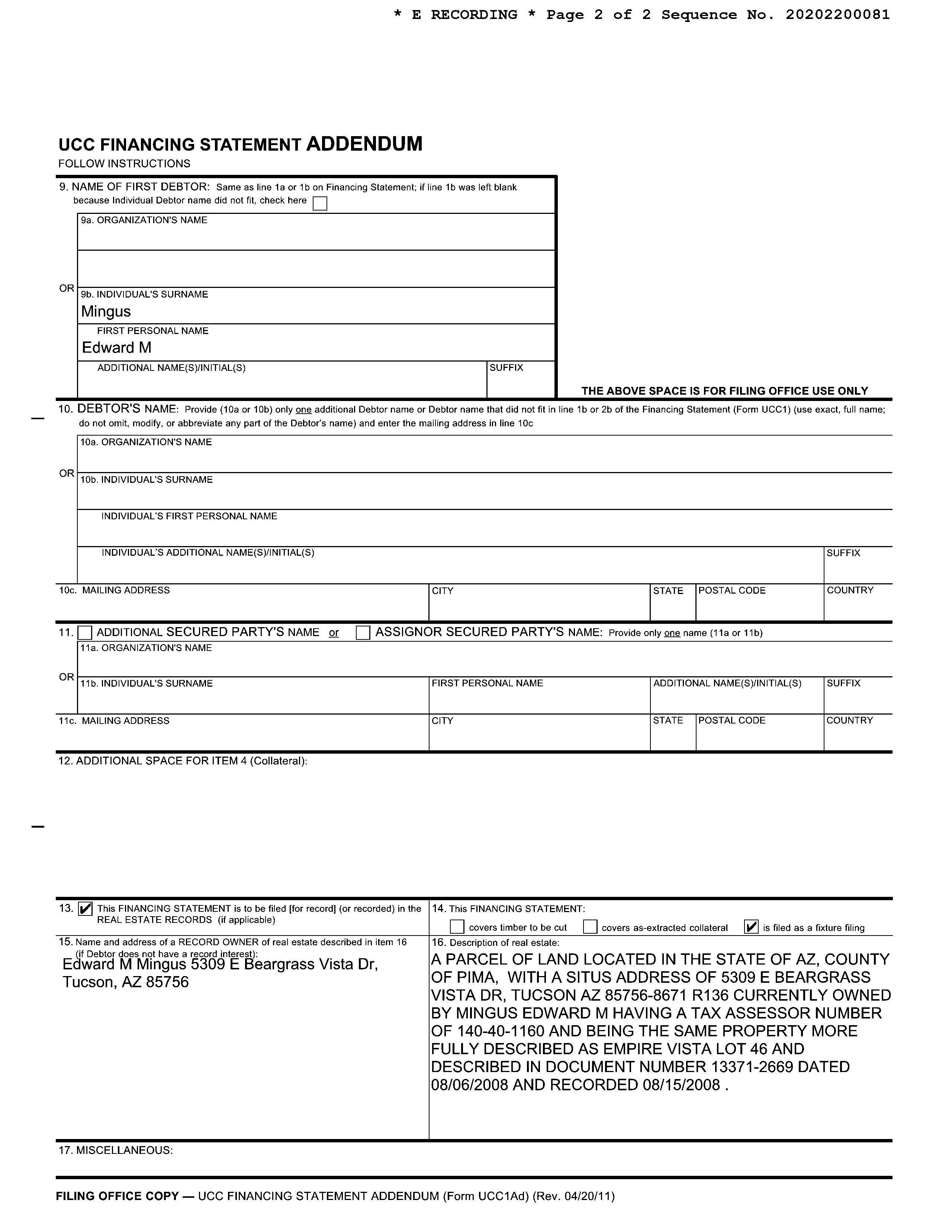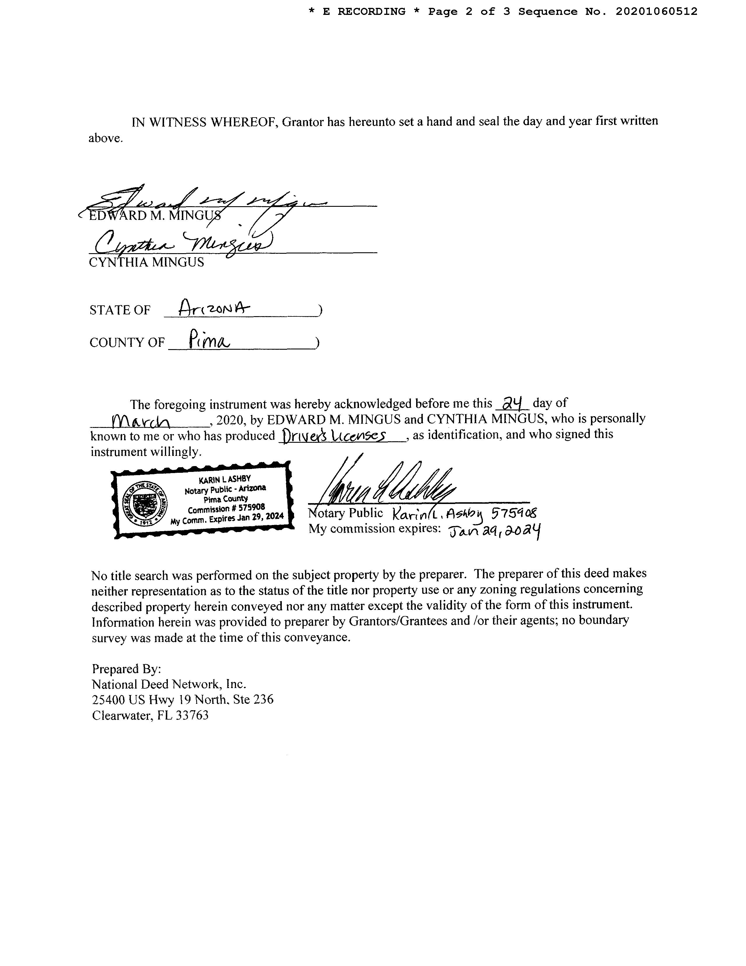 OWNER: MINGUS EDWARD M     13371 2669 08/15/2008  SITUS: 5309 E BEARGRASS VISTA DR TUC