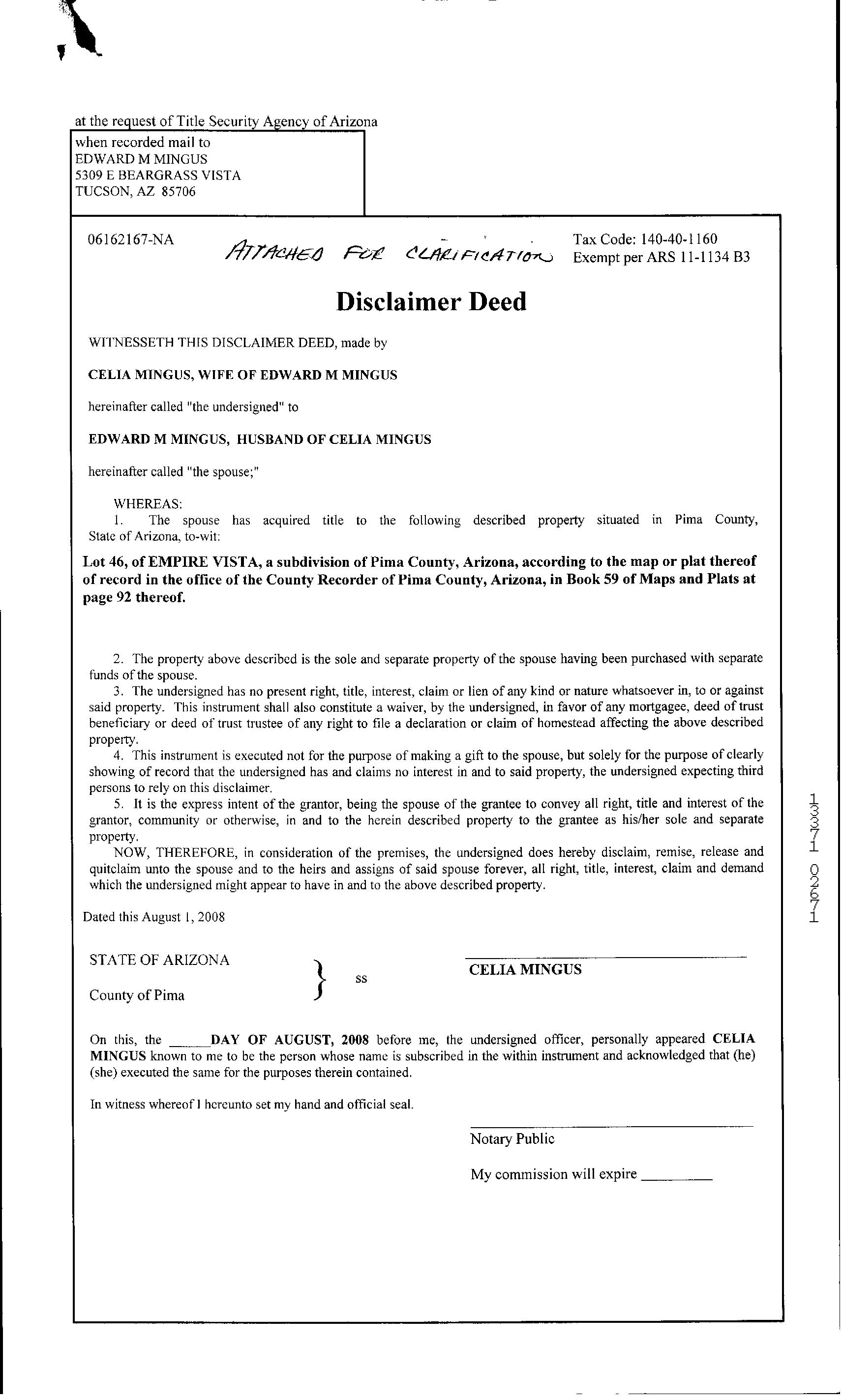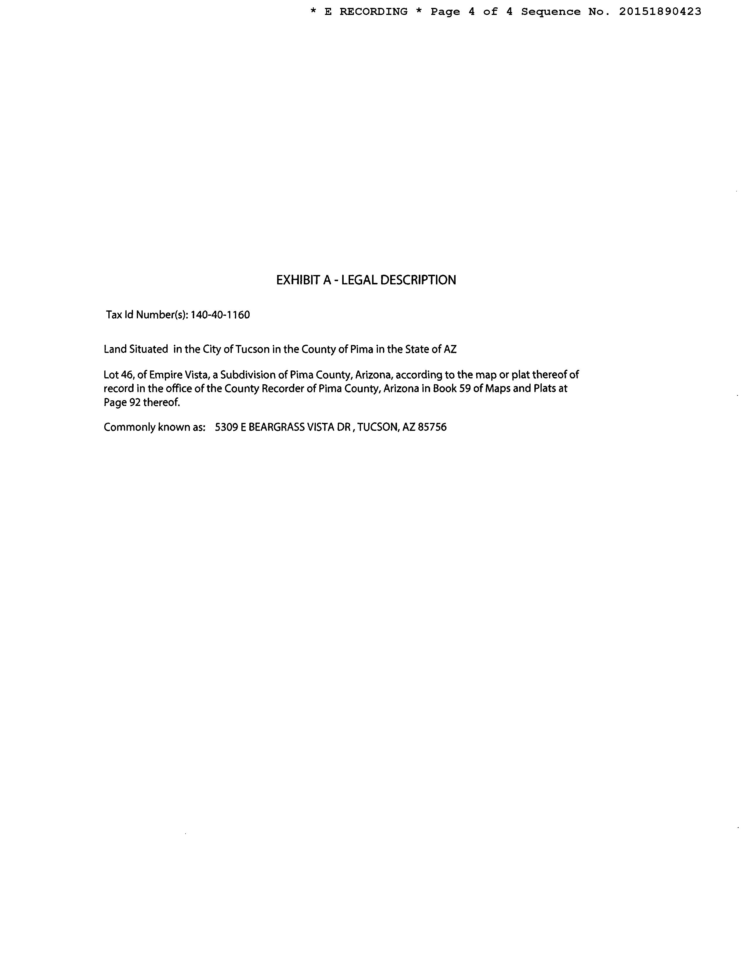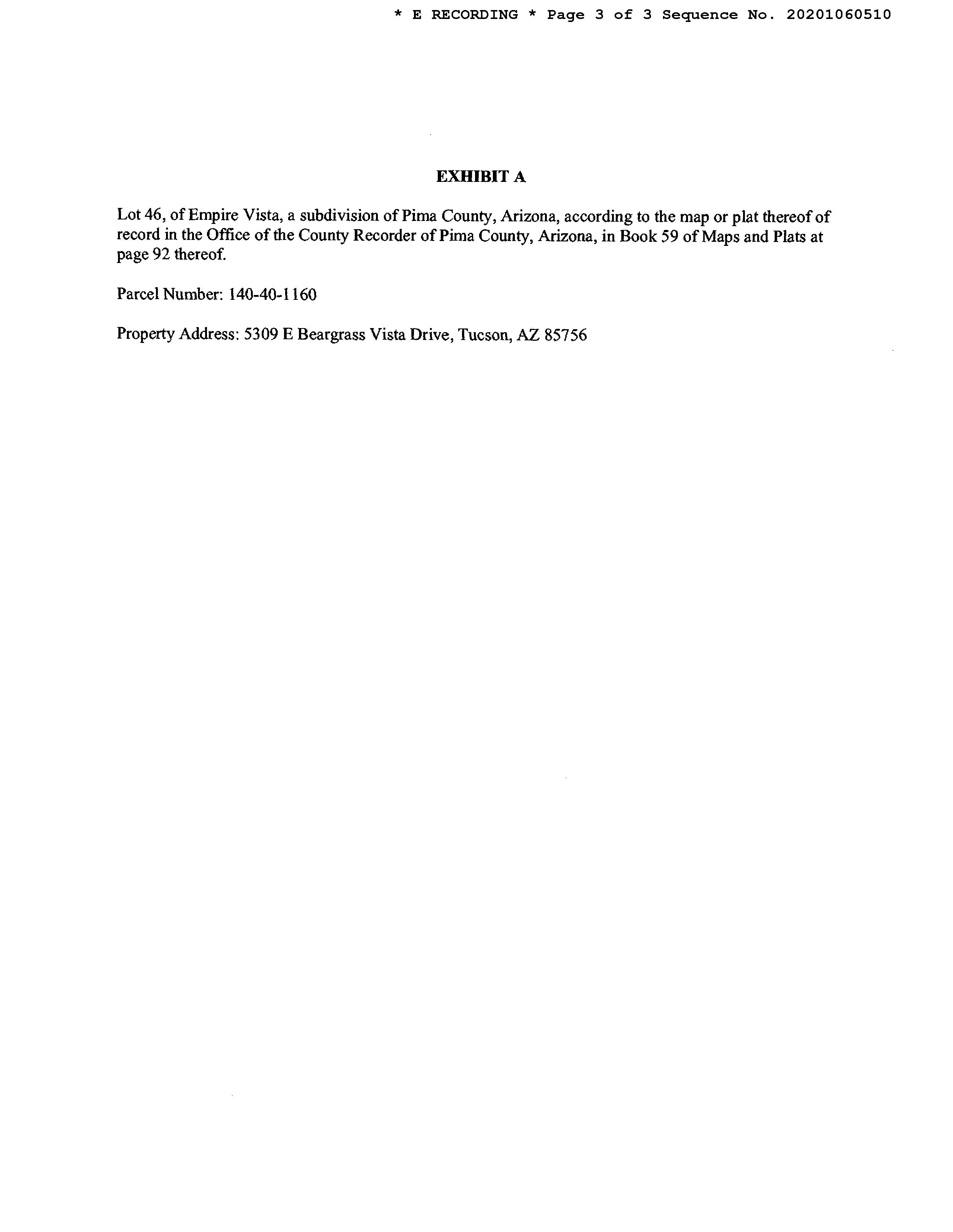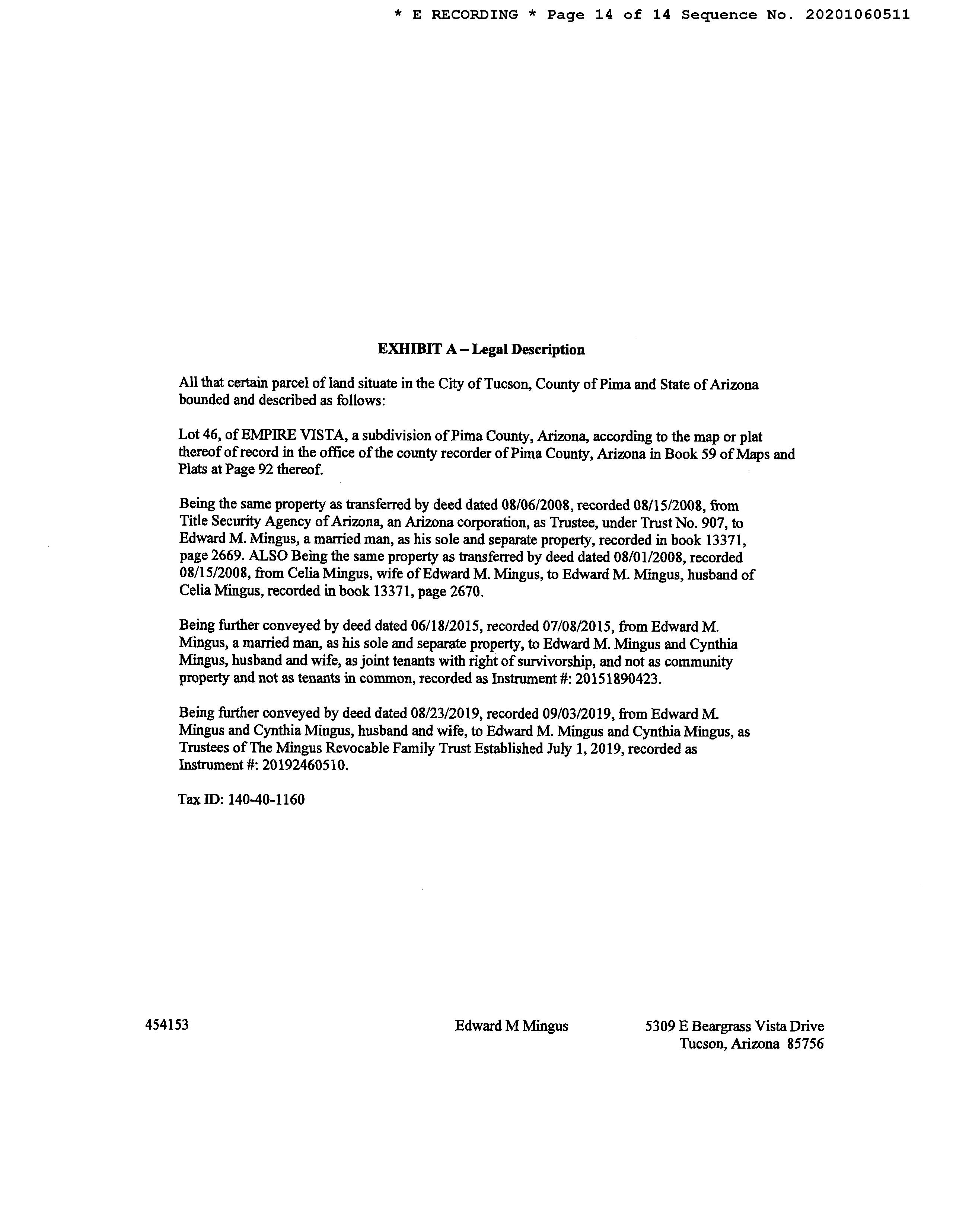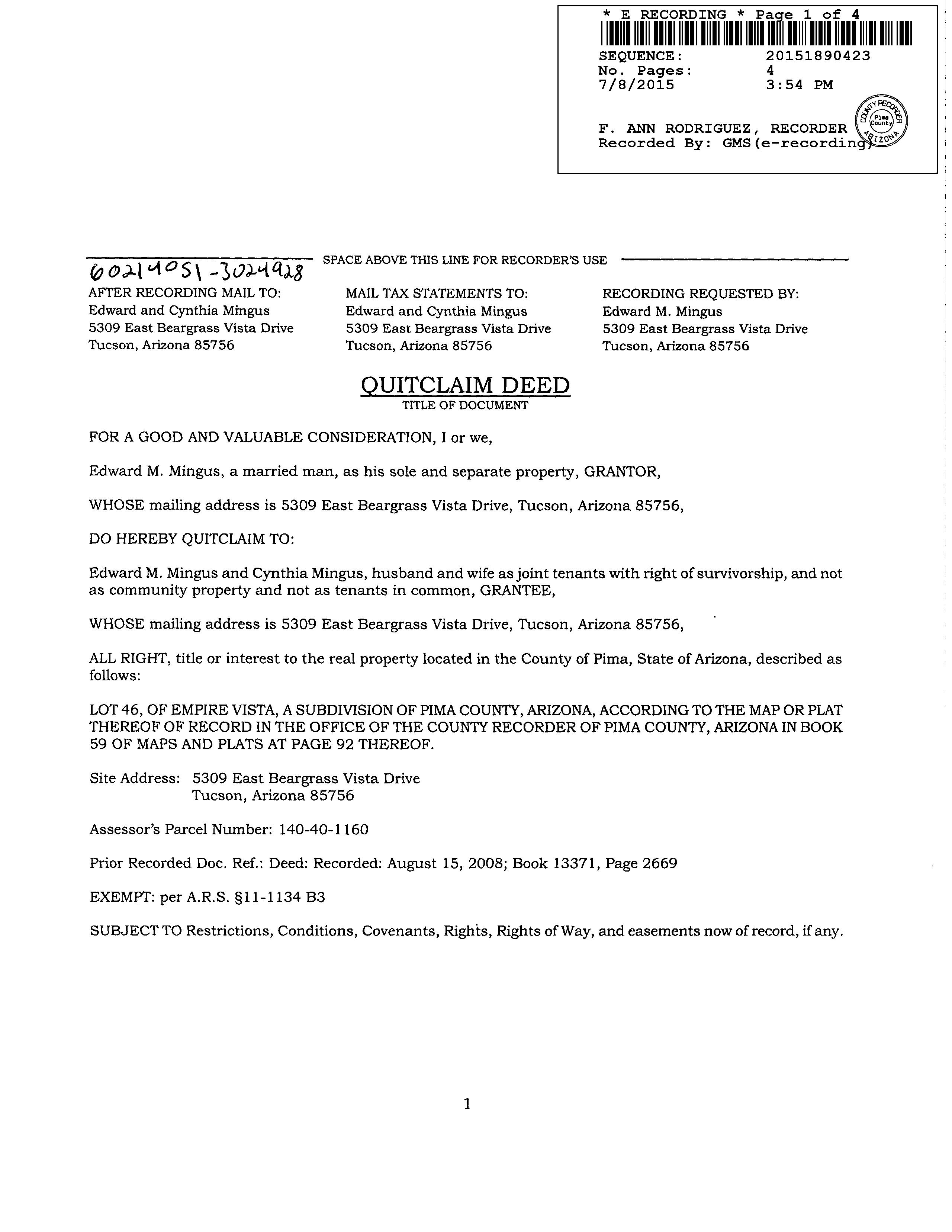OWNER: MINGUS EDWARD M 13371 2669 08/15/2008 SITUS: 5309 E BEARGRASS VISTA DR TUC