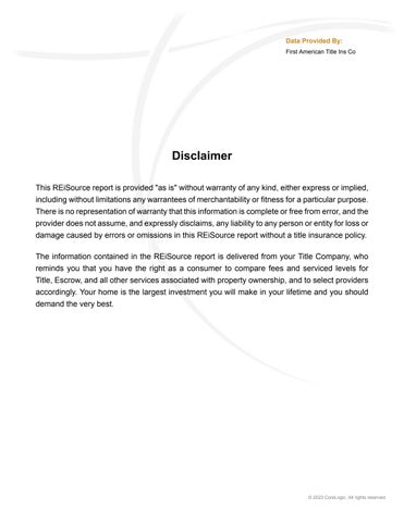 This REiSource report is provided "as is" without warranty of any kind, either express or implied, including without limitations any warrantees of merchantability or fitness for a particular purpose. There is no representation of warranty that this information is complete or free from error, and the provider does not assume, and expressly disclaims, any liability to any person or entity for loss or damage caused by errors or omissions in this REiSource report without a title insurance policy.
