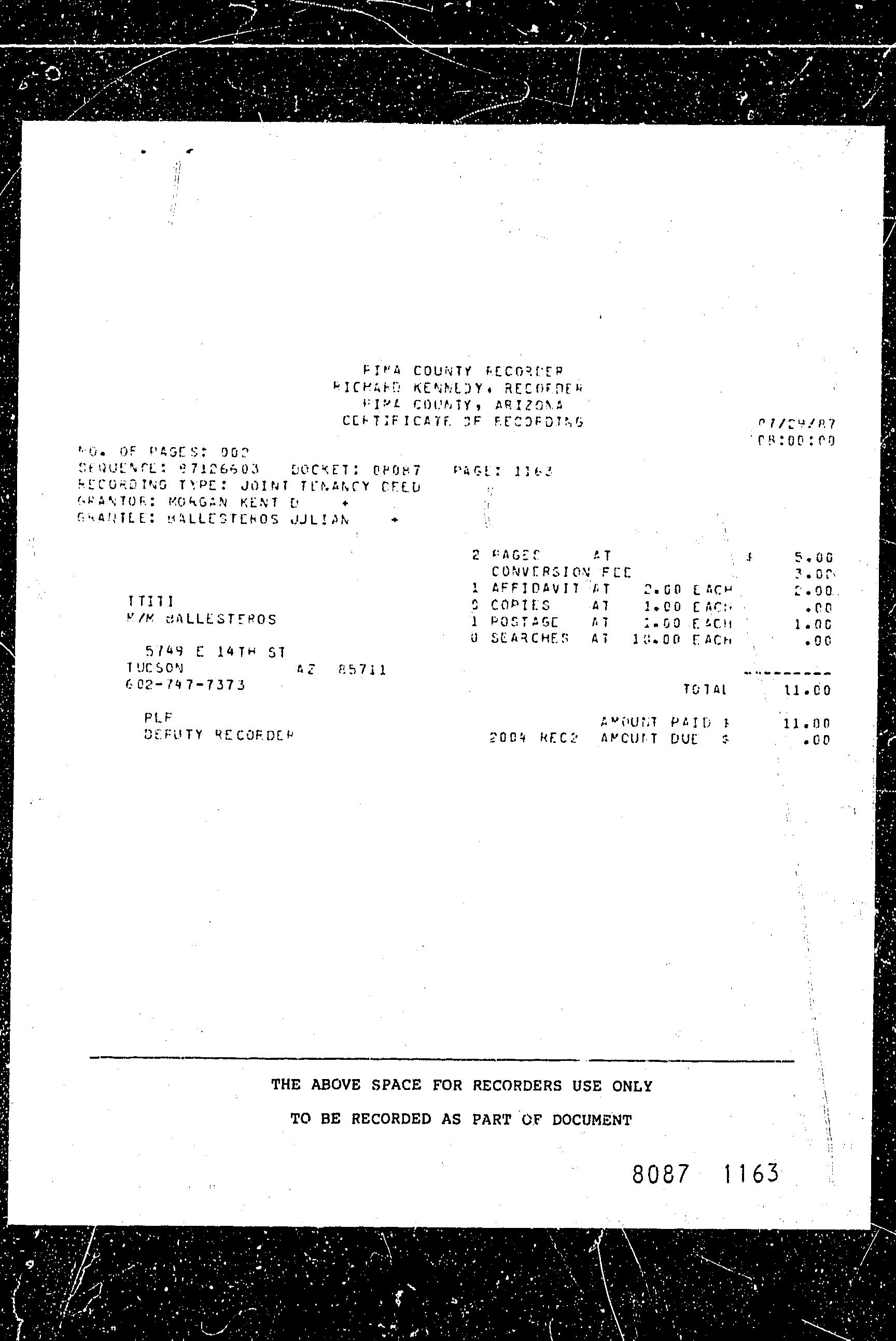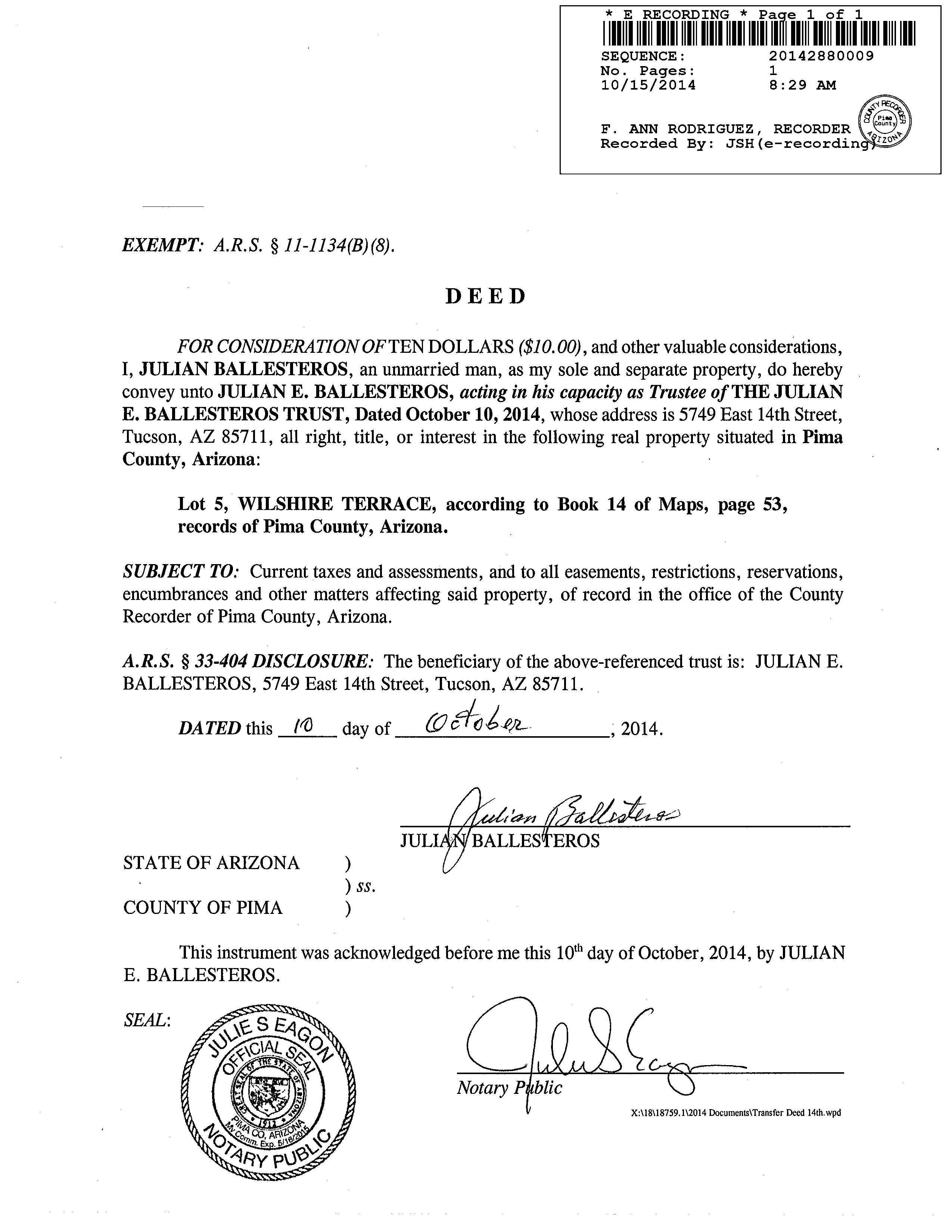 Owner Name : Ballesteros Julian E Mailing Address : 5749 E 14th St, Tucson AZ 85711-4504 C009