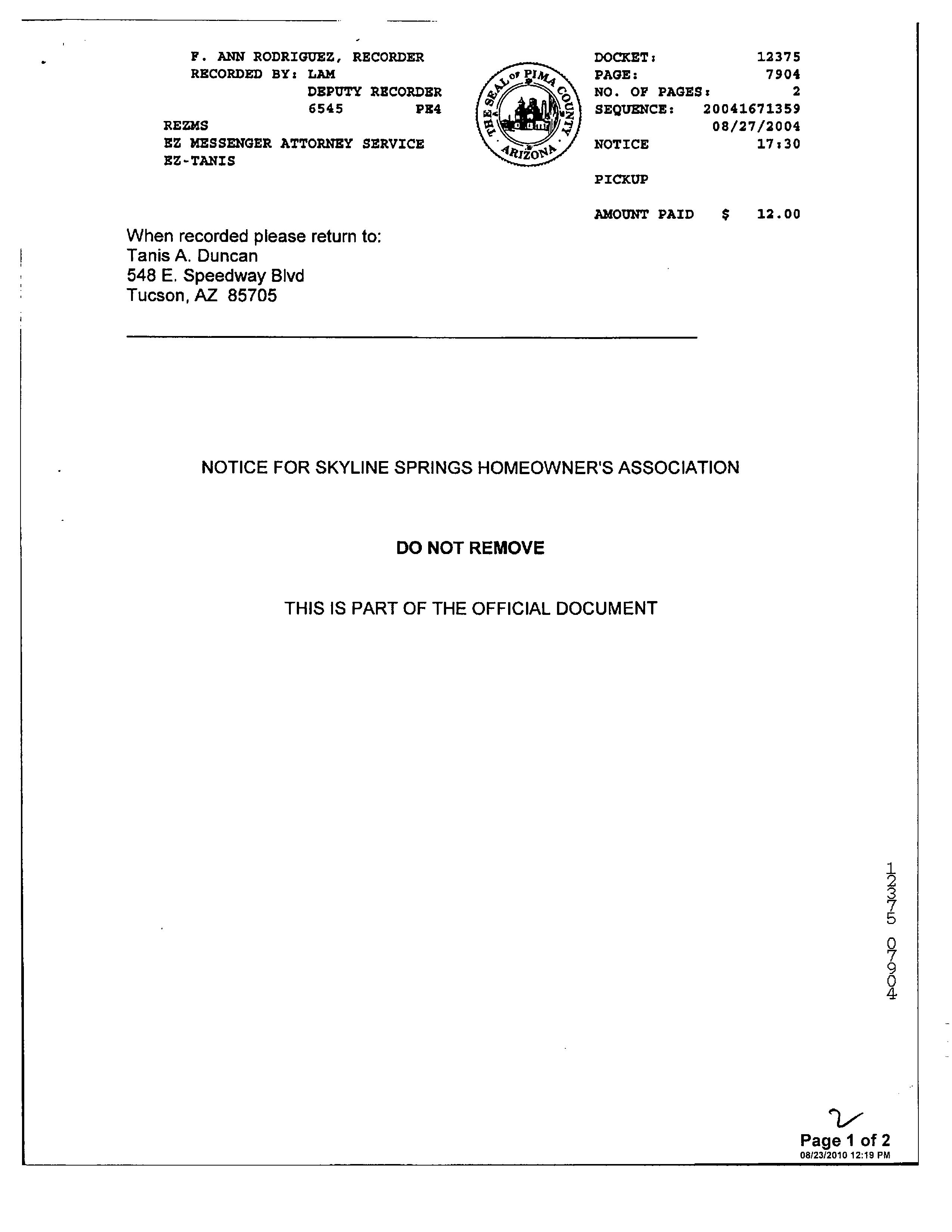 This report is not an insured product or service or a representation of the condition of title to real property. It is not an abst ract, legal opinion, opinion of title, title insurance commitment or preliminary report, or any form of Title Insurance or Guaranty. This report is issued exclusively for the benefit of the Applicant therefor and may not be used or relied upon by any other person. This report may not be reproduced in any manner without First American or Title Security's prior written consent. First American or Title Security does not represent or warrant that the information herein is complete or free from error, and the information herein is provided without any warranties of any kind, as-is, and with all faults. As a material part of the consideration given in exchange for the issuance of this report, recipient agrees that First American or Title Security's sole liability for any loss or damage caused by an error or omission due to inaccurate information or negligence in preparing this report shall be limited to the fee charged for the report. Recipient accepts this report with this limitation and agrees that First American or Title Security would not have issued this report but for the limitation of liability described above. First American or Title Security makes no representation or warranty as to the legality or propriety of recipient's use of the information herein.