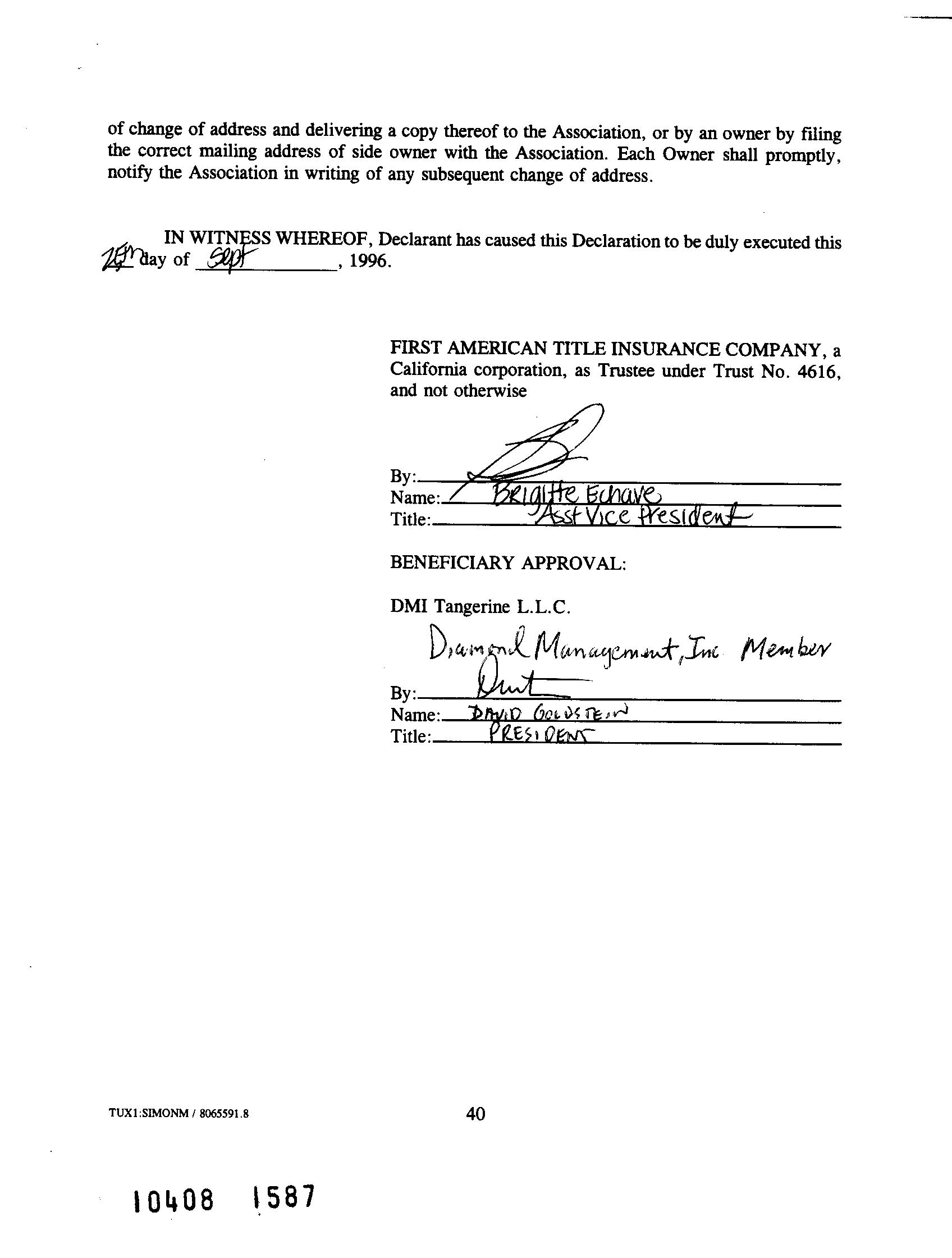 IMPORTANT -- PLEASE READ CAREFULLY: This report is not an insured product or service or a representation of the condition of title to real property. It is not an abst ract, legal opinion, opinion of title, title insurance commitment or preliminary report, or any form of Title Insurance or Guaranty. This report is issued exclusively for the benefit of the Applicant therefor and may not be used or relied upon by any other person. This report may not be reproduced in any manner without First American or Title Security's prior written consent. First American or Title Security does not represent or warrant that the information herein is complete or free from error, and the information herein is provided without any warranties of any kind, as-is, and with all faults. As a material part of the consideration given in exchange for the issuance of this report, recipient agrees that First American or Title Security's sole liability for any loss or damage caused by an error or omission due to inaccurate information or negligence in preparing this report shall be limited to the fee charged for the report. Recipient accepts this report with this limitation and agrees that First American or Title Security would not have issued this report but for the limitation of liability described above. First American or Title Security makes no representation or warranty as to the legality or propriety of recipient's use of the information herein.