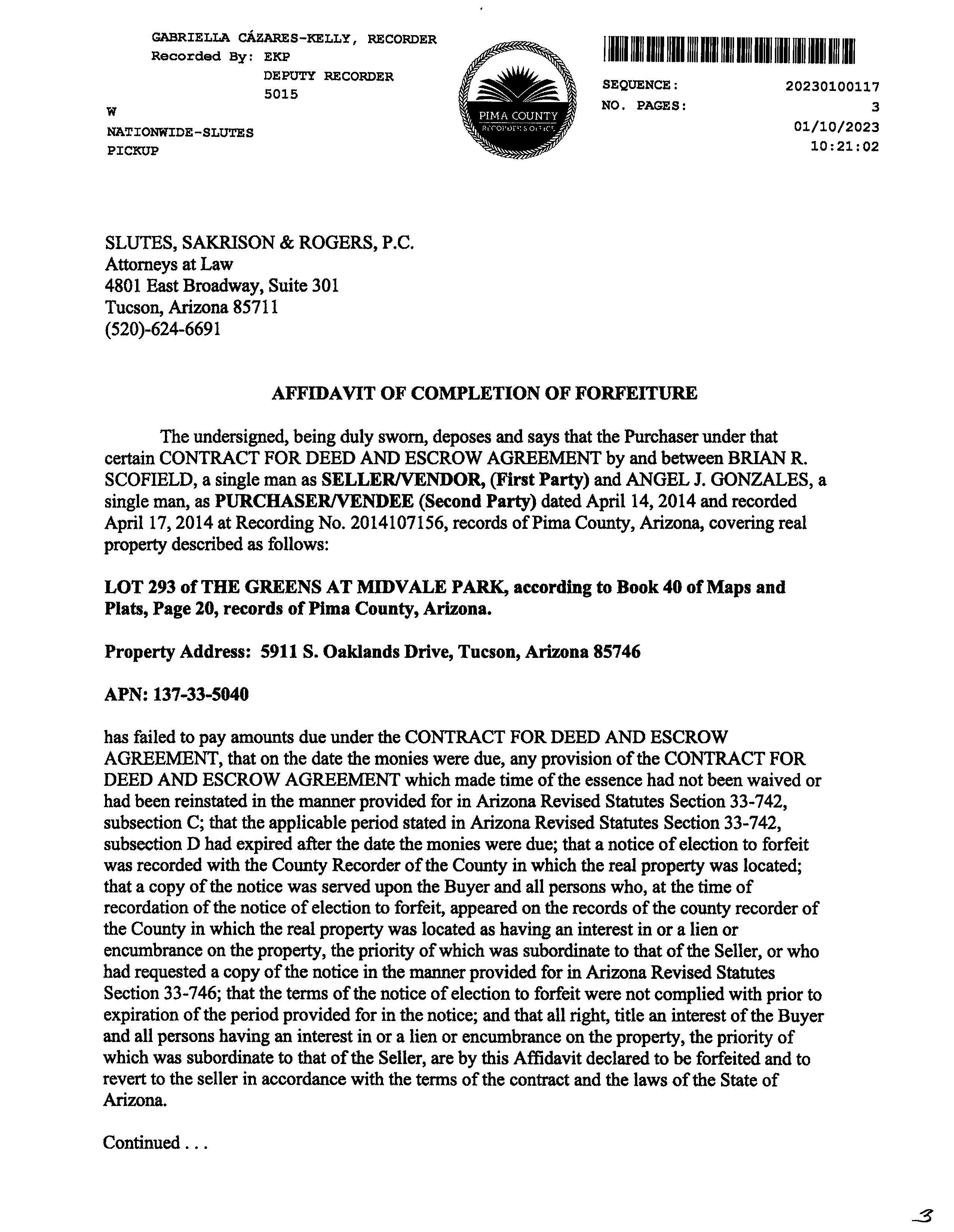 OWNER: SCOFIELD BRIAN R 11021 2028 04/08/1999 PURCHASER: GONZALEZ ANGEL J AFFIDAVIT 2014 1070156 04/17/2014 SITUS: 5911 S OAKLANDS DR TUC MAIL: PO BOX 30845 MESA AZ 85275 PLAT: LOT 00293 BLOCK LEGAL: GREENS AT MIDVALE (THE) LOT 293 CURRENT TAXES INFORMATION THROUGH 12/28/2022