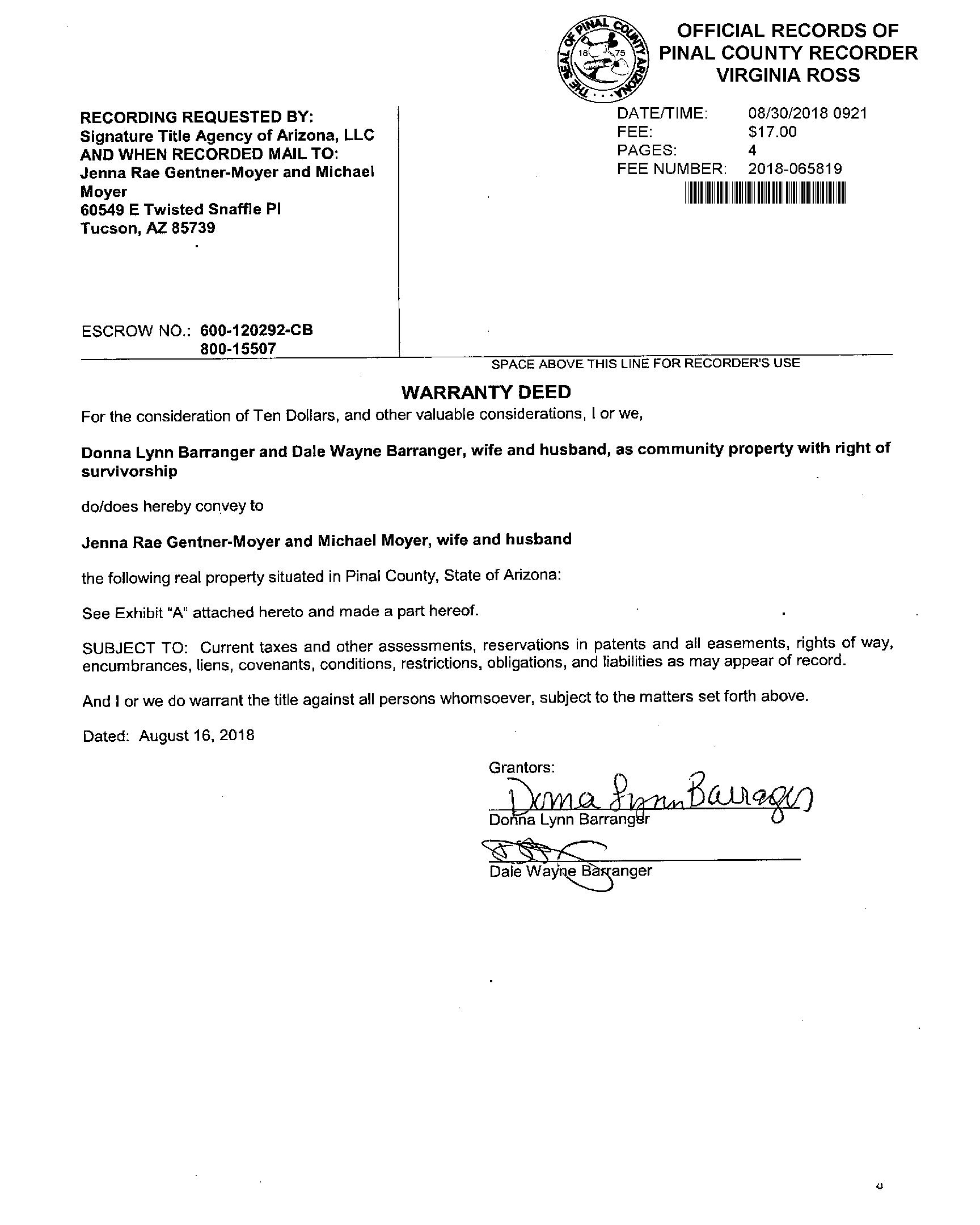 Owner Name: Gentner-moyer Jenna Rae /Moyer Michael Jon APN / Alternate APN: 305-93-349 / Deed Type: Warranty Deed Land Use: Sfr Subdivision / Tract: Eagle Crest Ranch 02 / Lot Size: 7,986 Year Built / Eff: 2004 / Rec. Date / Price: 03/09/2015 / $279,300 Living Area: 2,601 # of units: Document #: 14432 Bedrooms: Pool: Total Tax Value: $209,776 Bath(F/H): / #1 39532 S Cinch Strap Pl Tucson Az 85739