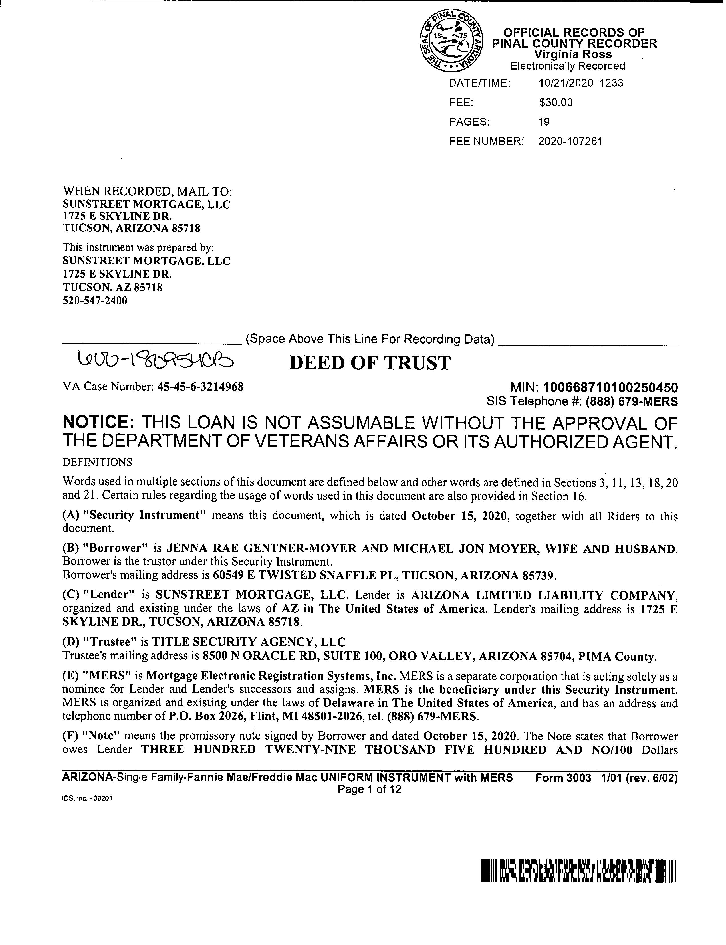 Subject Property : 60549 E Twisted Snaffle Pl Tucson AZ 85739 Owner Information Owner Name : Gentner-moyer Jenna Rae / Moyer Michael Jon Mailing Address : 60549 E Twisted Snaffle Pl, Tucson AZ 85739-2317 R087 Owner OccupiedIndicator : O Location Information Legal Description : Eagle Crest Ranch Ii Lot 348 Sec 32-10s-14e 7986 Sq Ft 0.18 Ac County : Pinal, Az APN : 305-93-349 Census Tract / Block : 6.03 / 2 Subdivision : Eagle Crest Ranch 02 Township-Range- Sect : 10S-14E-32 Map Reference : 3210S14E Legal Lot : 348 Owner Transfer Information Recording/Sale Date : 10/21/2020 / 10/15/2020 Deed Type : Warranty Deed Document # : 107260 1st Mtg Document # : 107261 Last Market Sale Information Recording/Sale Date : 03/09/2015 / 03/03/2015 1st Mtg Amount/Type : $274,240 / Cnv Sale Price : $279,300 1st Mtg Document # : 14433 Document # : 14432 1st Mtg Term : 30 Deed Type : Warranty Deed Price Per SqFt : $107.38 Title Company : Signature Title Agency Corp Lender : Nova Fin'l & Inv Corp Seller Name : Roberts Stuart & Heidi Prior Sale Information Prior Rec/Sale Date : 01/27/2010 / 01/19/2010 Prior Doc Number : 7752 Prior Sale Price : $165,000 Prior Deed Type : Special Warranty Deed Customer Name : Jeremiah Stiffler Customer Company Name : First American Prepared On : 09/06/2022 © 2022 CoreLogic. All rights reserved