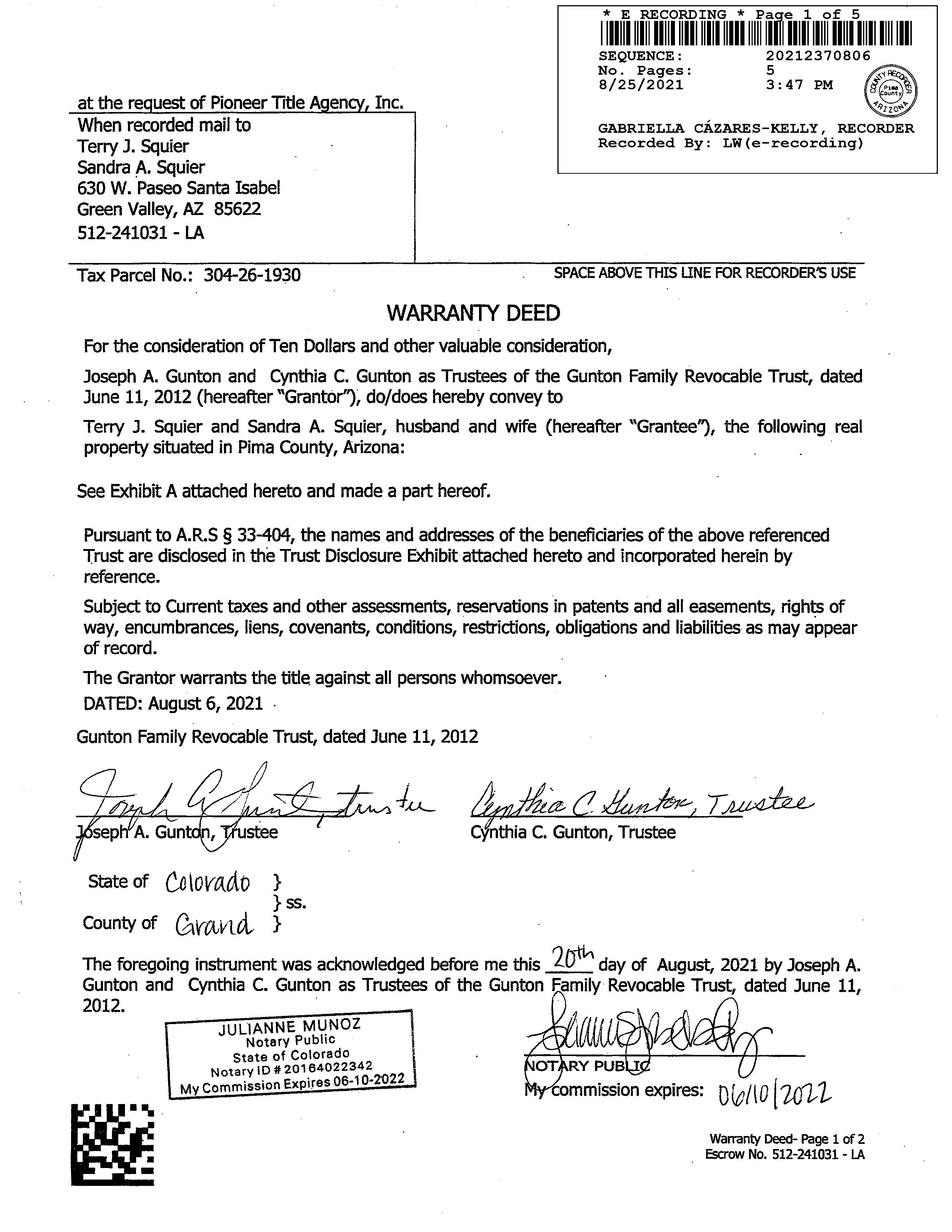 Owner Name: Squier T J & S A Living Trust / APN / Alternate APN: 304-26-1930 / Deed Type: Warranty Deed Land Use: Sfr Subdivision / Tract: Green Valley Foothills 02 / Lot Size: 195,168 Year Built / Eff: 2006 /