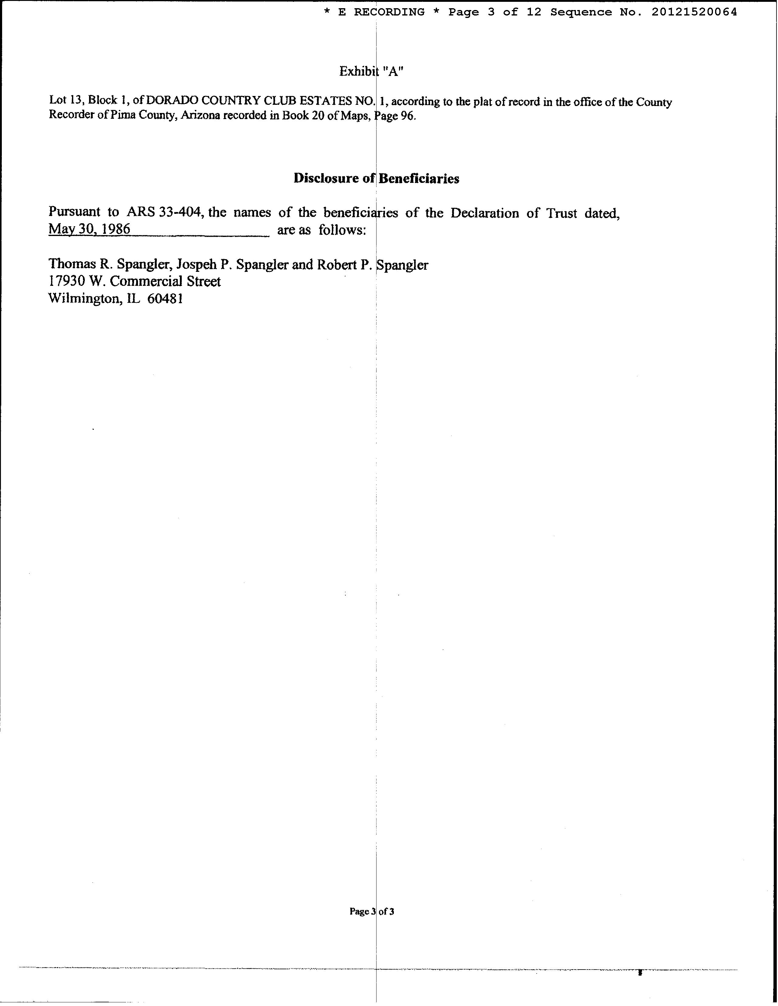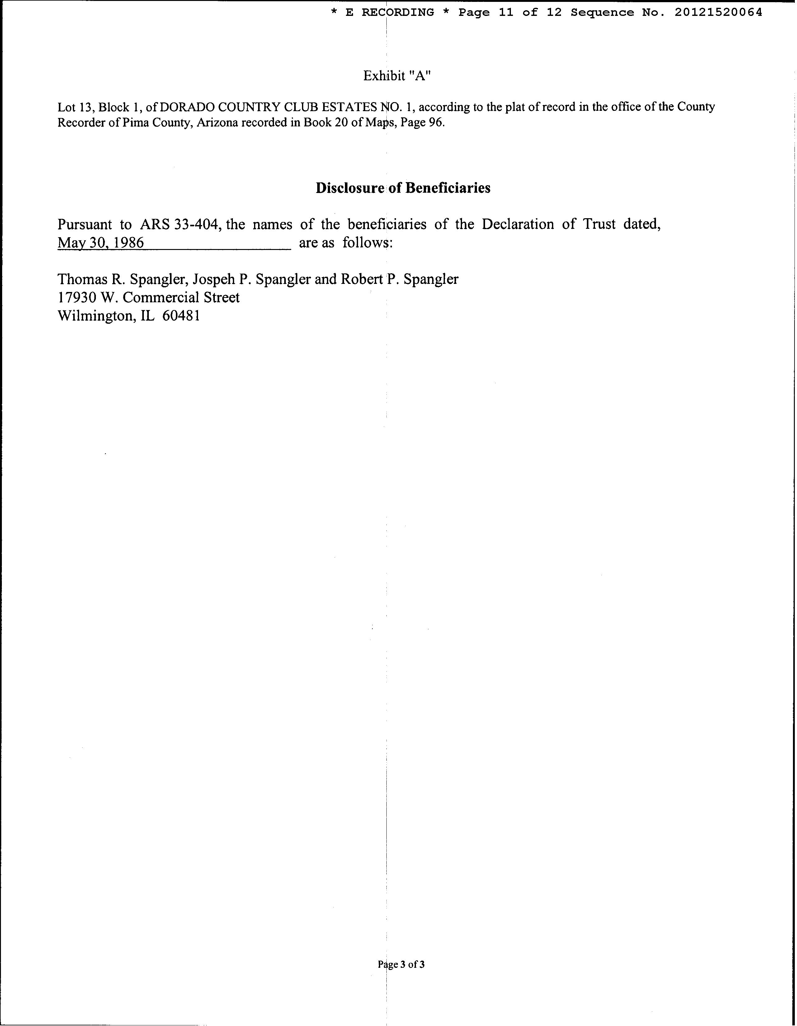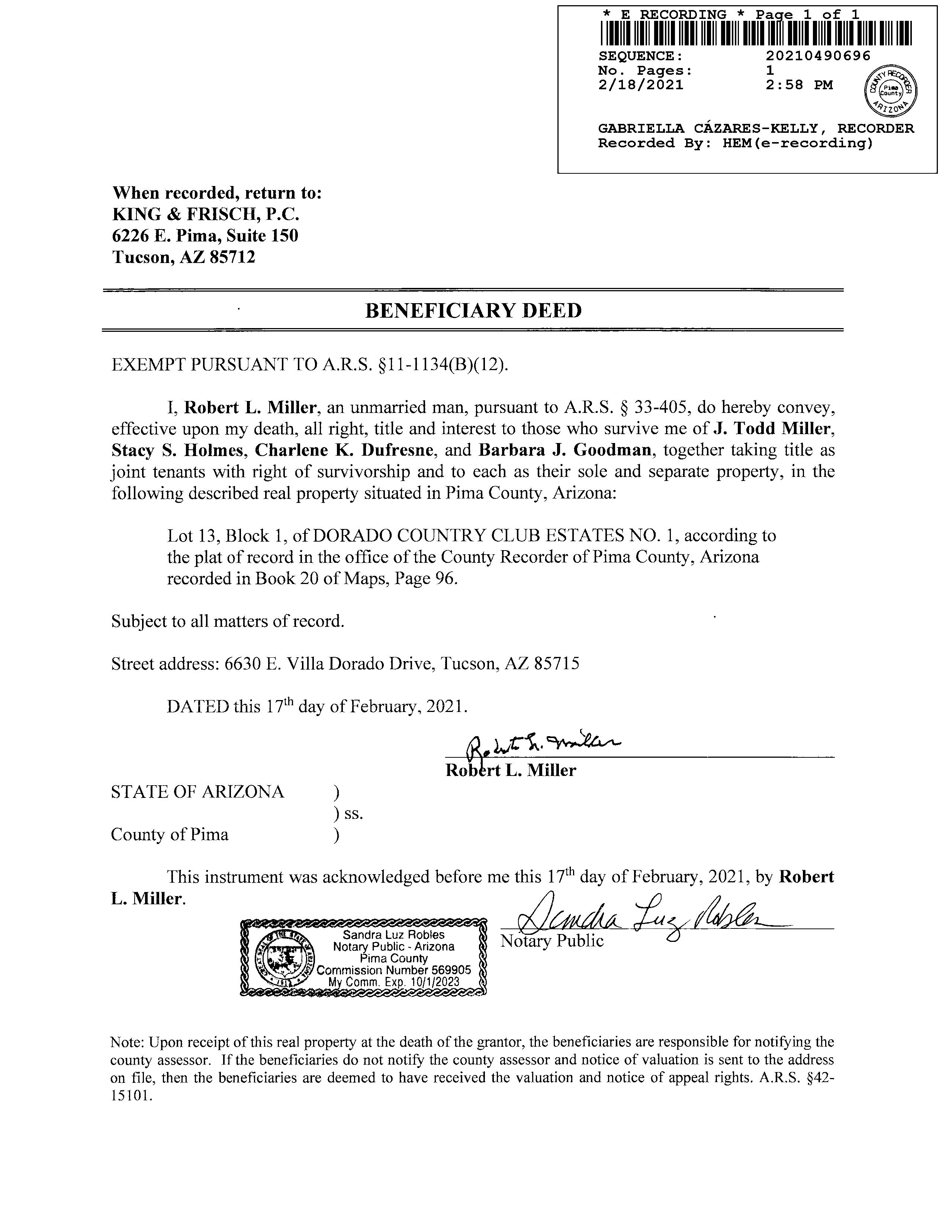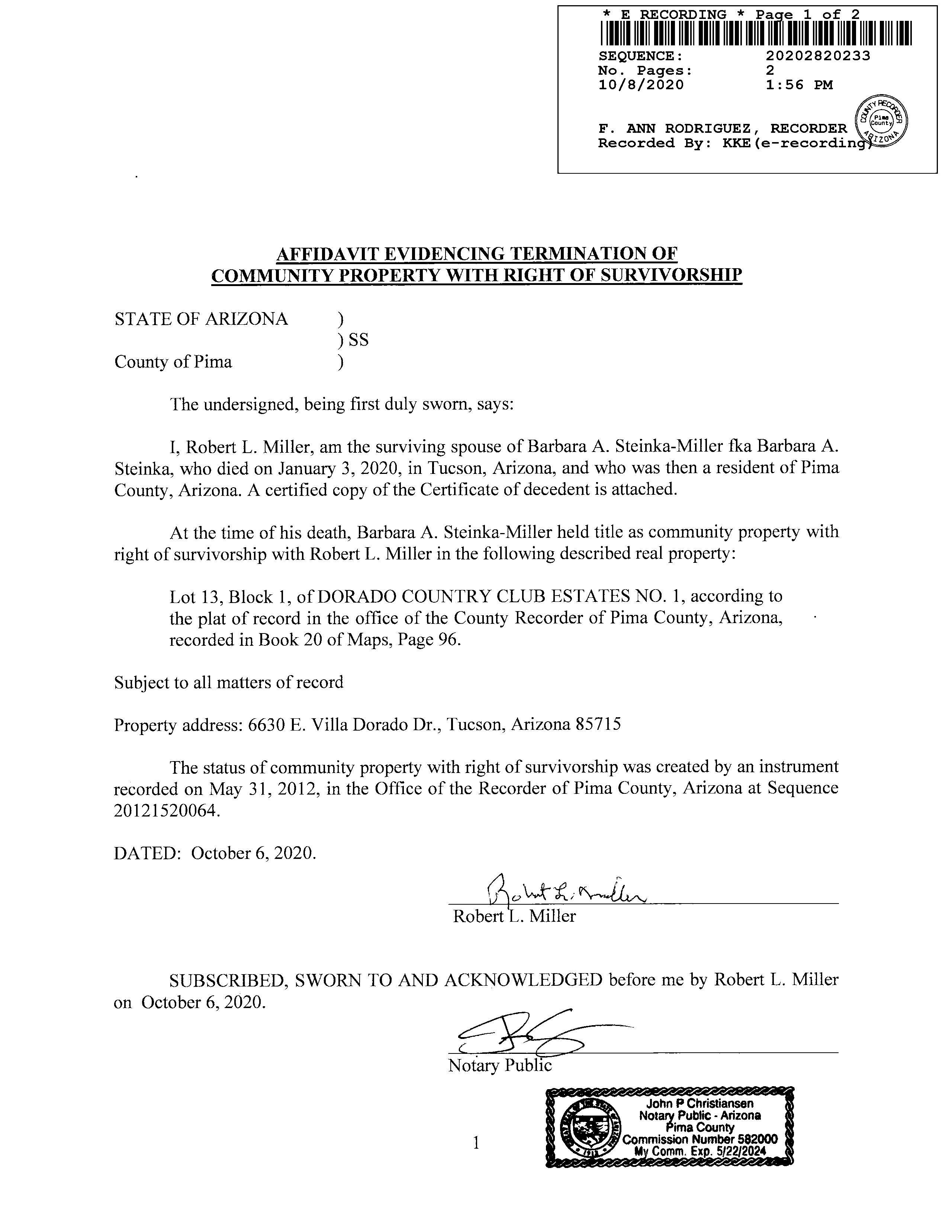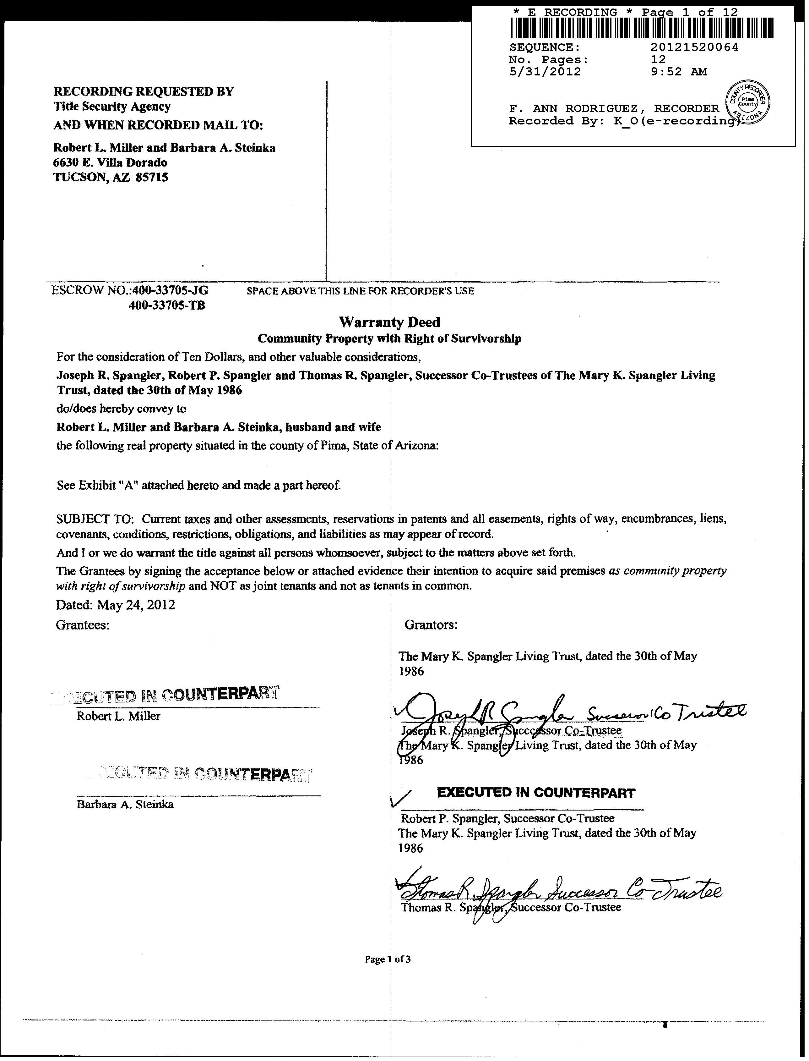 Subject Property : 6630 E Villa Dorado Dr Tucson AZ 85715 Owner Information Owner Name : Miller Robert L Mailing Address : 6630 E Villa Dorado Dr, Tucson AZ 85715-4725 C038 Vesting Codes : / / Community Property Owner OccupiedIndicator : O Location Information Legal Description : Dorado Country Club Estates No 1 Lot 13 Blk 1 County : Pima, Az Market Area : 80 Census Tract / Block : 40.67 / 1 APN : 133-14-0150 Township-Range- Sect : 14S-15E-6 Subdivision : Dorado Country Club Estates Legal Book/Page : 20-96 Map Reference : 06-14S-15E Legal Lot : 13 School District : Tucson Unified Legal Block : 1 Munic/Township : Tucson Unified Last Market Sale Information Recording/Sale Date : 05/31/2012 / 05/24/2012 1st Mtg Amount/Type : $152,884 / Va Sale Price : $148,000 1st Mtg Document # : 1520065 Document # : 1520064 1st Mtg Term : 30 Deed Type : Warranty Deed Price Per SqFt : $97.37 Title Company : Title Security Inc Lender : Vip Mtg Seller Name : Spangler M K Living Trust Prior Sale Information Prior Rec/Sale Date : 06/17/1986 Prior Deed Type : Deed (reg) Prior Doc Number : 7807-2007 Customer Name : Lisa Mrazek Customer Company Name : First American Title Insurance Company Prepared On : 08/26/2022 © 2022 CoreLogic. All rights reserved