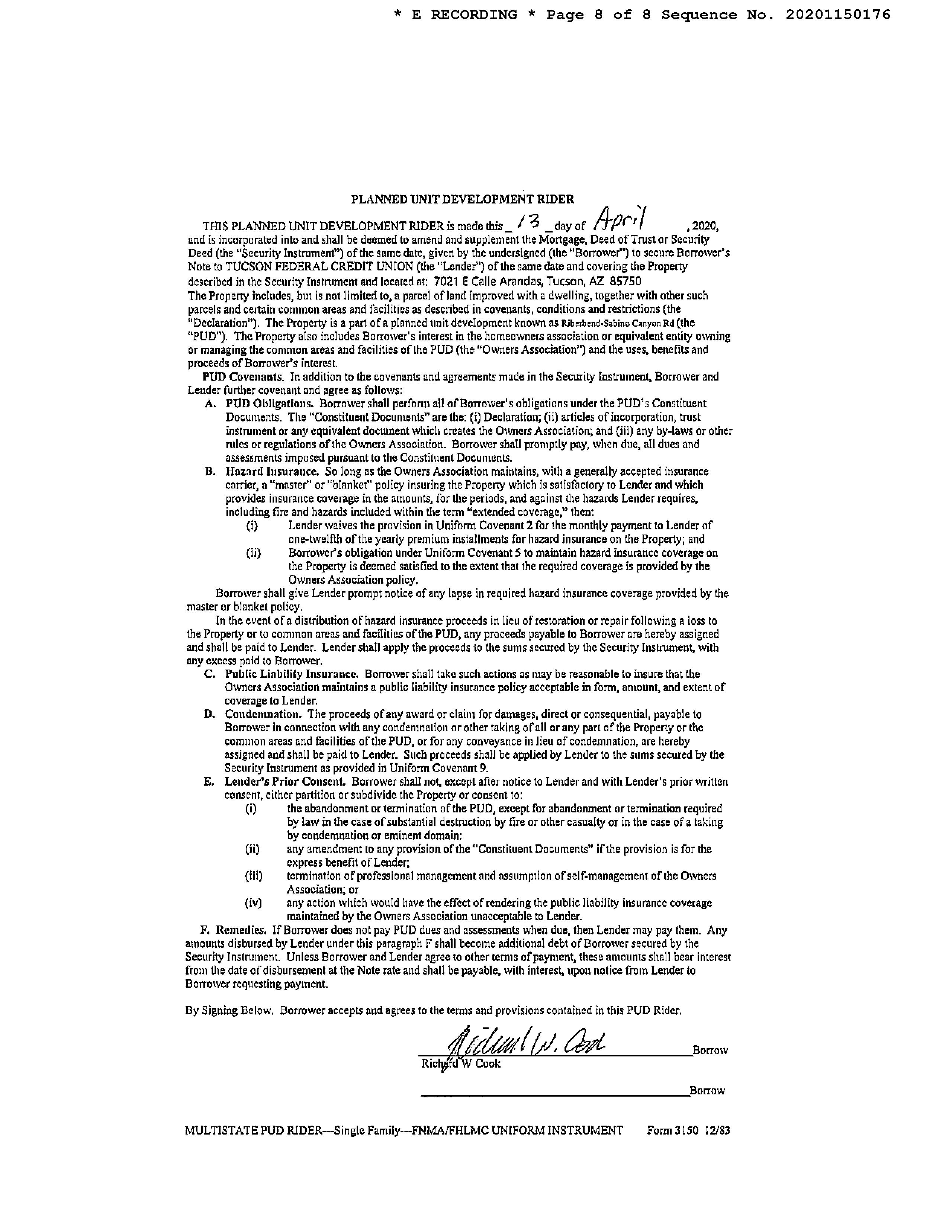 Subject Property : 7021 E Calle Arandas Tucson AZ 85750 Owner Information Owner Name : Cook Richard W Mailing Address : 7021 E Calle Arandas, Tucson AZ 85750-2546 C039 Owner OccupiedIndicator : O Location Information Legal Description : Riverbend-sabino Canyon Rd Amended (townhouses) Lot 6 County : Pima, Az APN : 114-35-1140 Census Tract / Block : 47.21 / 1 Subdivision : Riverbend Sabino Canyon Road Amd Township-Range- Sect : 13S-15E-30 Map Reference : 30-13S-15E Legal Book/Page : 36-21 School District : Tucson Unified Legal Lot : 6 Munic/Township : Tucson Unified Market Area : 12 Last Market Sale Information Recording/Sale Date : 04/06/2015 / 03/25/2015 1st Mtg Amount/Type : $206,250 / Cnv Sale Price : $275,000 1st Mtg Document # : 960549 Document # : 960548 1st Mtg Term : 30 Deed Type : Warranty Deed Price Per SqFt : $123.37 Title Company : Stewart Title & Tr/tucson Lender : Nova Fin'l & Inv Corp Seller Name : Oleary Emmit Prior Sale Information Prior Rec/Sale Date : 05/20/1992 Prior Deed Type : Deed (reg) Prior Doc Number : 9295-1722 Customer Name : Jeremiah Stiffler Customer Company Name : First American Prepared On : 08/12/2022 © 2022 CoreLogic. All rights reserved