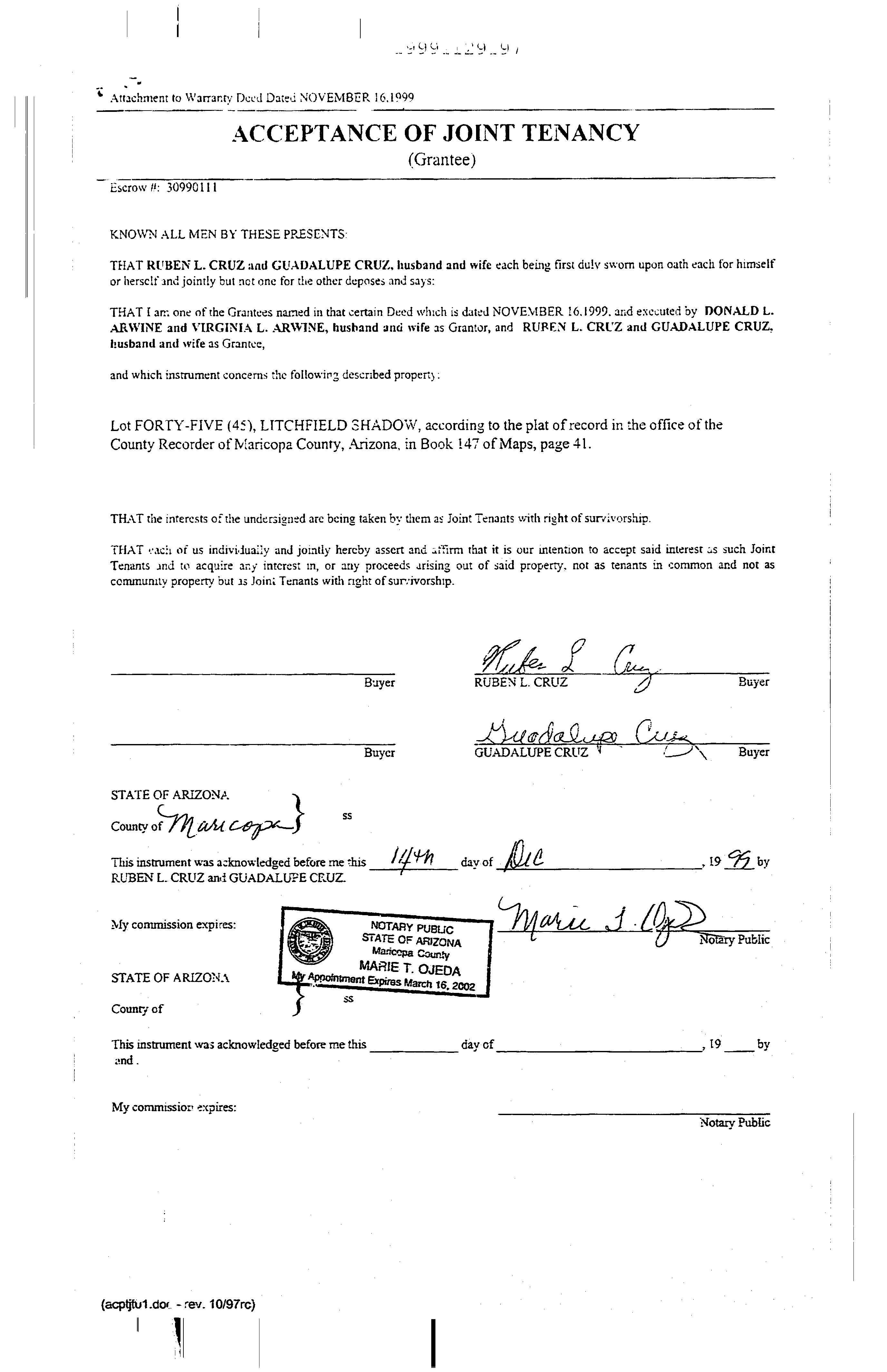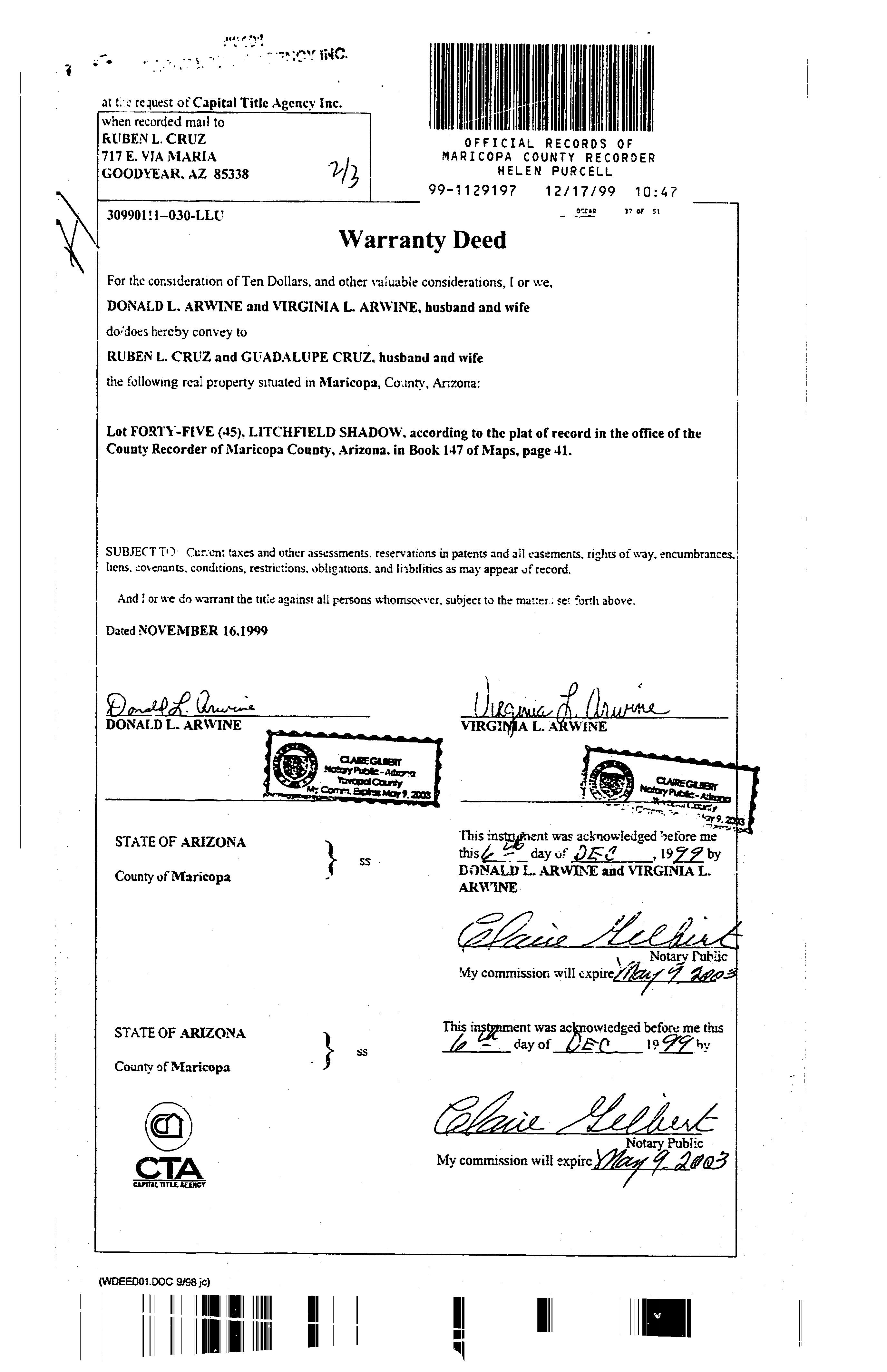 Owner Name: Cruz Ruben L / APN / Alternate APN: 500-03-052 / Deed Type: Warranty Deed Land Use: Sfr Subdivision / Tract: Litchfield Shadows / Lot Size: 7,840 Year Built / Eff: 1978 / Rec. Date / Price: 12/17/1999 / $95,000 Living Area: 1,450 # of units: Document #: 1129197 Bedrooms: Pool: Total Tax Value: $160,300 Bath(F/H): /