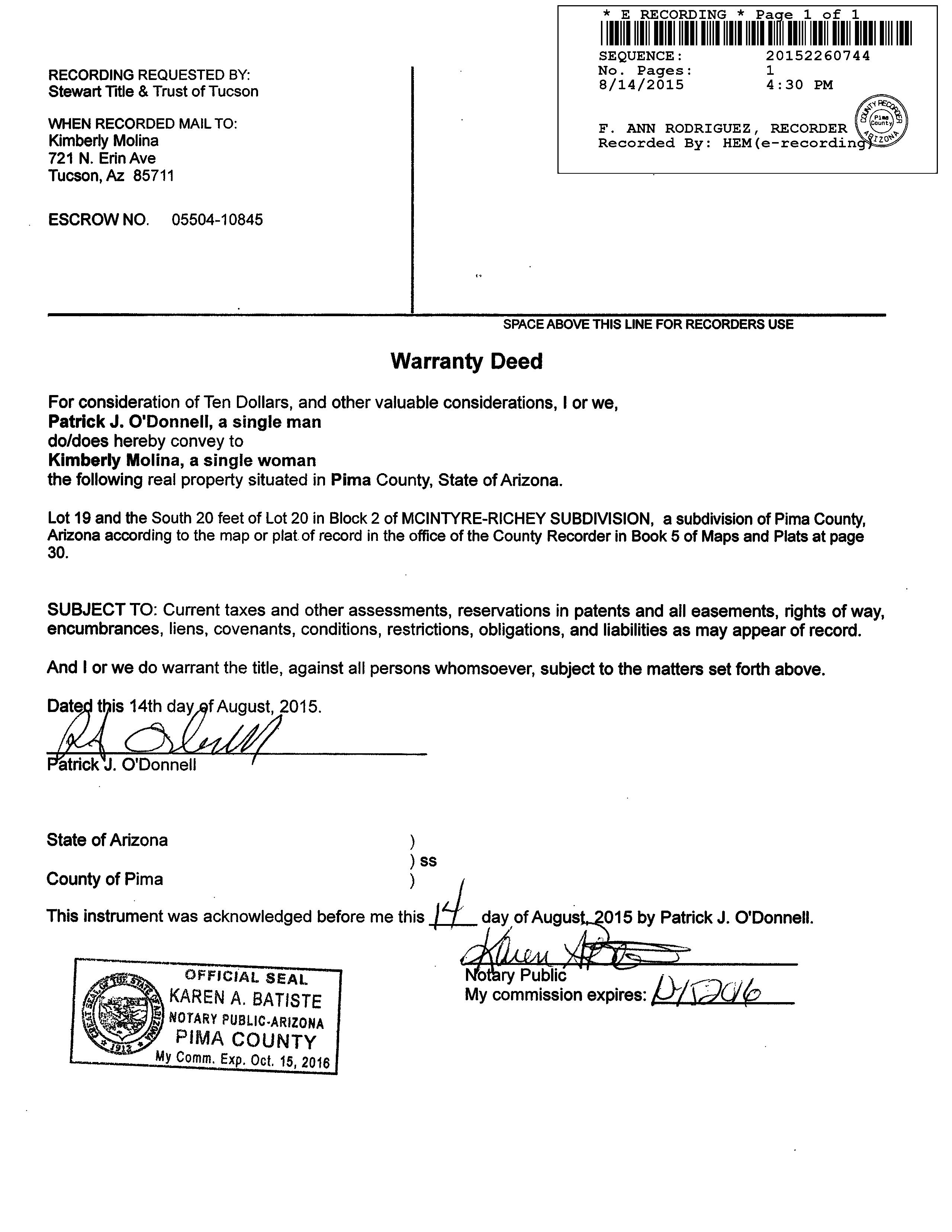 Subject Property : 721 N Erin Ave Tucson AZ 85711 Owner Information Owner Name : Molina Kimberly Mailing Address : 8501 W Cambridge Ave, Phoenix AZ 85037-3540 C012 Owner OccupiedIndicator : A Location Information Legal Description : Mcintyre-richey Lot 19 & S20' Lot 20 Blk 2 County : Pima, Az Market Area : 70 Census Tract / Block : 32.02 / 2 APN : 126-04-0770 Township-Range- Sect : 14S-14E-10 Subdivision : Mcintyre Richey Legal Book/Page : 5-30 Map Reference : 10-14S-14E Legal Lot : 19 School District : Tucson Unified Legal Block : 2 Munic/Township : Tucson Unified Last Market Sale Information Recording/Sale Date : 08/14/2015 / 08/14/2015 1st Mtg Amount/Type : $139,900 / Pp Sale Price : $149,900 1st Mtg Document # : 2260745 Document # : 2260744 1st Mtg Term : 10 Deed Type : Warranty Deed Price Per SqFt : $127.14 Title Company : Stewart Title & Tr/tucson Seller Name : Odonnell Patrick J Prior Sale Information Prior Rec/Sale Date : 06/20/2002 / 04/15/2002 Prior Deed Type : Joint Tenancy Deed Prior Doc Number : 11825-2113 Property Characteristics Gross Area : 1,179 Capacity :Garage 1 Patio Type : Covered Patio Living Area : 1,179 Roof Material : Asphalt Air Cond : Evap Cooler Total Rooms : 5 Heat Type : Forced Air Quality : Good Year Built / Eff : 1957 Cooling Type : Forced Air Condition : Excellent # of Stories : 1 Exterior wall : Brick Bath Fixtures : 6 Parking Type : Carport Customer Name : Kariann Keomaka Customer Company Name : First American Title Insurance Company Prepared On : 08/26/2022 © 2022 CoreLogic. All rights reserved