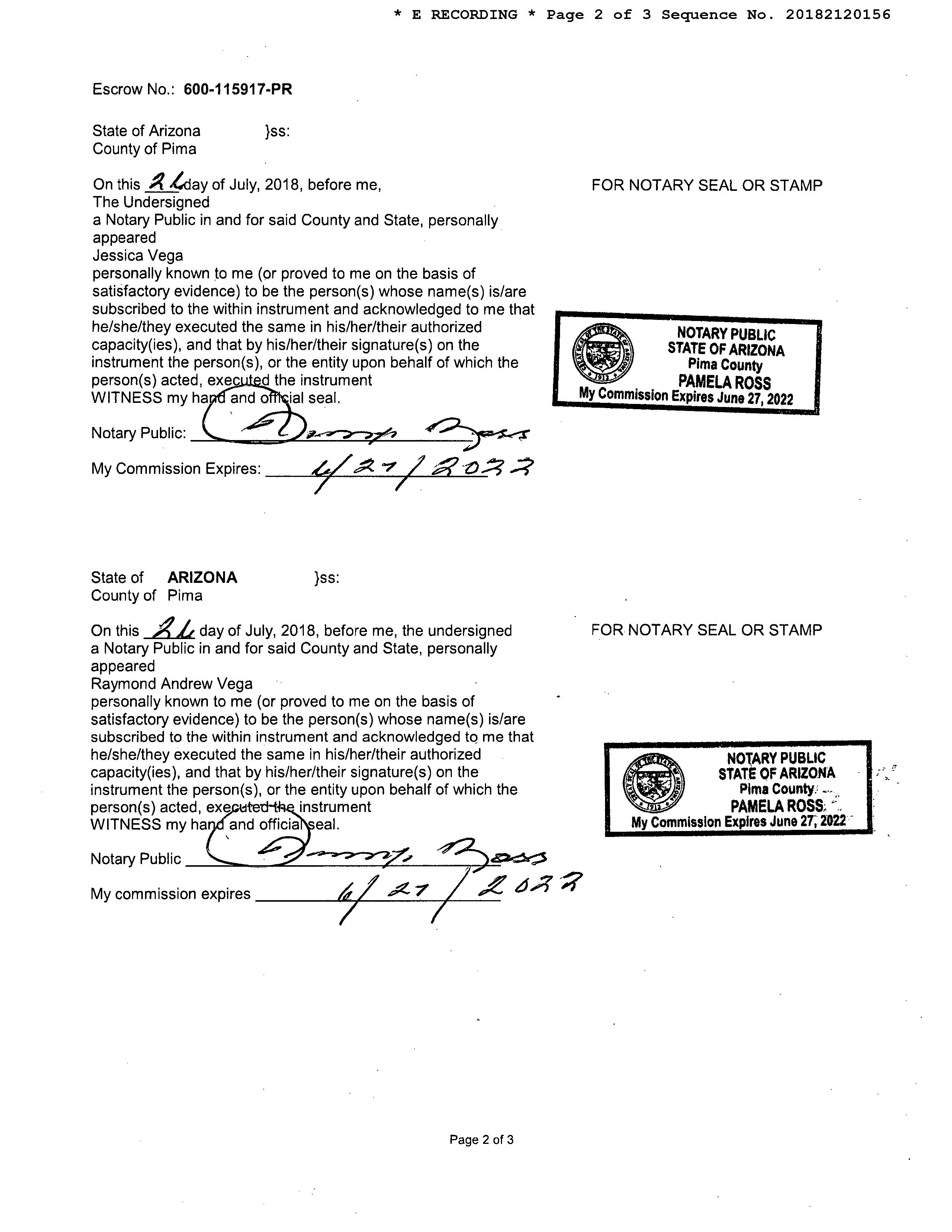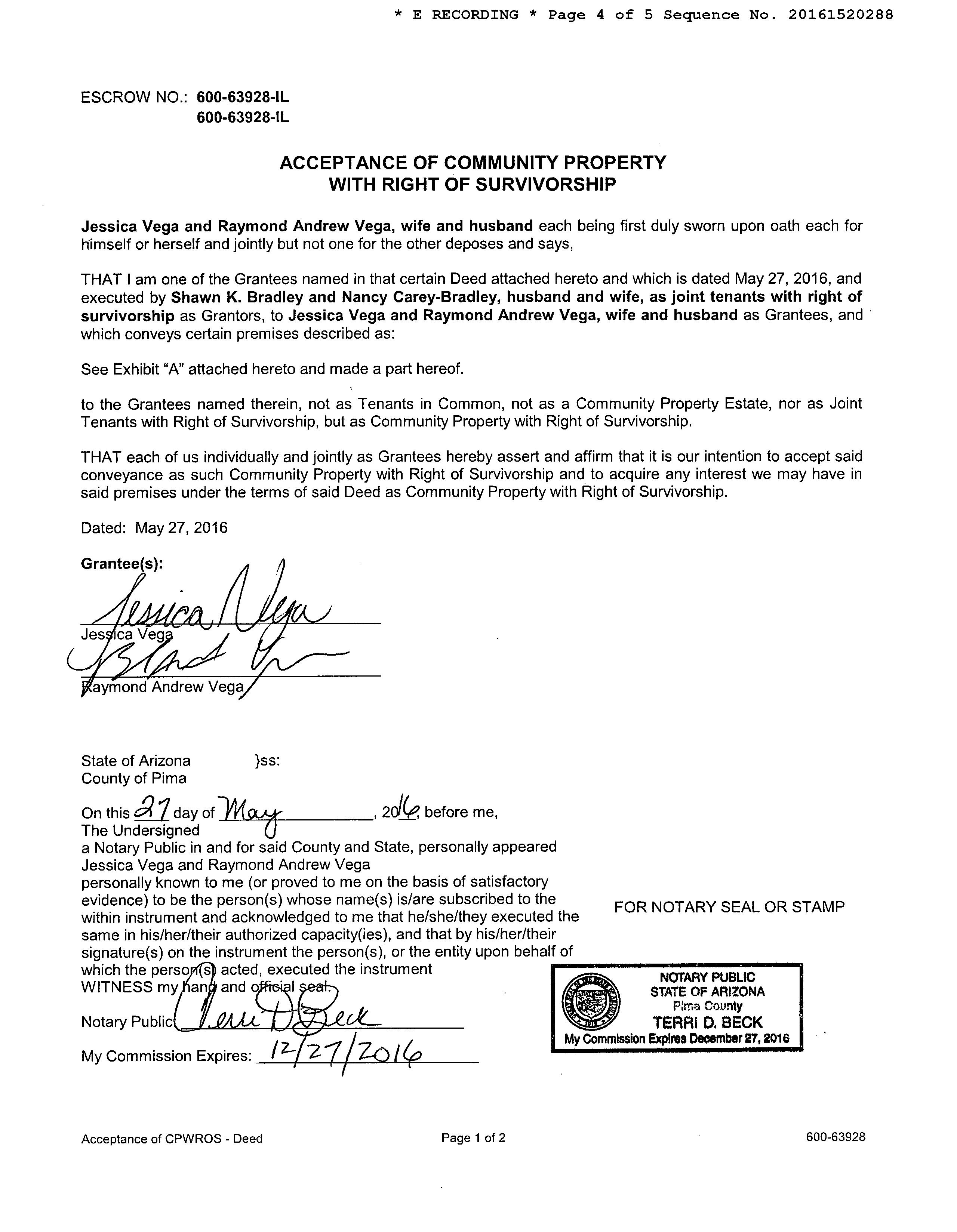 INSTRUMENT REC DATE OWNER: VEGA JESSICA/RAYMOND A AFFIDAVIT 2016 1520288 05/31/2016 SITUS: 7356 N CASABLANCA DR PC MAIL: 7356 N CASABLANCA DR TUCSON AZ 85704