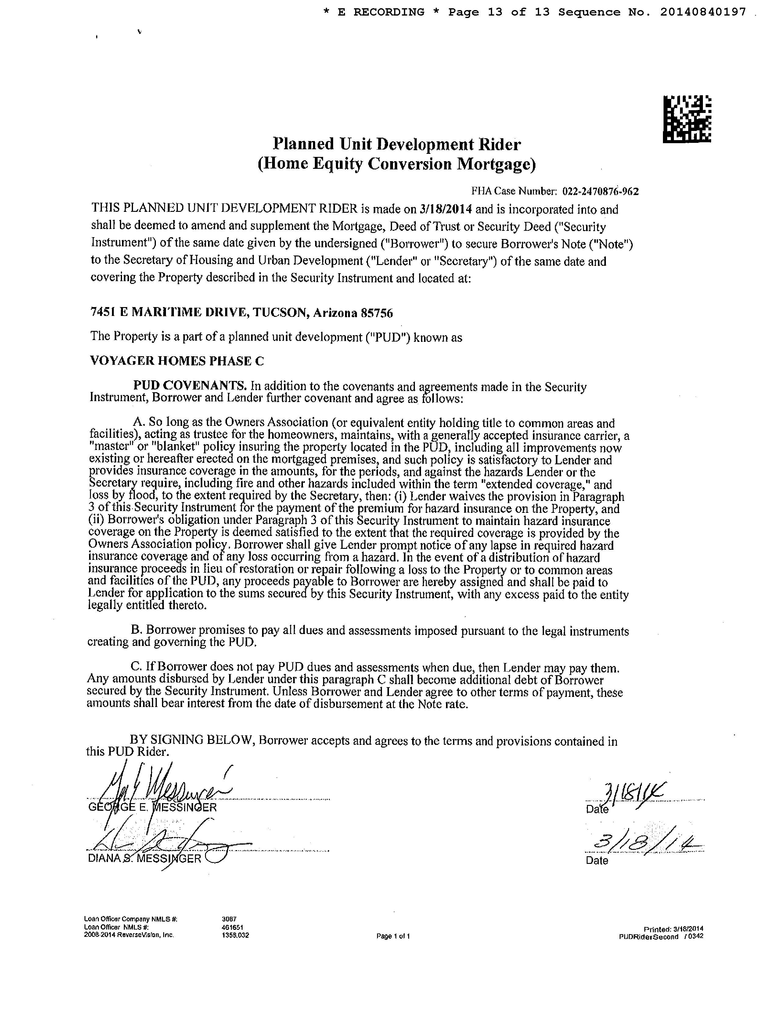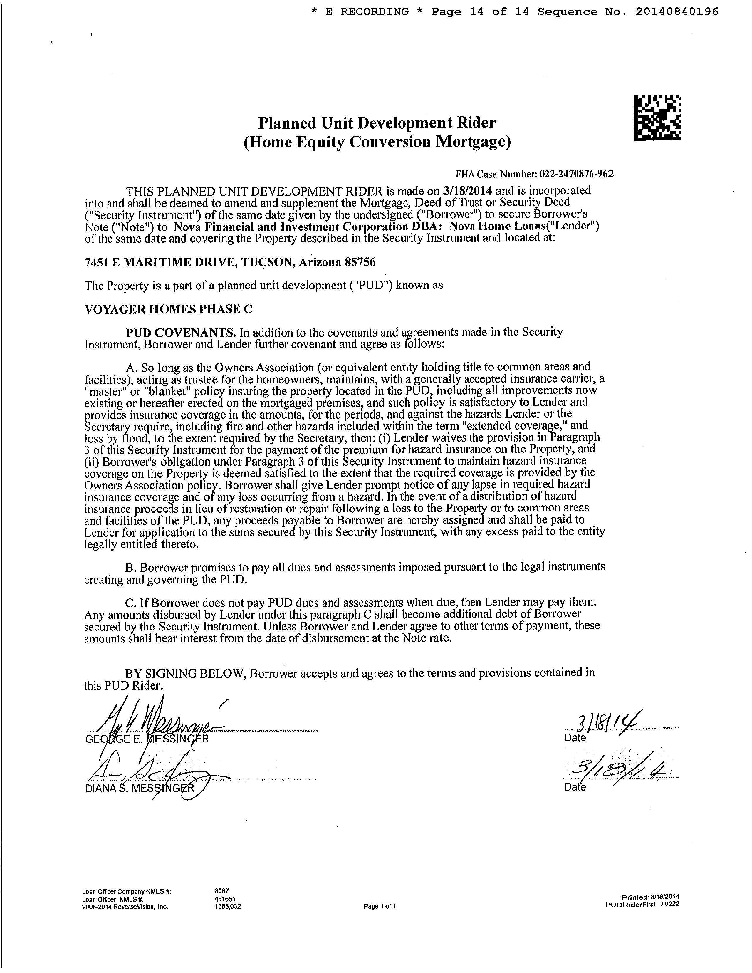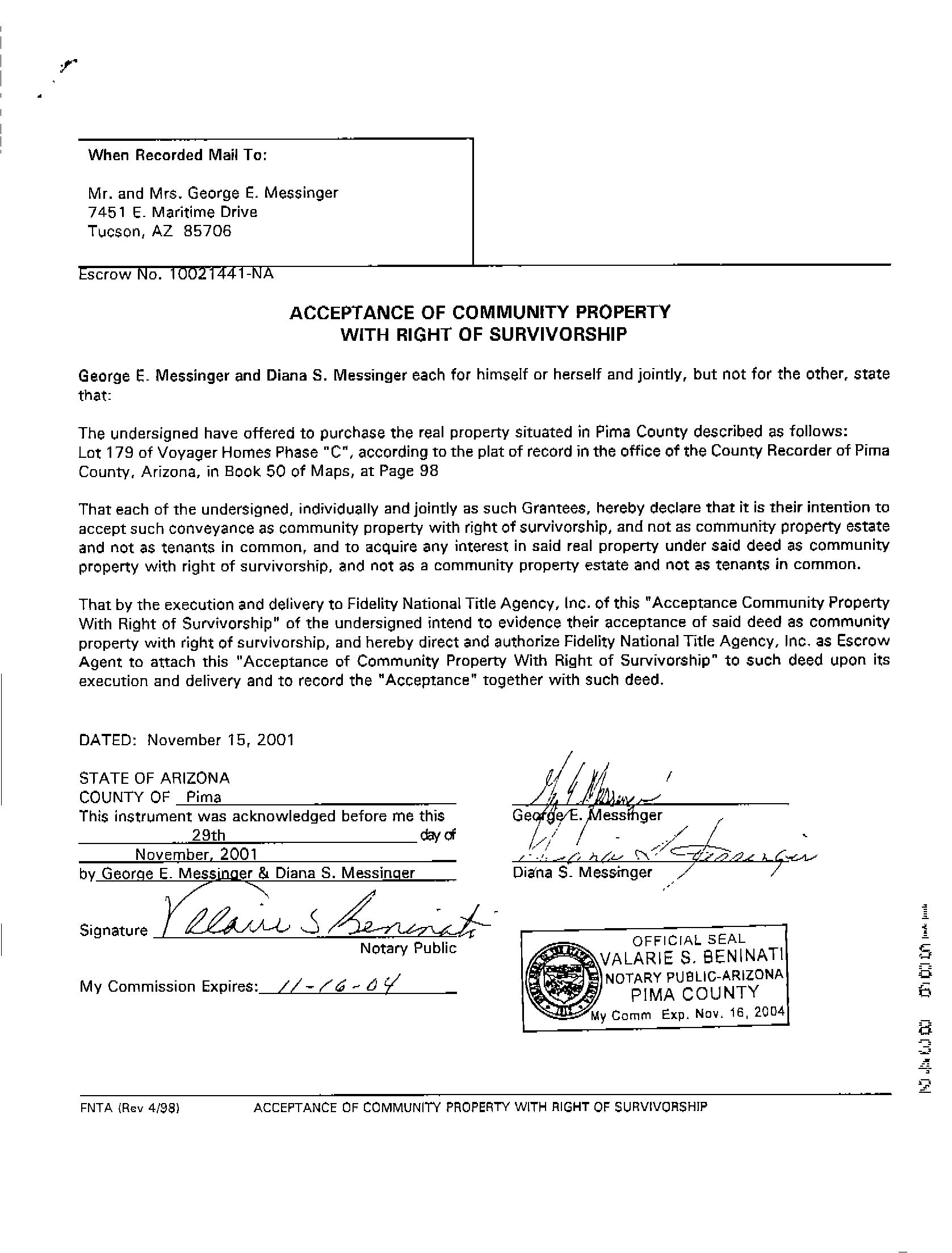 Owner Name: Messinger George E /Messinger Diana S APN / Alternate APN: 141-23-1860 / Deed Type: Special Warranty Deed Land Use: Condominium Subdivision / Tract: Voyager Homes Ph C / Lot Size: 4,505 Year Built / Eff: 2001 / Rec. Date / Price: 11/30/2001 / $134,701 Living Area: 1,461 # of units: