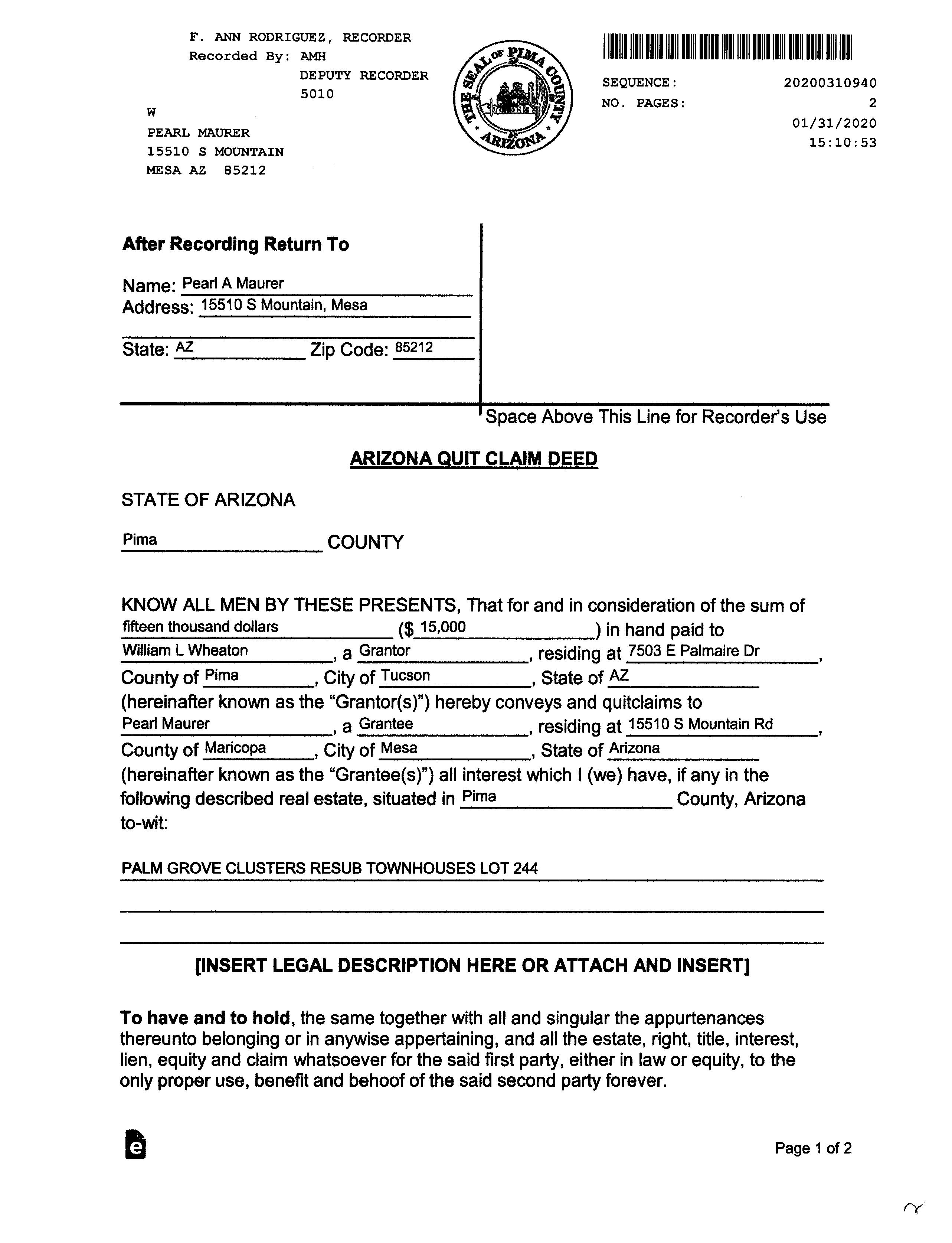 Owner Name: Maurer Pearl / APN / Alternate APN: 136-37-3970 / Deed Type: Quit Claim Deed
