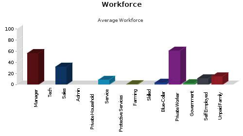 Manager/Prof: 56.13% Private Worker: 61.33% Technical: Government Worker: 2.34% Sales: 32.24% Self Employed Worker: 11.21% Administrative: Unpaid Family Worker: 14.6%