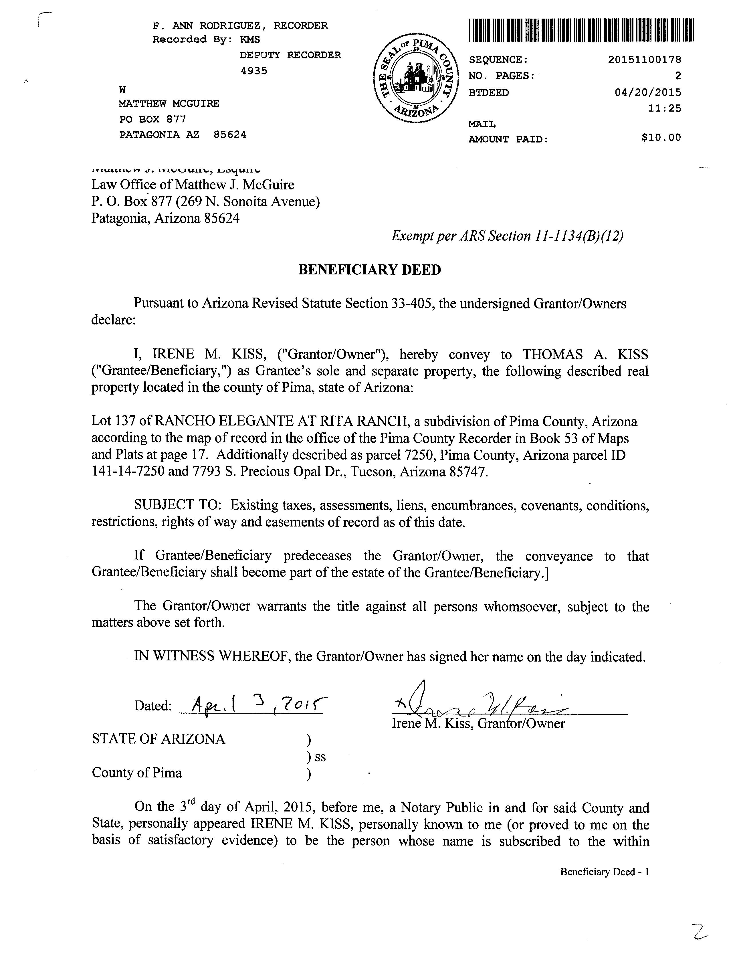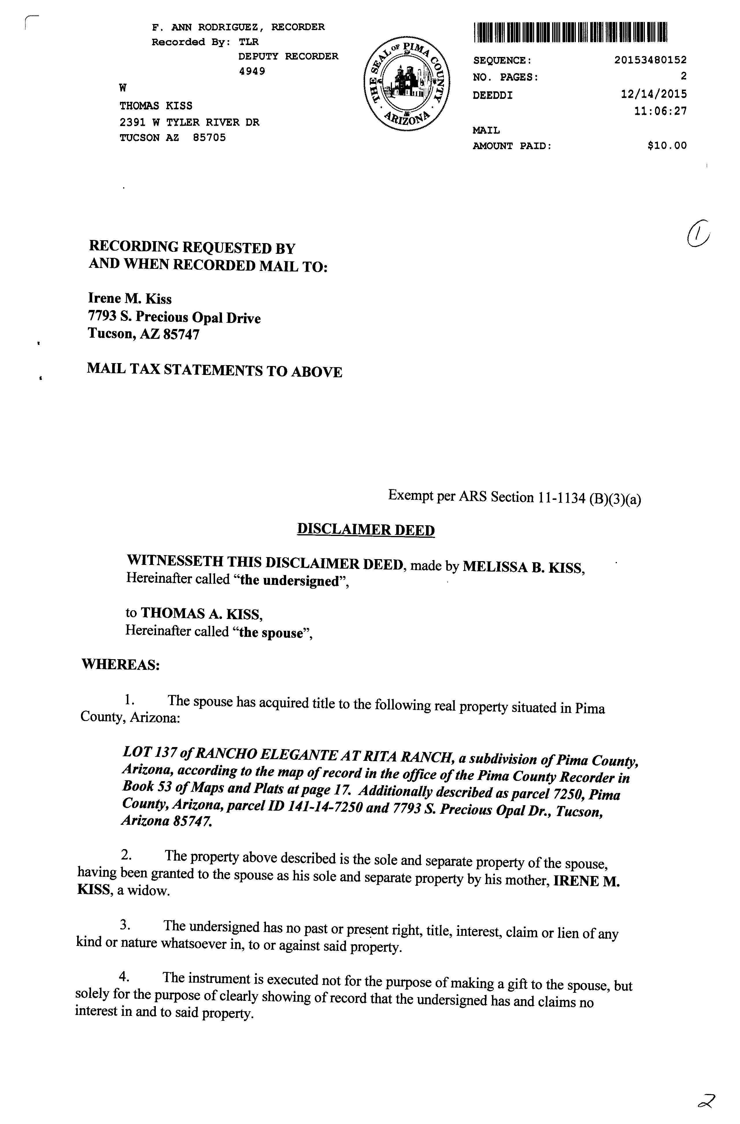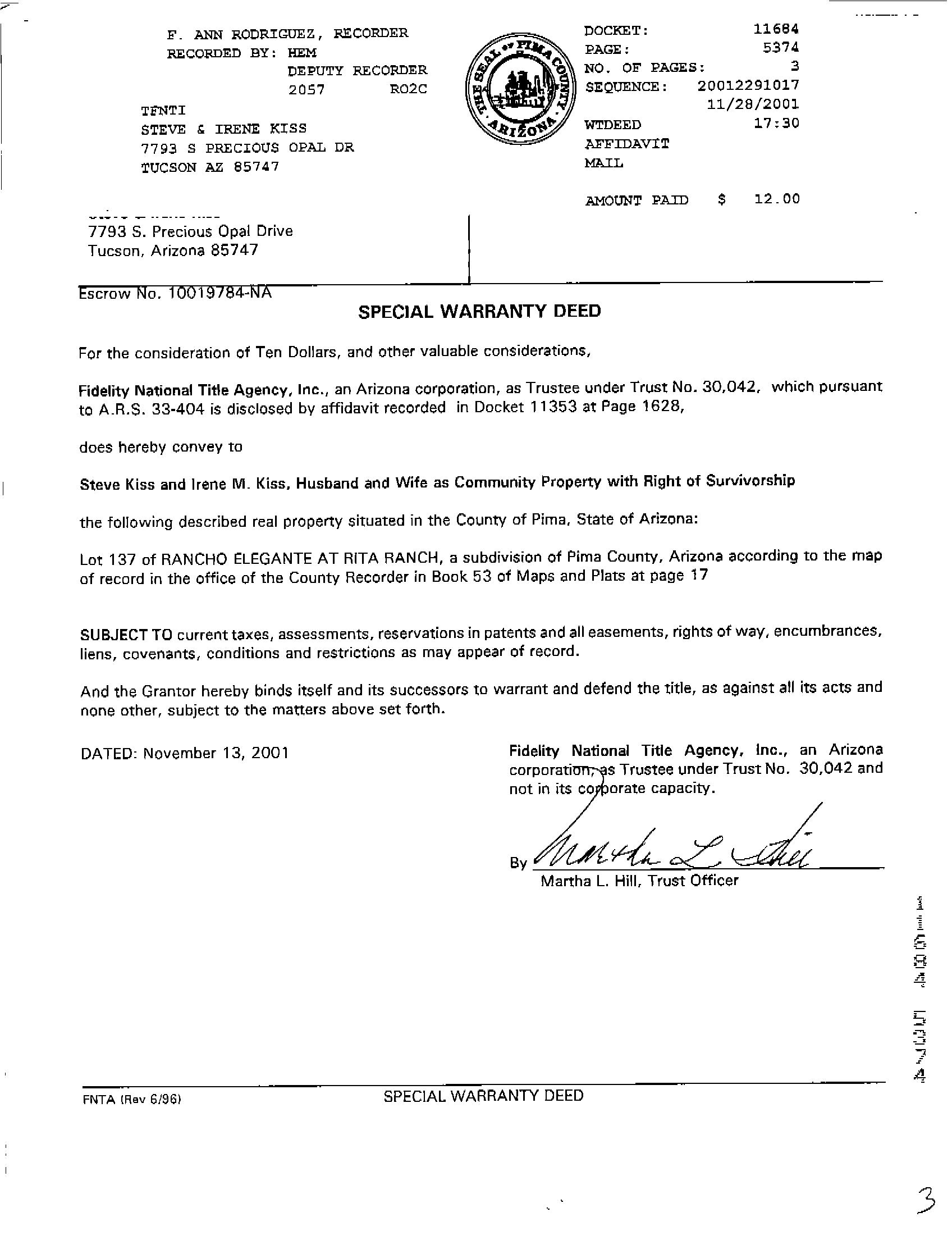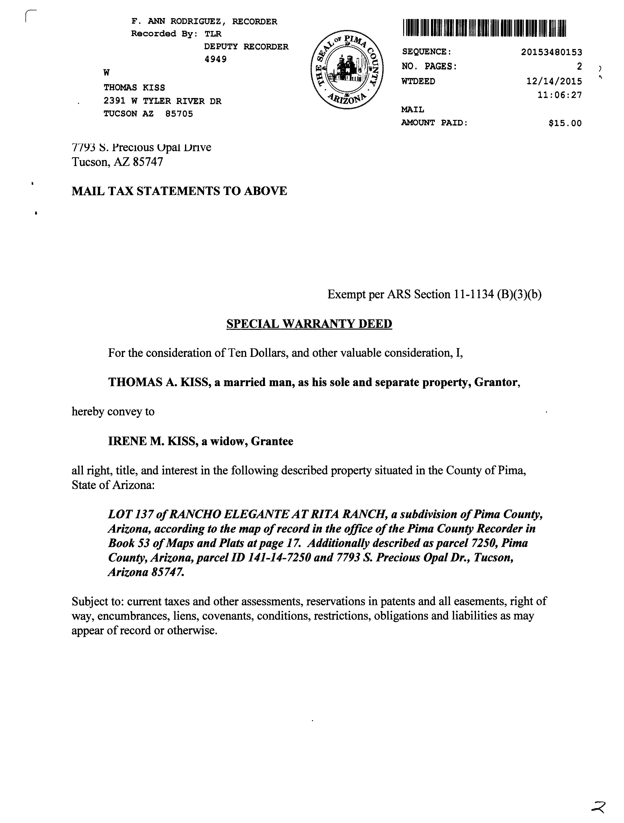 Owner Name: Kiss Irene M 2015 Revoc Tr / APN / Alternate APN: 141-14-7250 / Deed Type: Special Warranty Deed Land Use: Sfr Subdivision / Tract: Rancho Elegante At Rita Ranch / Lot Size: 5,400 Year Built / Eff: 2001 /