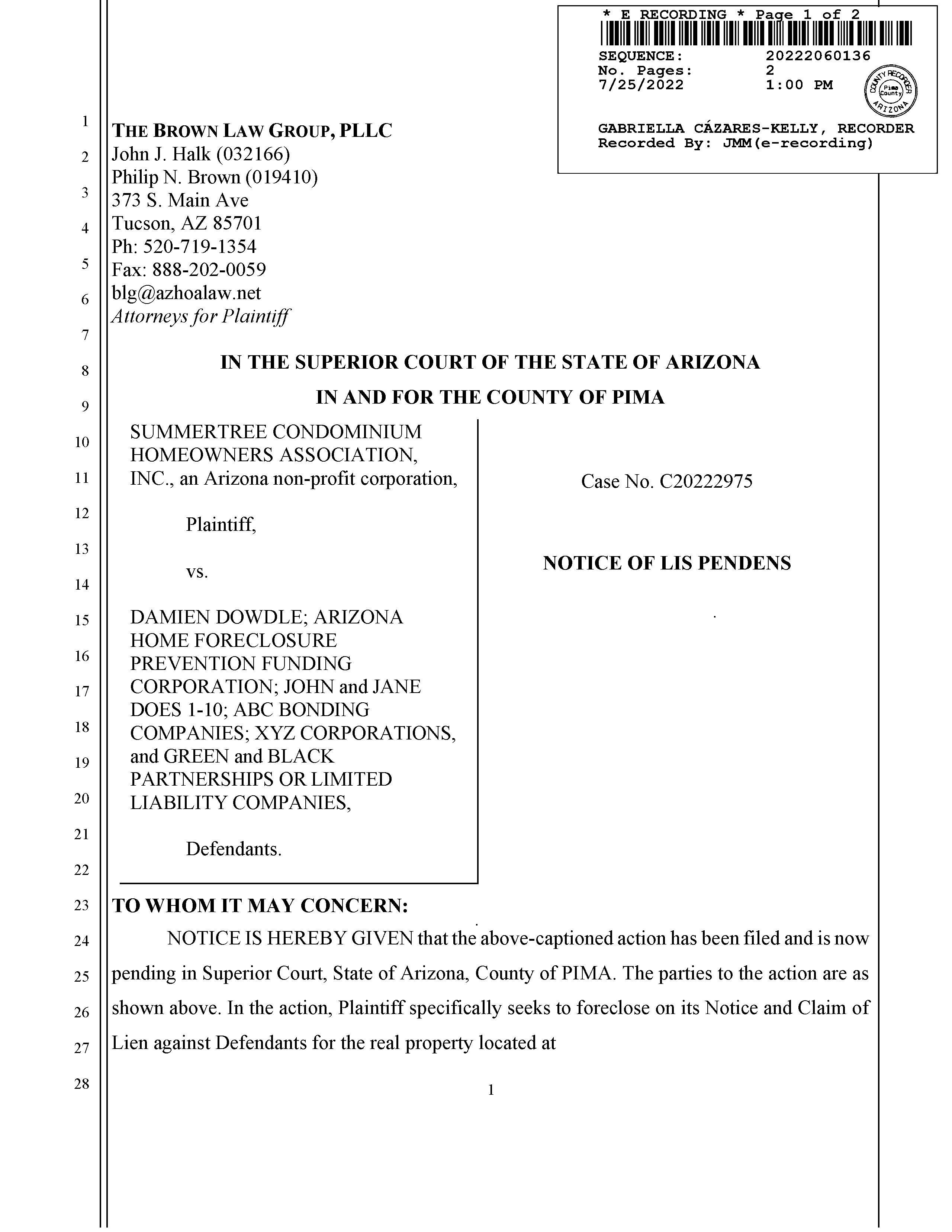 Owner Name : Dowdle Damien Mailing Address : 7952 E Colette Cir #166, Tucson AZ 85710-2400 C023