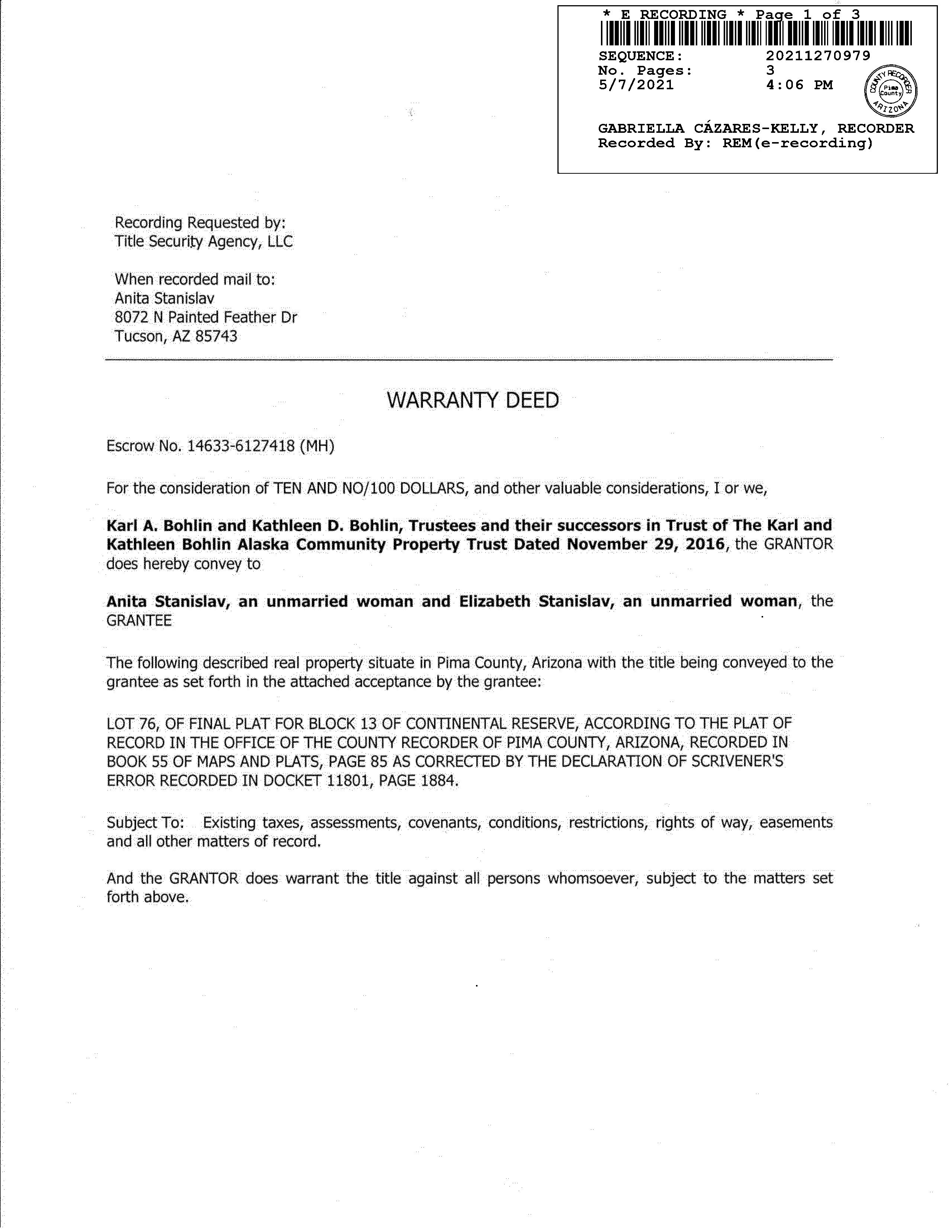 Buyer Name: Stanislav Anita / Stanislav Elizabeth Seller Name: Bohlin Karl A Kathleen D Deed Type: General Warranty Deed