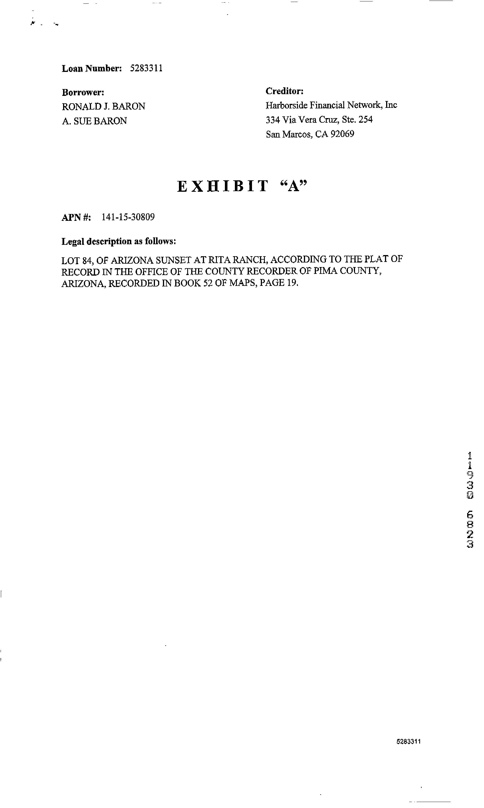Subject Property : 8128 S Sunny Horizon Pl Tucson AZ 85747 Owner Information Owner Name : Baron Ronald J / Baron A Sue Mailing Address : 8128 S Sunny Horizon Pl, Tucson AZ 85747-5522 R120 Vesting Codes : Husband/wife / / Owner OccupiedIndicator : O Location Information Legal Description : Arizona Sunset At Rita Ranch Lot 0084 County : Pima, Az APN : 141-15-3080 Census Tract / Block : 40.73 / 1 Subdivision : Arizona Sunset At Rita Ranch Township-Range- Sect : 15S-15E-26 Map Reference : 26-15S-15E Legal Book/Page : 52-19 School District : Vail Legal Lot : 84 Munic/Township : Vail Market Area : 612 Owner Transfer Information Recording/Sale Date : 11/20/2002 / 10/16/2002 Deed Type : Quit Claim Deed Document # : 11930-6822 1st Mtg Document # : 11930-6824 Last Market Sale Information Recording/Sale Date : 07/31/2000 / 04/00/2000 Deed Type : Joint Tenancy Deed Sale Price : $101,194 Price Per SqFt : $77.72 Document # : 11351-3666 Seller Name : Owner Record Prior Sale Information Prior Rec/Sale Date : 07/31/2000 / 04/20/2000 Prior Lender : Kaufman & Broad Mtg Prior Sale Price : $101,194 Prior 1st Mtg Amt/Type : $101,194 / Va Prior Doc Number : 11351-2127 Prior 1st Mtg Rate/Type : / Fixed Rate Loan Prior Deed Type : Warranty Deed Customer Name : Lisa Mrazek Customer Company Name : First American Title Insurance Company Prepared On : 08/22/2022 © 2022 CoreLogic. All rights reserved