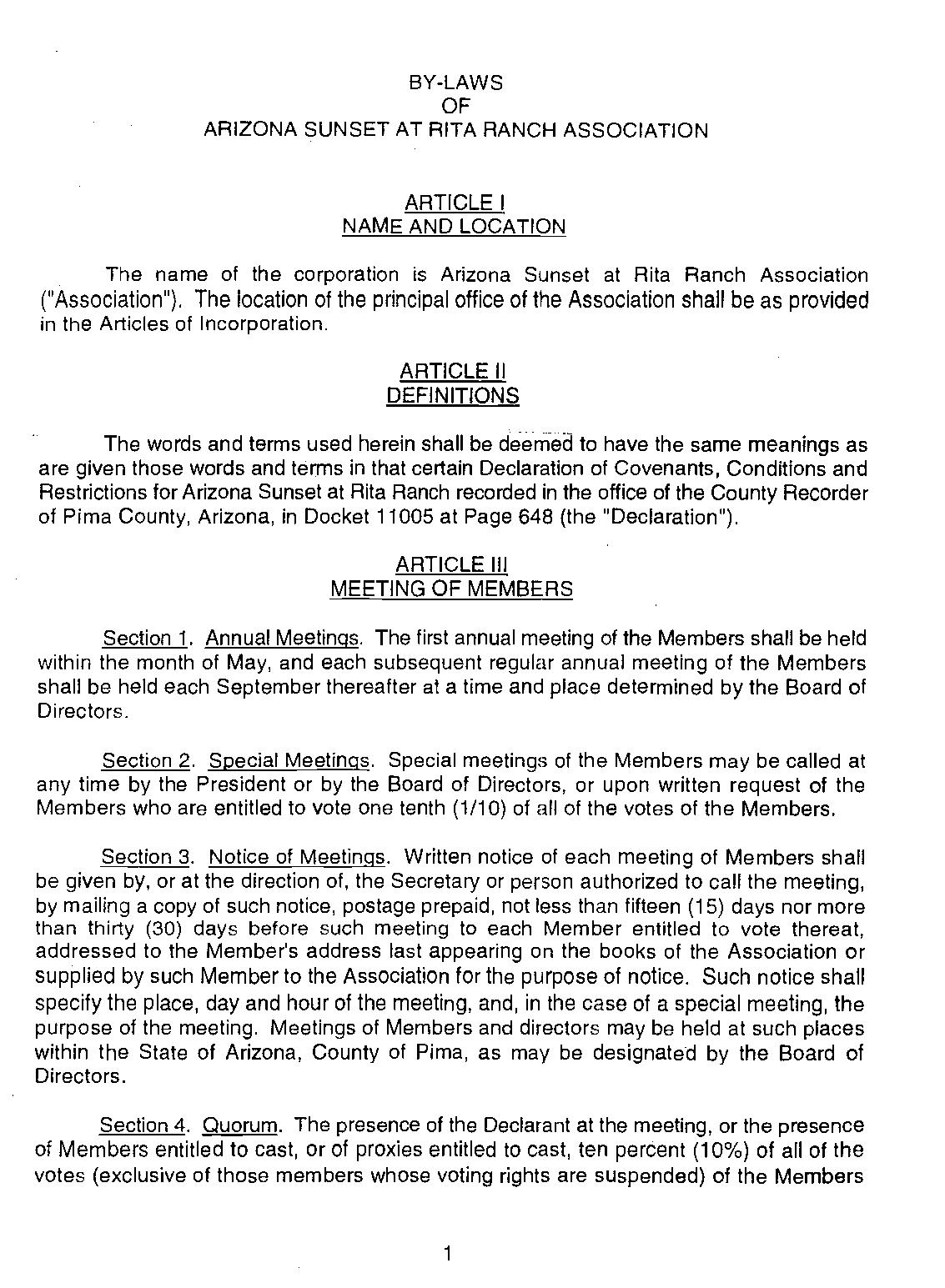A. RESOLVED that the Bylaws of the Arizona Sunset at Rita Ranch Association provides for the following in ARTICLE III MEETING OF MEMBERS: SECTION 4. OUORUM: Section.4. Ouorum: " .. The presence of the Declarant at the meeting, or the presence of Members entitled to cast, or of proxies entitled to cast, ten percent (10%) of all the votes (exclusive of those members whose voting rights are suspended) of the members shall constitute a quorum for any action except as otherwise provided in the Articles of Incorporation, the Declaration, or theseBylaws. Ifhowever, such quorum will not be present or represented at any meeting, the Members entitled to vote thereat shall have the power to adjourn the meeting ITOm time to time, without notice other than announcement at the meeting, until a quorum as aforesaid shall be present or be represented.
