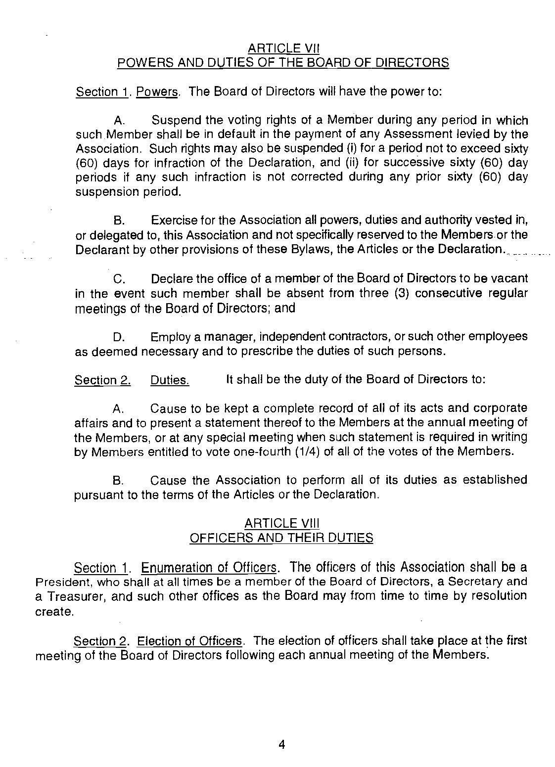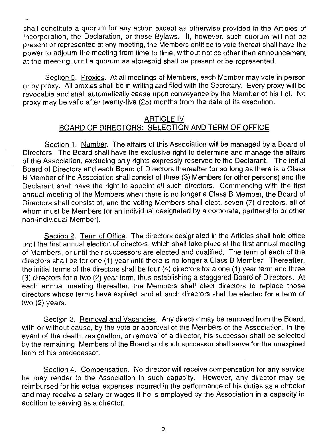 B. RESOLVED, that the Bylaws of the Arizona Sunset at Rita Ranch Association now be changed as follows in ARTICLE III MEETING OF MEMBERS: SECTION 4. OUORUM: Section.4. Ouorum: "... The presence of the Declarant at the meeting, or the . presence of Members entitled to cast, or of proxies entitled to cast, five percent (5%) of all the votes (exclusive of those members whose voting rights are suspended) of the members shall constitute a quorum for any action except as otherwise provided in the Articles of Incorporation, the Declaration, or these Bylaws. Ifhowever, such quorum will not be present or represented at any meeting, the Members entitled to vote thereat shall have the power to adjourn the meeting ITom time to time, without notice other than announcement at the meeting, until a quorum as aforesaid shall be present or be represented.