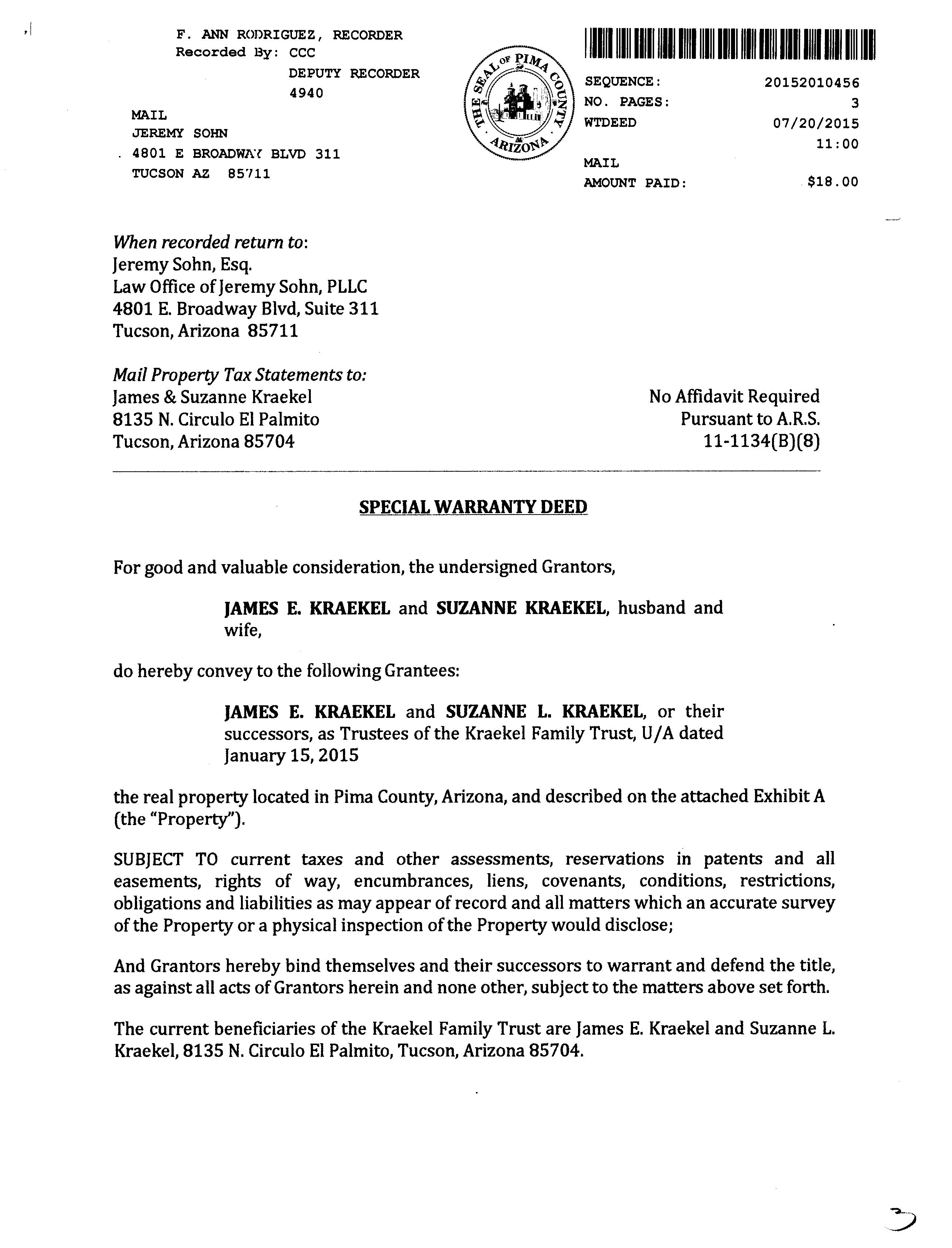Deed Type : Special Warranty Deed Document # : 2010456