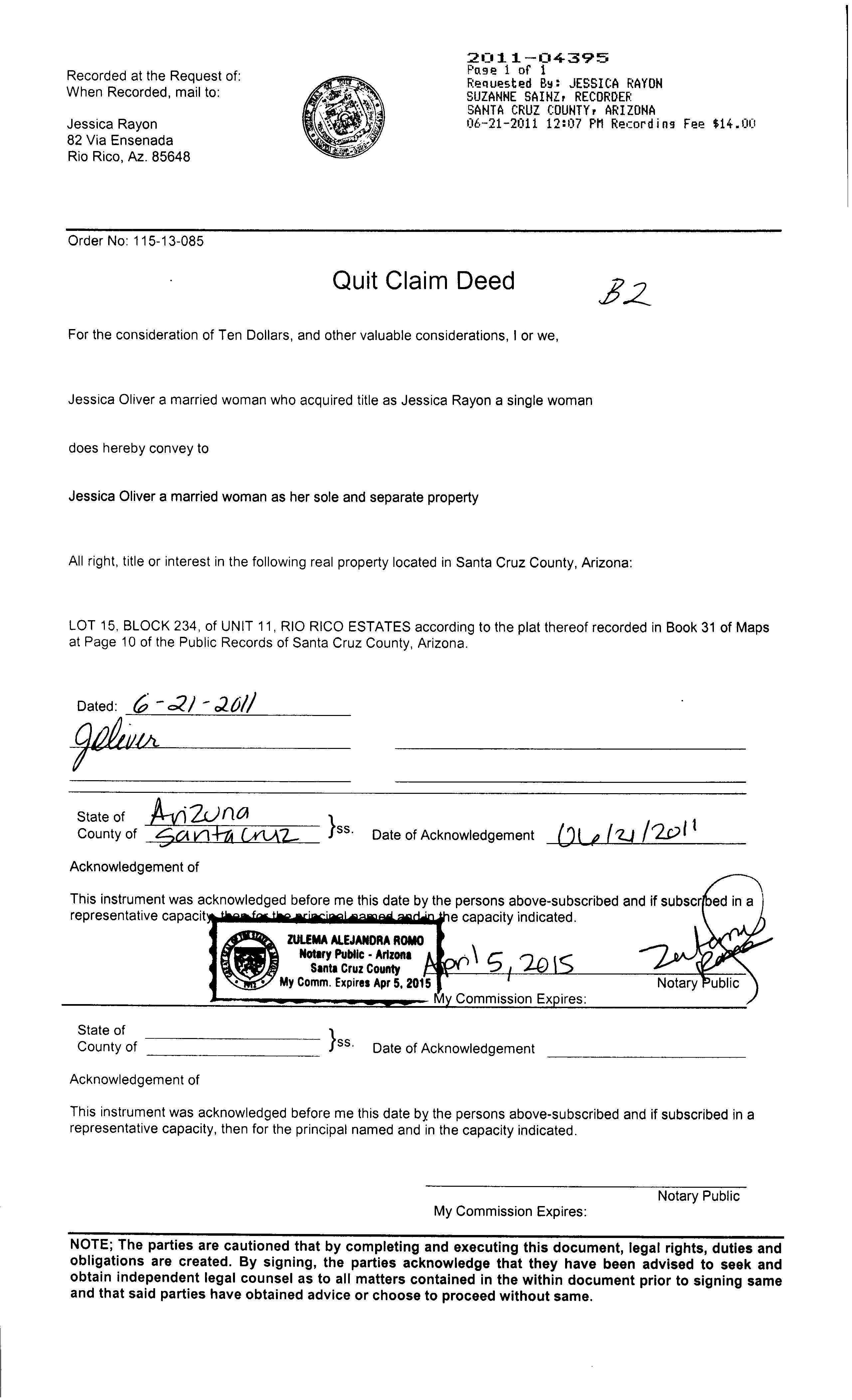 Owner Name : Oliver Jessica Mailing Address : 82 Via Ensenada, Rio Rico AZ 85648-2843 R008
