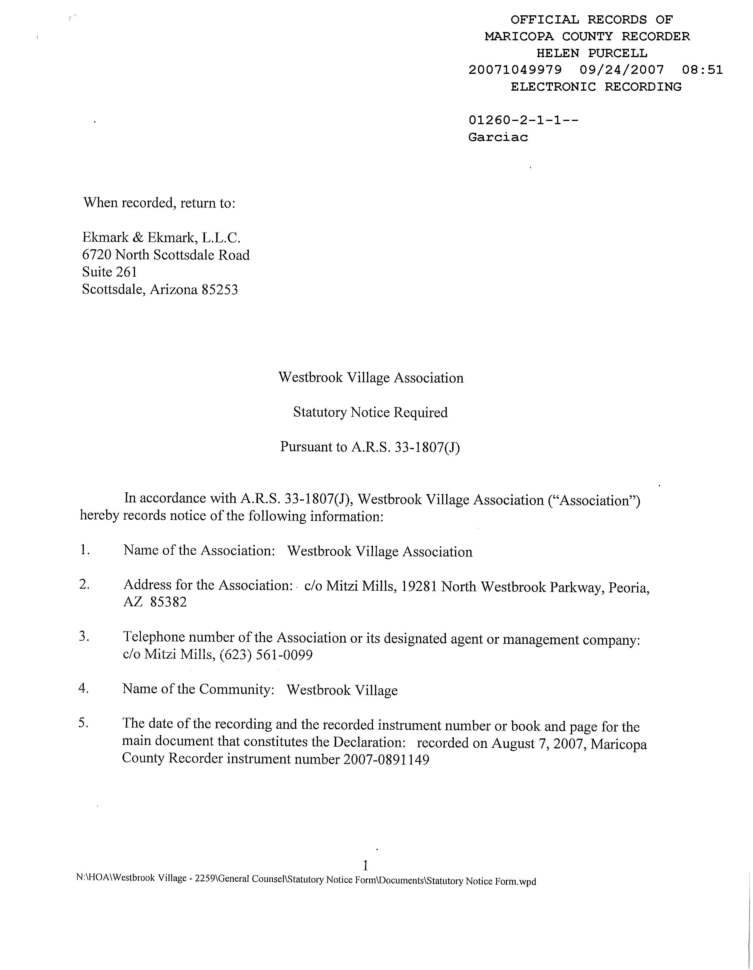 MARICOPA, AZ Document:NOT HOA 2007.1049979 Page:1 of 2 Printed on:10/4/2022 2:54 PM Branch :FC0 User :JSTI