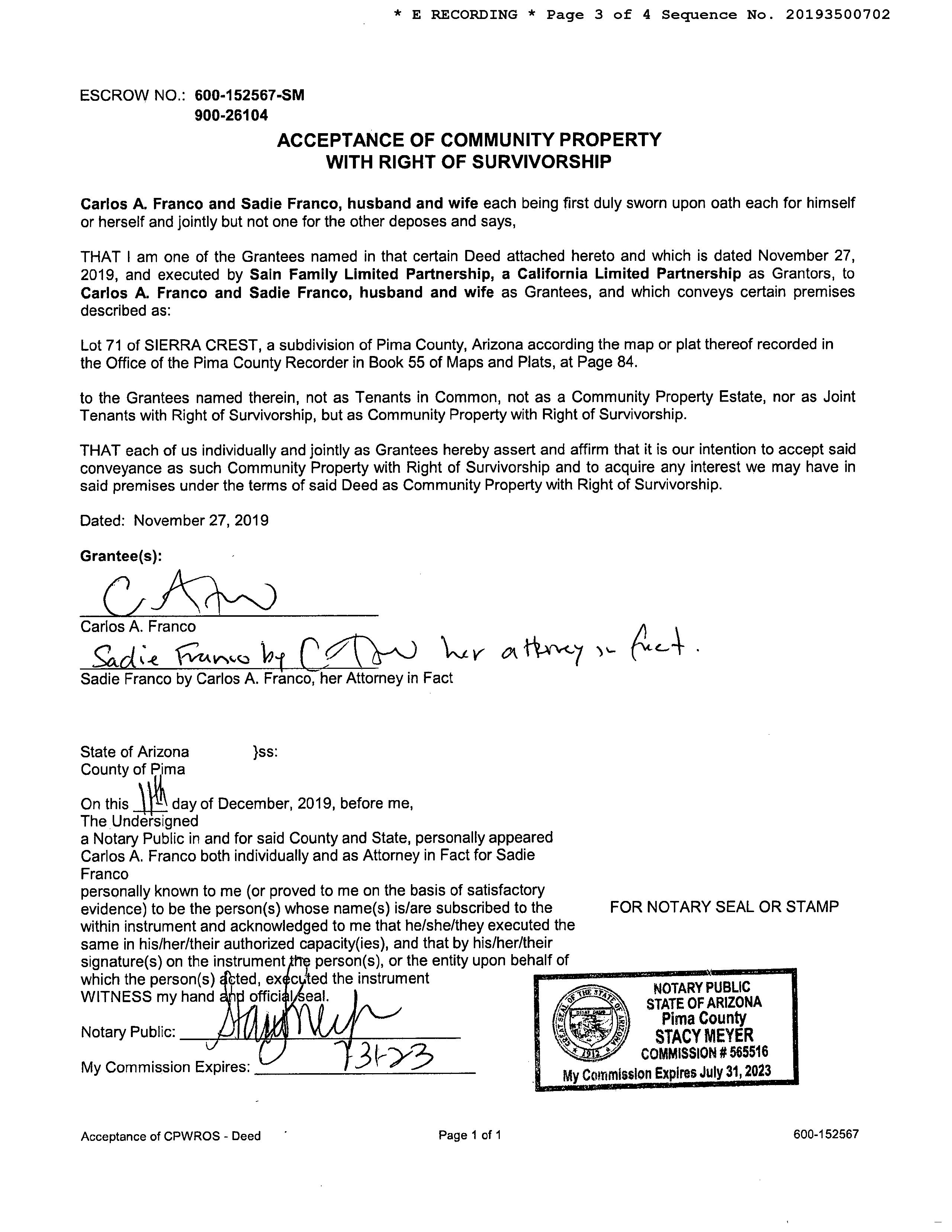 PIMA, AZ Document:DED WAR 2019.350.0702 Page:3 of 4 Printed on:10/25/2022 4:24 PM Branch :FC0 User :JSTI