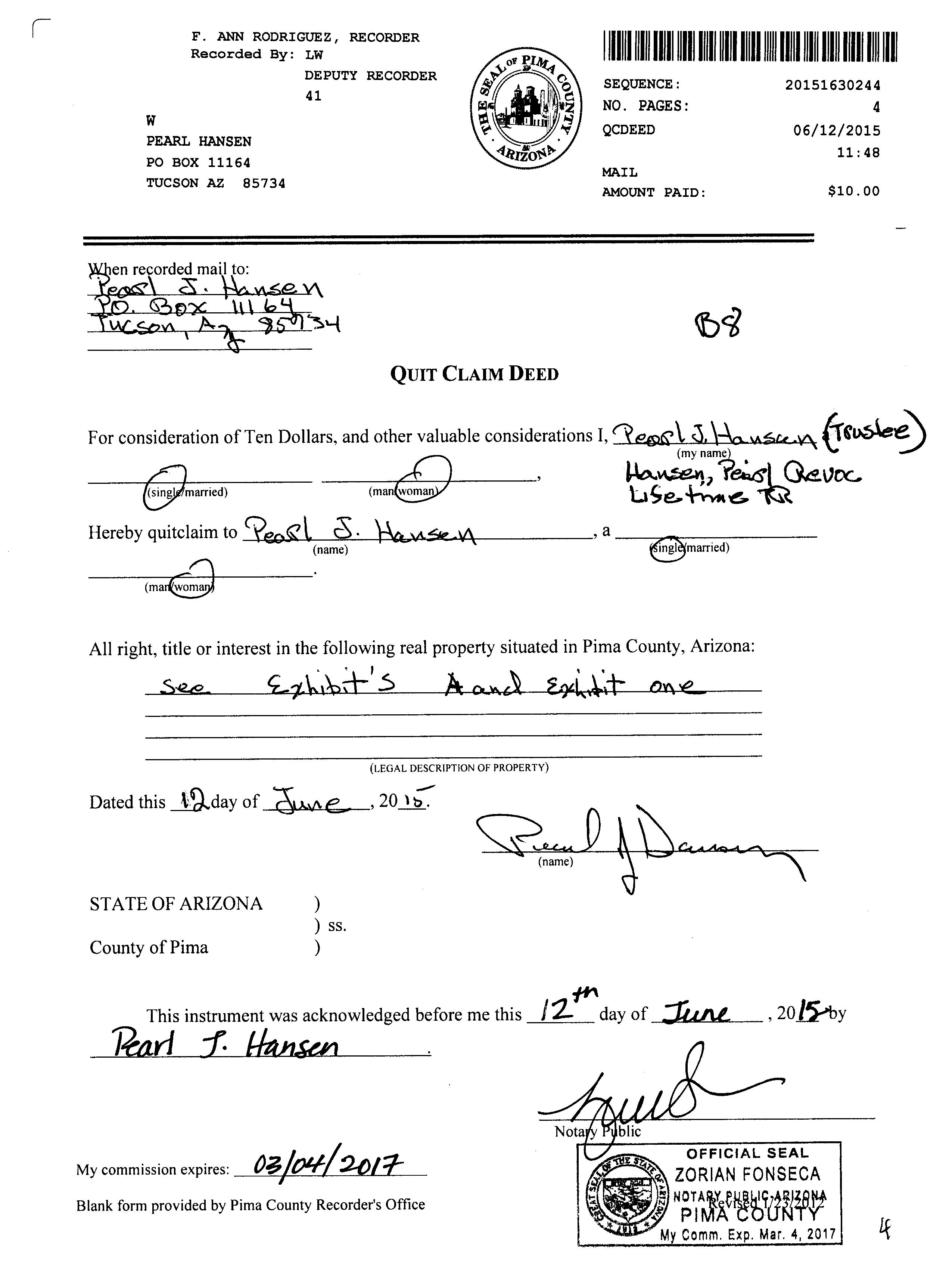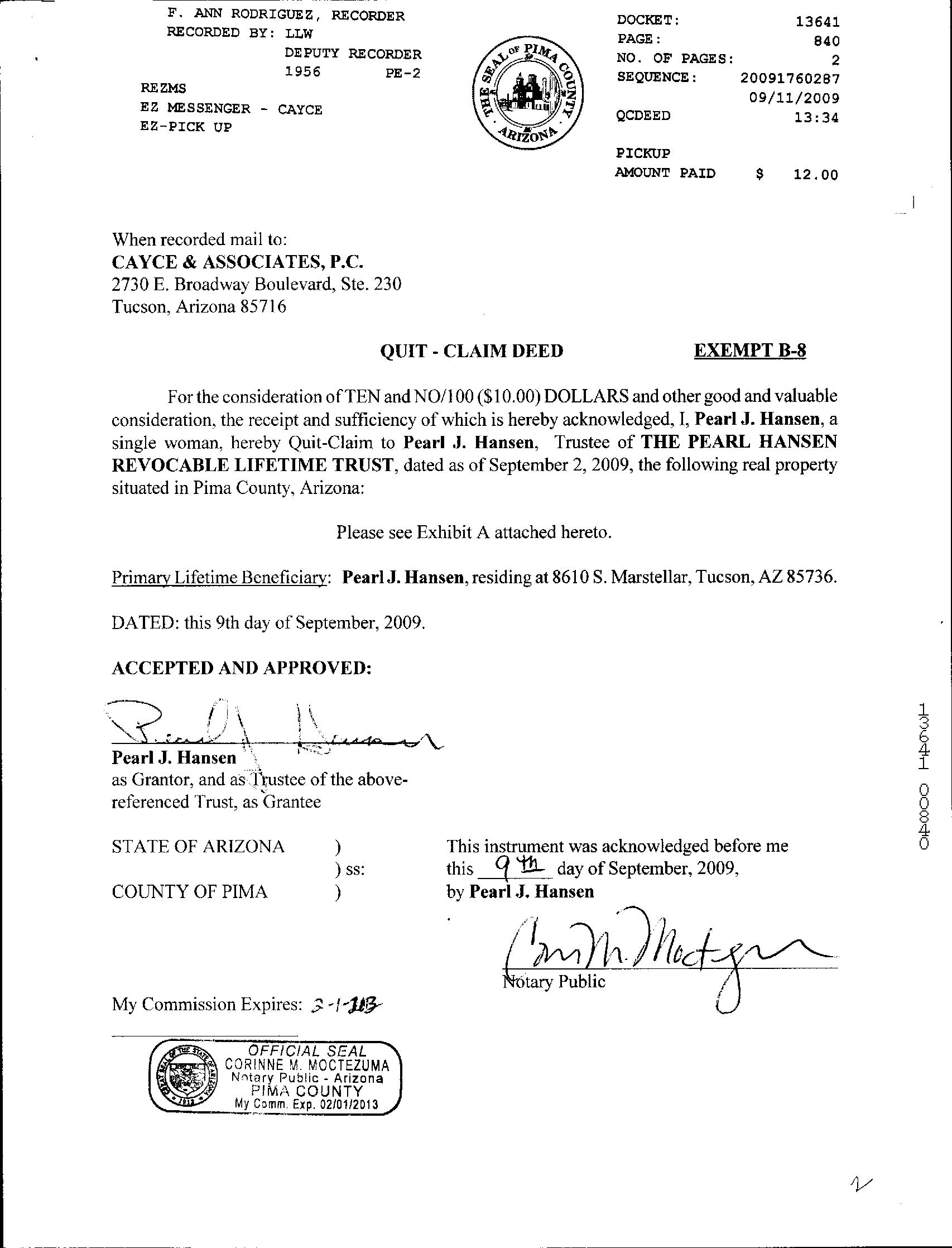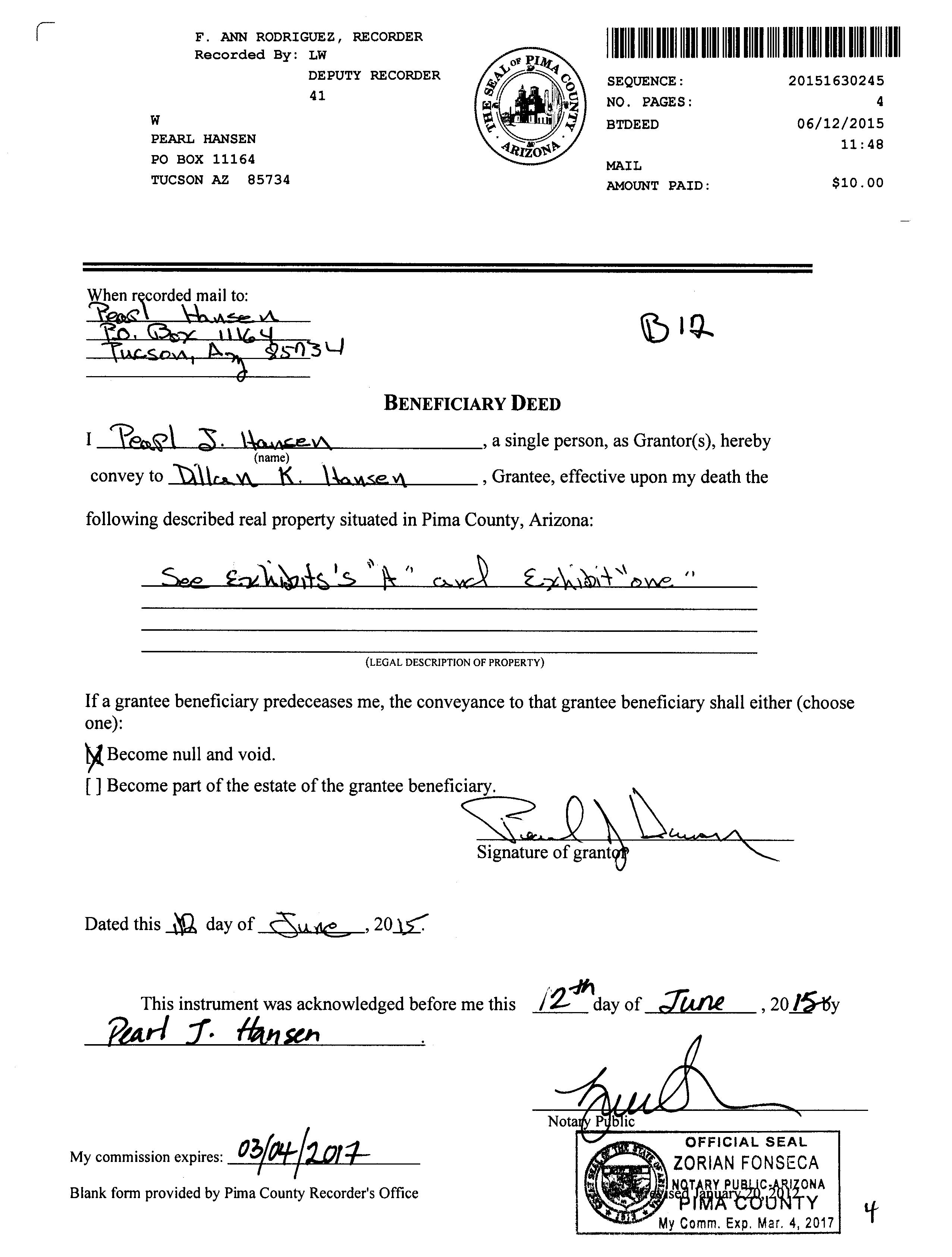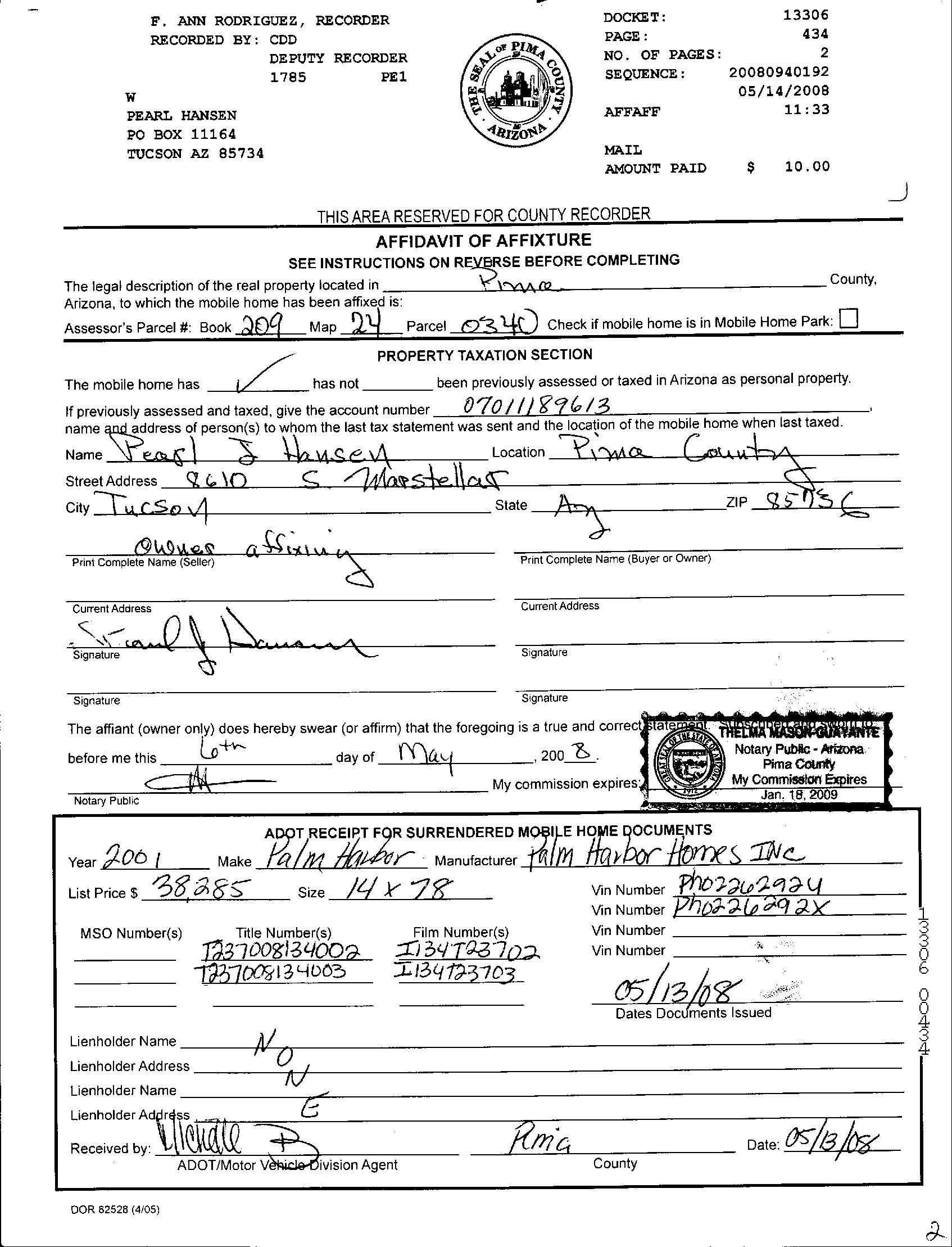 Subject Property : 8594 S Marstellar Rd Tucson AZ 85736 Owner Information Owner Name : Hansen Pearl J Mailing Address : Po Box 11164, Tucson AZ 85734-1164 B002 Vesting Codes : / / Revocable Trust Location Information Legal Description : W544.54' S330.75' Lot 7 De Soto Est Rs 19/9 Aka Ctrl Sly Ptn N2 S2 4.14 Ac Sec 29-15-11 County : Pima, Az APN : 209-24-009N Census Tract / Block : 43.13 / 4 Subdivision : Desoto Estates Township-Range- Sect : 15S-11E-29 Map Reference : 29-15S-11E Legal Lot : 7 School District : Altar Valley Market Area : 310 Munic/Township : Altar Valley Owner Transfer Information Recording/Sale Date : 02/05/2020 / 02/04/2020 Deed Type : Joint Tenancy Deed Document # : 360467 Last Market Sale Information Recording/Sale Date : 04/26/2004 / 04/19/2004 Document # : 12288-5964 Sale Price : $70,000 Deed Type : Warranty Deed Title Company : Fidelity National Title Co Seller Name : Pena Eladio Sr Property Characteristics Year Built / Eff : 2004 / 2004 # of Stories : 1 Construction : Steel/wood Property Information Land Use : Mobile Home Zoning : RH Lot Size : 179,903 County Use : Mh Non Subd Lot-no Mf Home Lot Acres : 4.13 State Use : Mh Non Subd Lot-no Mf Home Customer Name : Kariann Keomaka Customer Company Name : First American Title Insurance Company Prepared On : 08/16/2022 © 2022 CoreLogic. All rights reserved