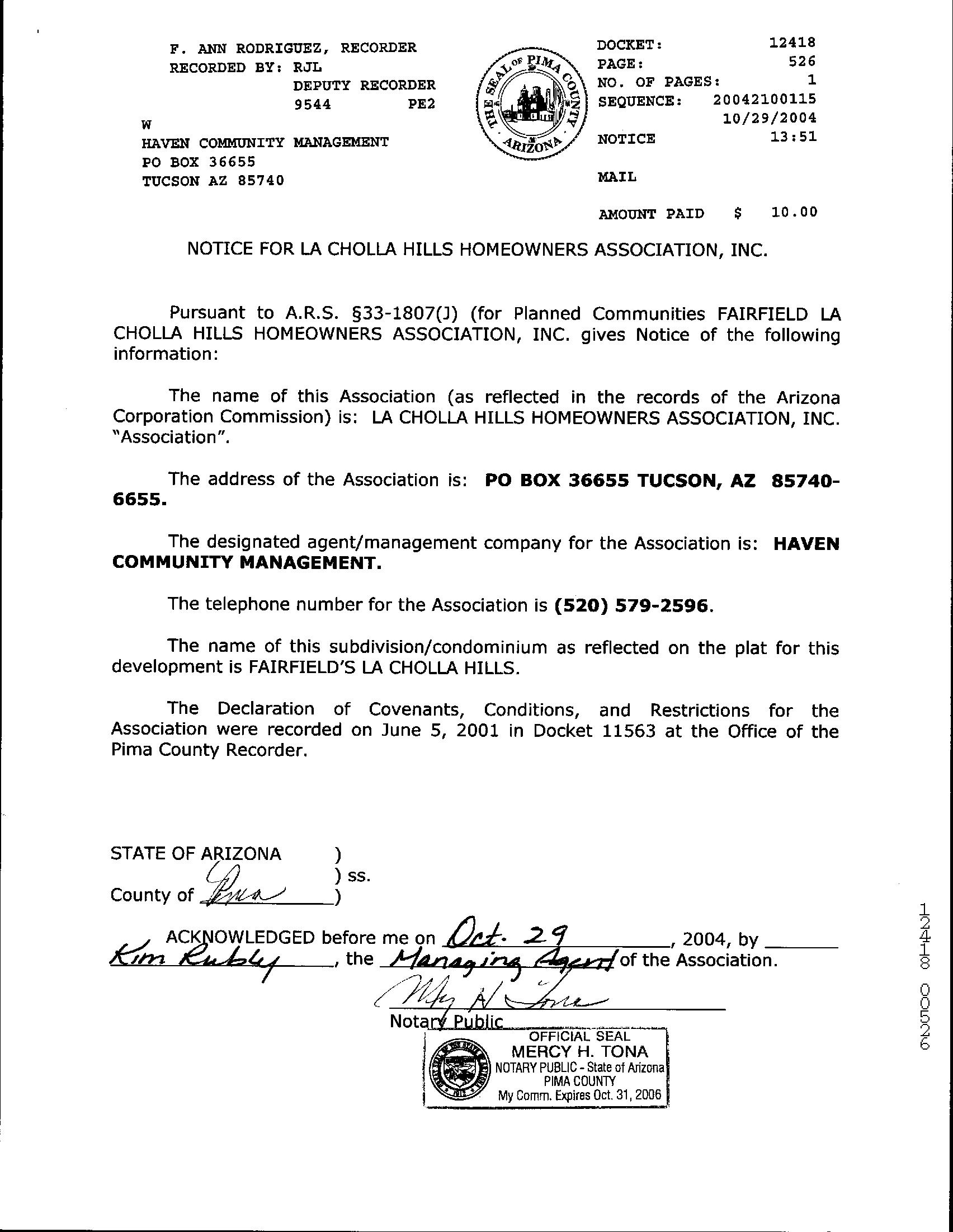 Branch:FC0,User:LMRAComment:StationId:RL13 PIMA,AZPage1of1Printedon12/9/202212:55:59PM Document:NOTHOA2014.346.0018