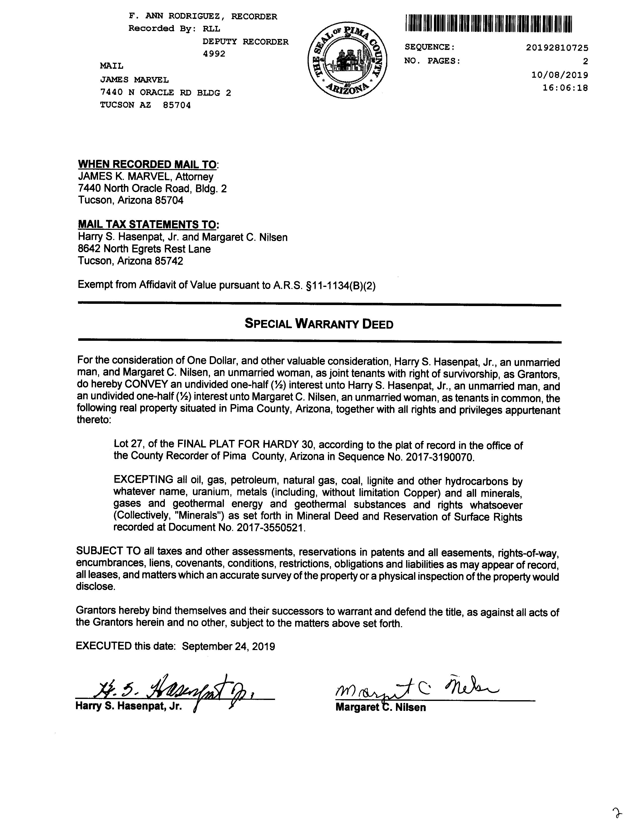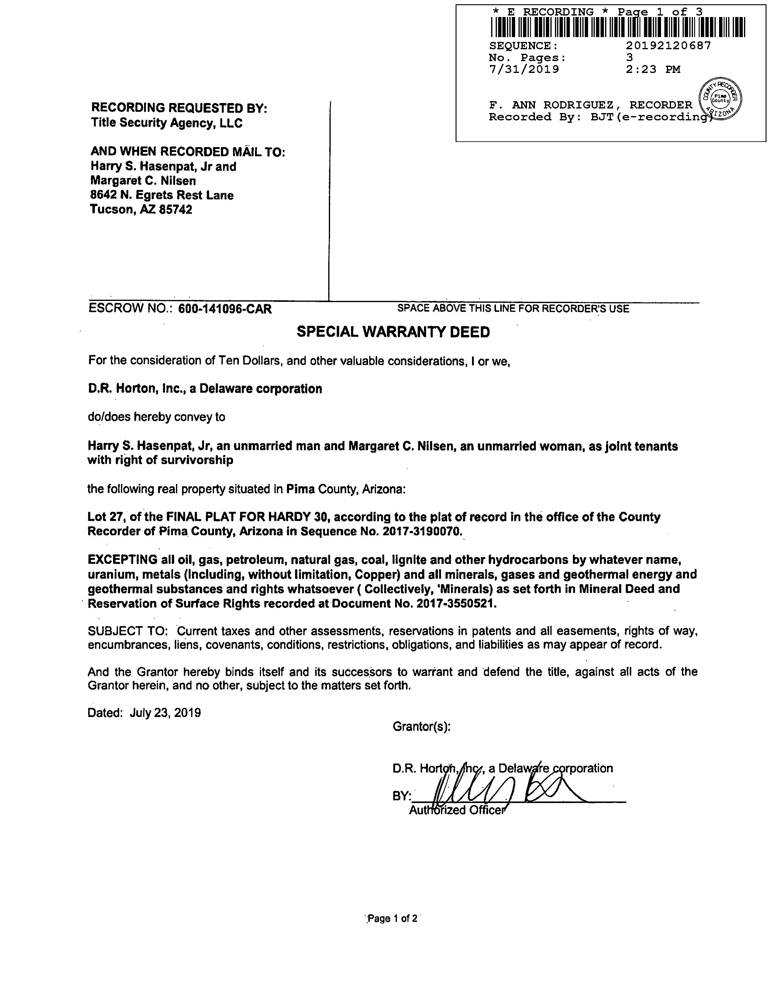 Owner Name: Hasenpat Harry S Jr /Nilsen Margaret C APN / Alternate APN: 225-29-4760 / Deed Type: Special Warranty Deed Land Use: Sfr Subdivision / Tract: Hardy 30 / Lot Size: 6,008 Year Built / Eff: 2019 / Rec. Date / Price: 07/31/2019 / $276,520 Living Area: 1,693 # of units: