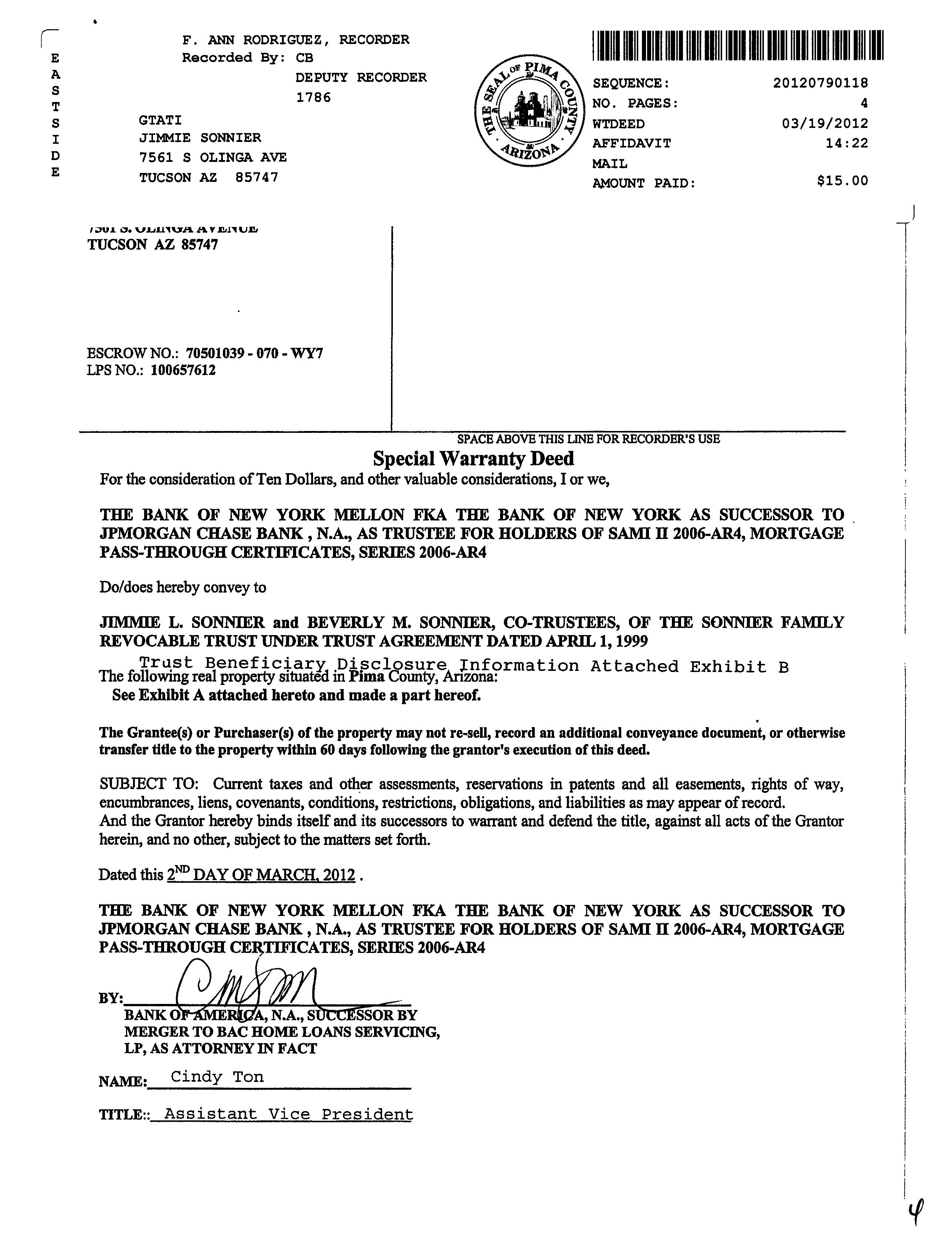 #20 101 S Evelyn Ave Tucson Az 85710 Owner Name: Dwf Vi Atlas Sfr-az Llc / APN / Alternate APN: 133-31-0050 / Deed Type: Warranty Deed Land Use: Sfr Subdivision / Tract: Centennial Park 03 / Lot Size: 8,644 Year Built / Eff: 1967 / Rec. Date / Price: 06/14/2022 / $340,000 Living Area: 1,917 # of units: Document #: 1650455 Bedrooms: Pool: Total Tax Value: $177,831 Bath(F/H): / Customer Name : Lisa Mrazek Customer Company Name : First American Title Insurance Company Prepared On : 08/22/2022 © 2022 CoreLogic. All rights reserved