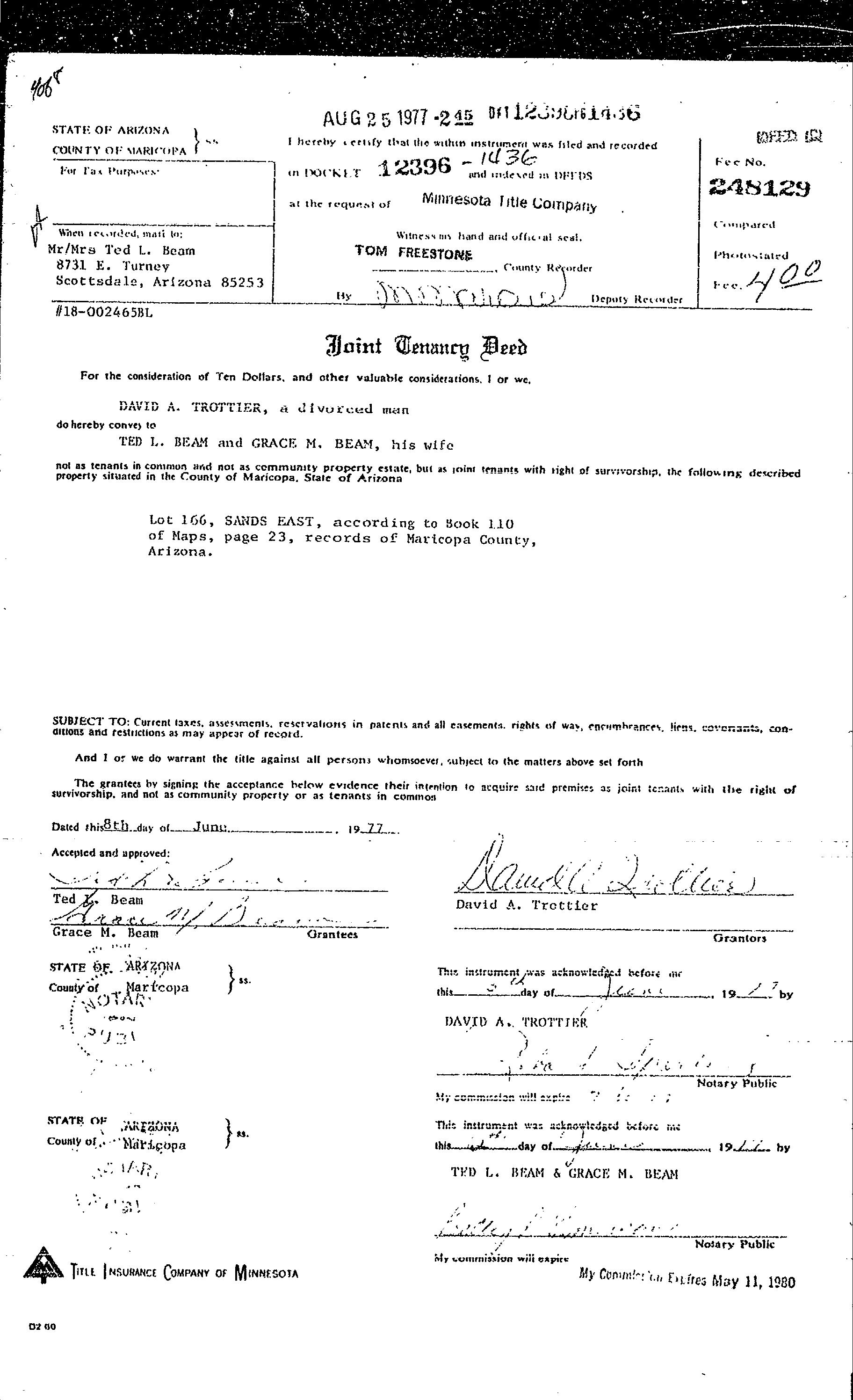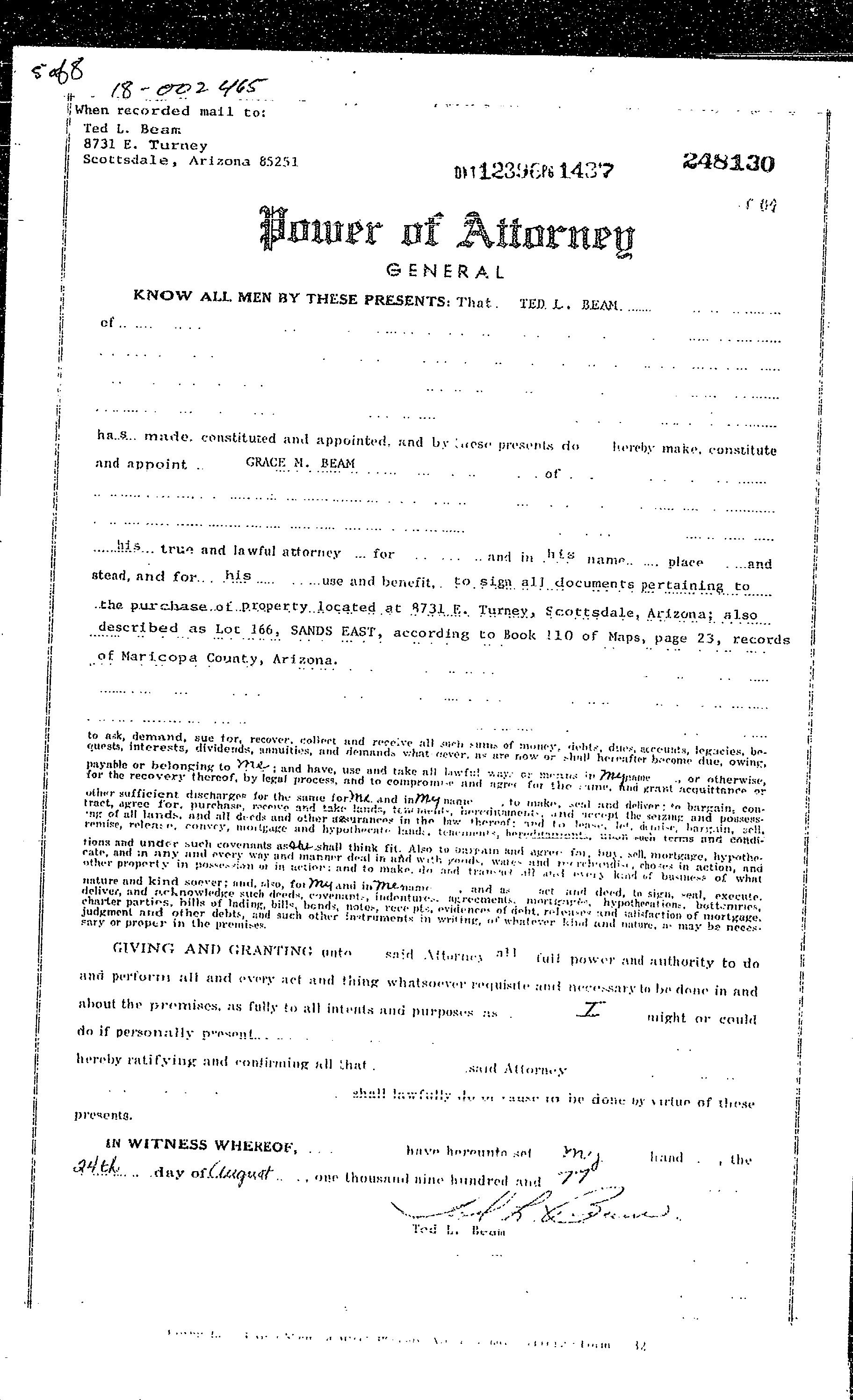Subject Property : 8731 E Turney Ave Scottsdale AZ 85251 Owner Information Owner Name : Beam Theodore Lester / Beam Deborah Ann Mailing Address : 8731 E Turney Ave, Scottsdale AZ 85251-2931 C009 Vesting Codes : Husband/wife / / Community Property Owner OccupiedIndicator : O Location Information Legal Description : Lot 166 Sands East County : Maricopa, Az Subdivision : Sands East Census Tract / Block : 2171.02 / 2 Map Reference : 11023 Township-Range- Sect : 02N-04E-24 School District : Scottsdale 48 Legal Lot : 166 Munic/Township : Scottsdale APN : 173-55-163 Neighbor Code : 19-006 Owner Transfer Information Recording/Sale Date : 04/19/2005 / 04/14/2005 Deed Type : Warranty Deed Document # : 498741 Last Market Sale Information Recording/Sale Date : 02/23/1983 / 02/00/1983 Deed Type : Deed (reg) Sale Price : $97,567 Price Per SqFt : $47.36 Document # : 63876 Seller Name : Beam Ted L & Grace M Prior Sale Information Prior Rec/Sale Date : 06/08/1977 Prior Deed Type : Joint Tenancy Deed Prior Sale Price : $72,000 Customer Name : Jeremiah Stiffler Customer Company Name : First American Prepared On : 08/30/2022 © 2022 CoreLogic. All rights reserved