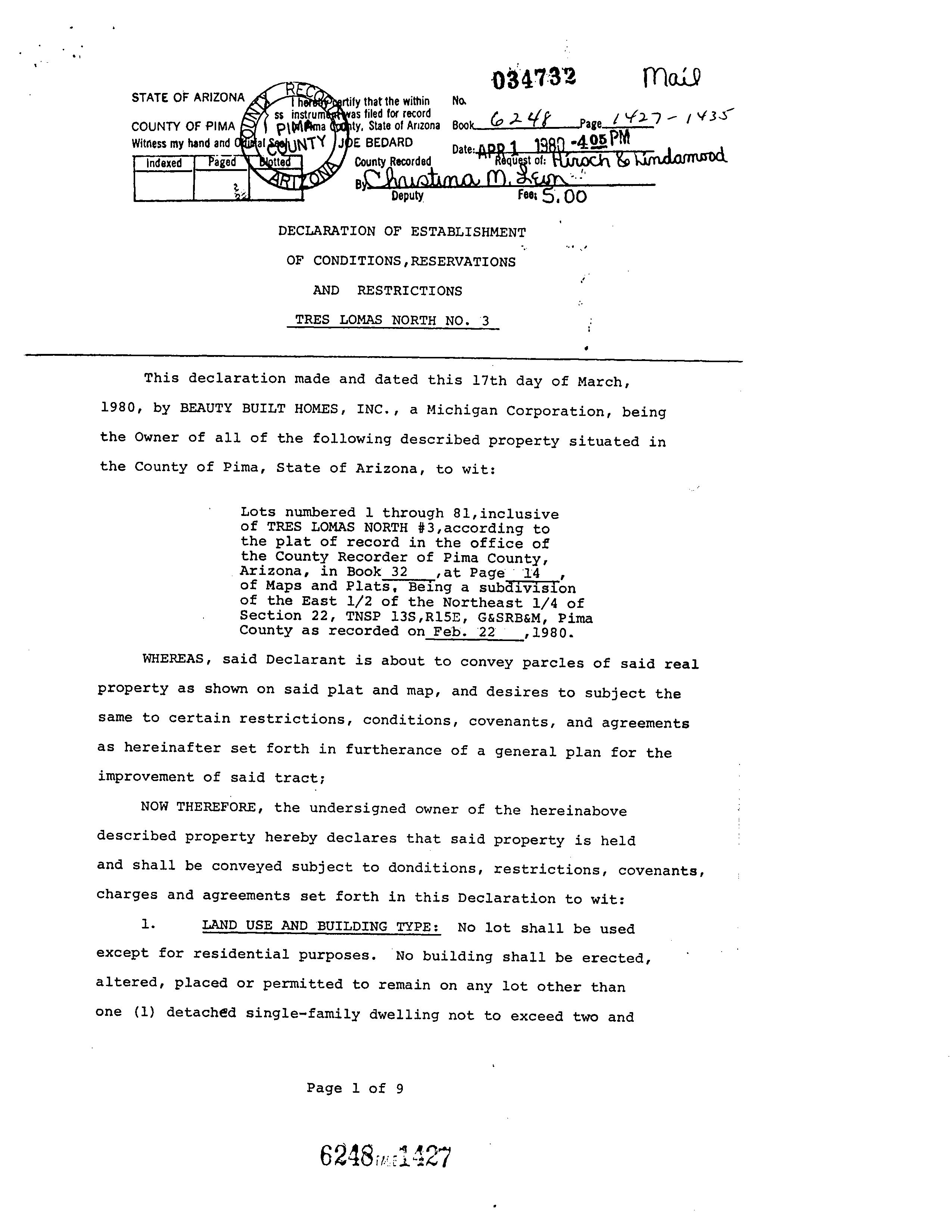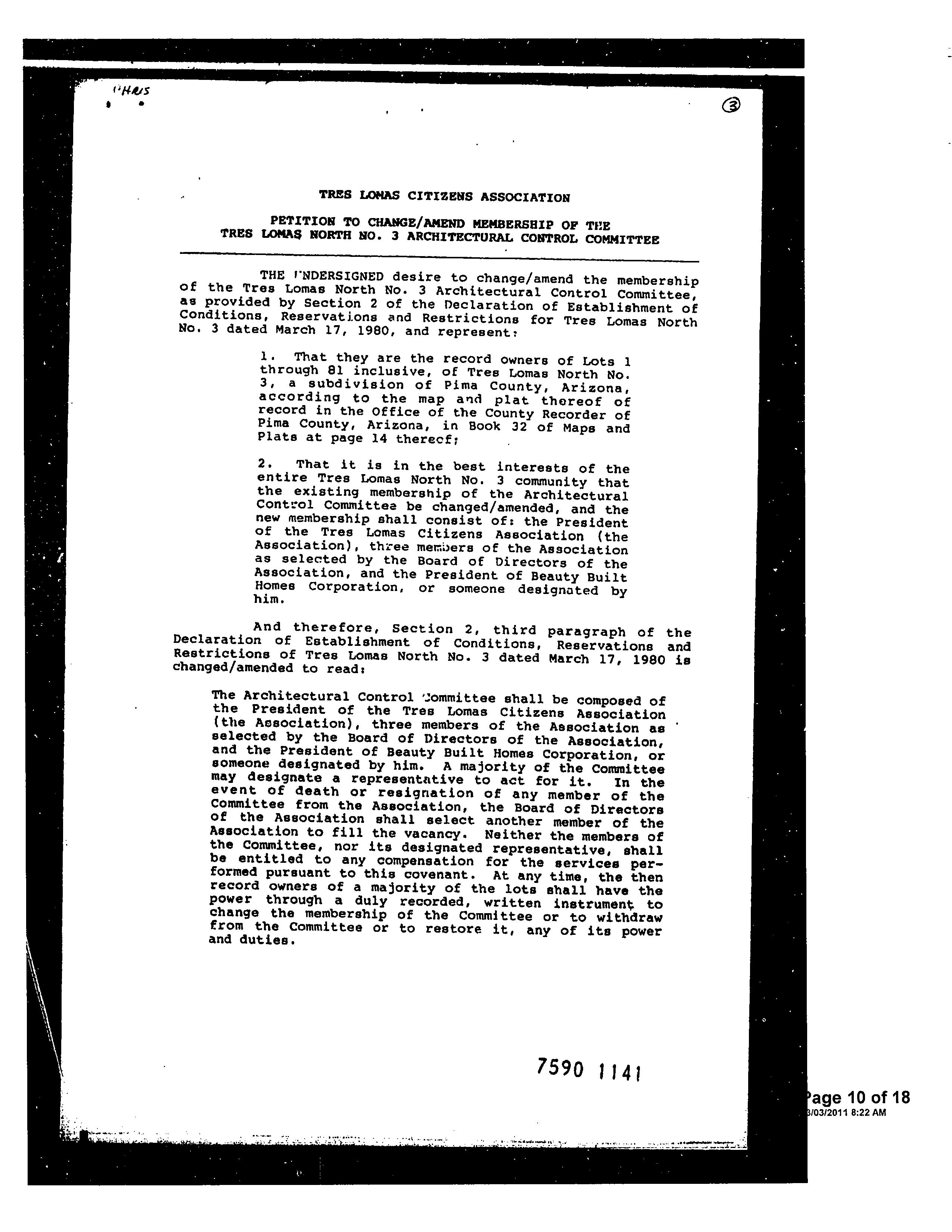 ©2021 First American Financial Corporation and/or its affiliates. All rights reserved. NYSE: FAF 05252610821 COVENANTS, CONDITIONS & RESTRICTIONS PREPARED FOR : First American Title Insurance Company, and the operating divisions thereof, make no express or implied warranty respecting the information presented and assume no responsibility for errors or omissions. First American, the eagle logo, First American Title, and firstam.com are registered trademarks or trademarks of First American Financial Corporation and/or its affiliates. 9441 East Walnut Tree Drive Tucson, AZ 85749