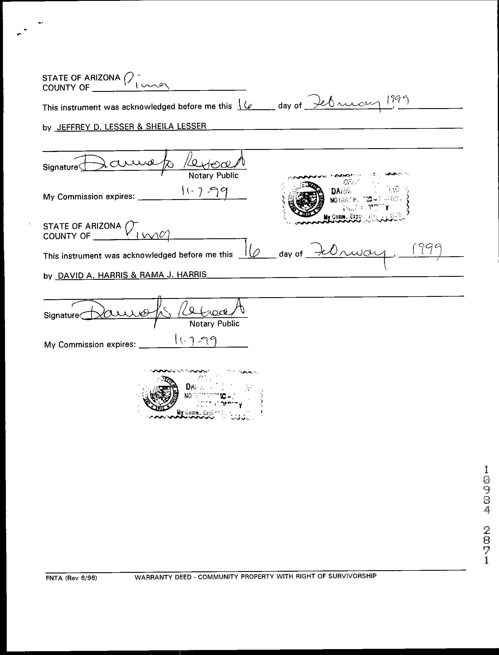 Owner Name: Lesser Jeffrey D /Lesser Sheila APN / Alternate APN: 223-03-5110 / Deed Type: Warranty Deed Land Use: Sfr Subdivision / Tract: Sun City Vistoso / Lot Size: 8,104 Year Built / Eff: 1988 / Rec. Date / Price: 02/16/1999 / $167,475 Living Area: 1,750 # of units: