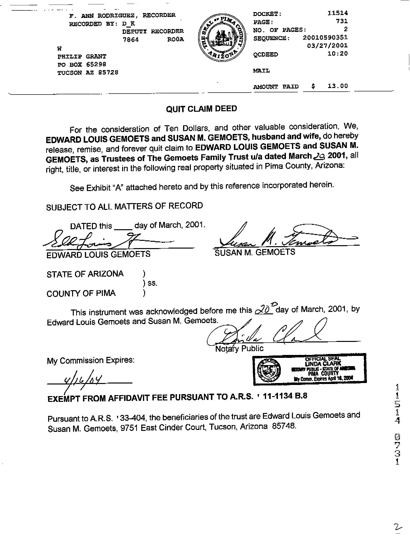 Recording/Sale Date : 03/27/2001 / 03/20/2001 Deed Type : Quit Claim Deed