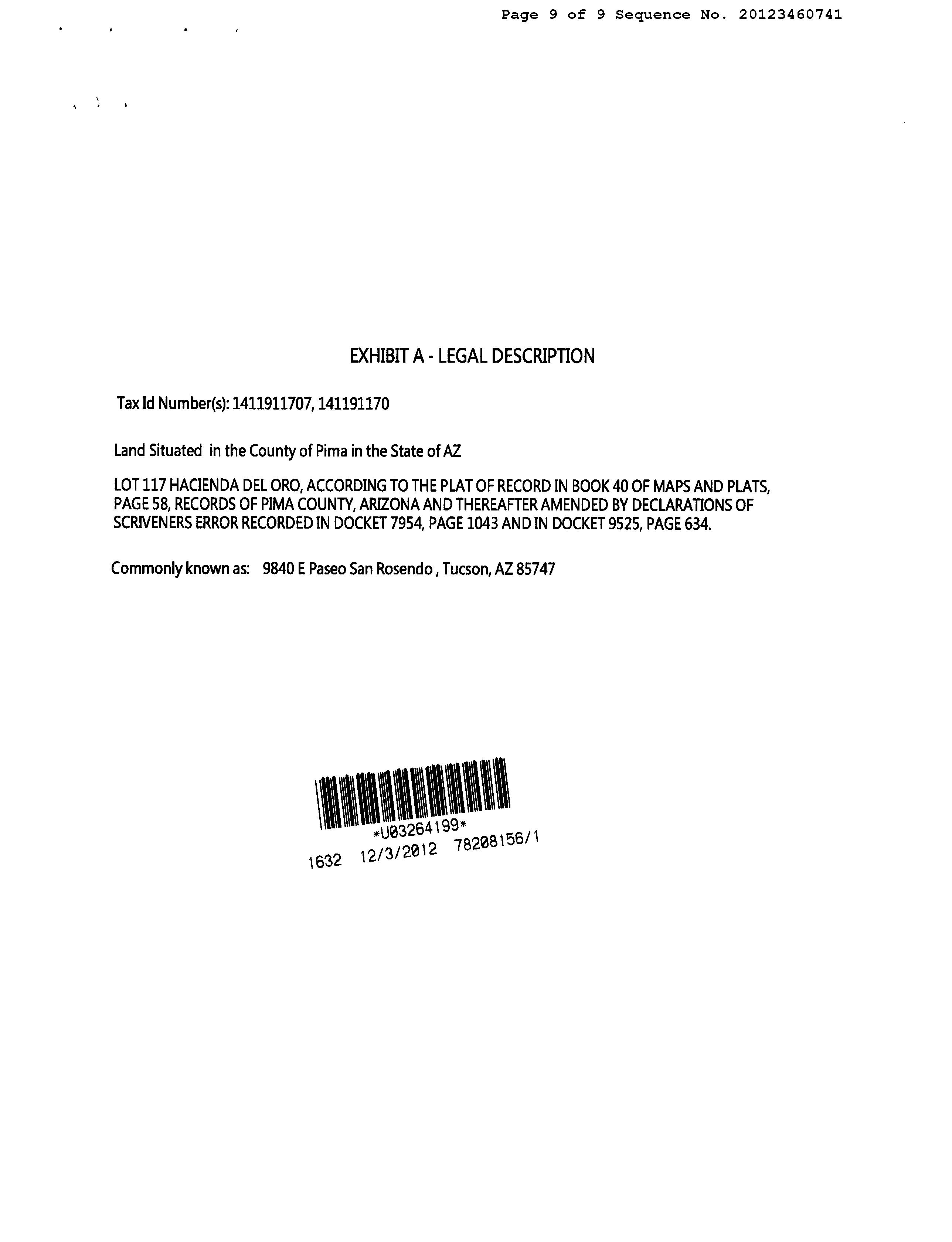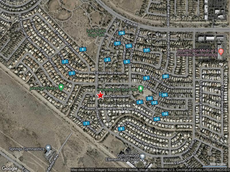 Owner Name: Corn Steven N / APN / Alternate APN: 141-20-0890 / Deed Type: Warranty Deed Land Use: Sfr Subdivision / Tract: Hacienda Del Oro / Lot Size: 7,789 Year Built / Eff: 2000 / Rec. Date / Price: 07/25/2022 / $360,000 Living Area: 1,738 # of units: Document #: 2060122 Bedrooms: Pool: Total Tax Value: $176,826 Bath(F/H): / #8 9765 E Paseo Del Tornasol Tucson Az 85747