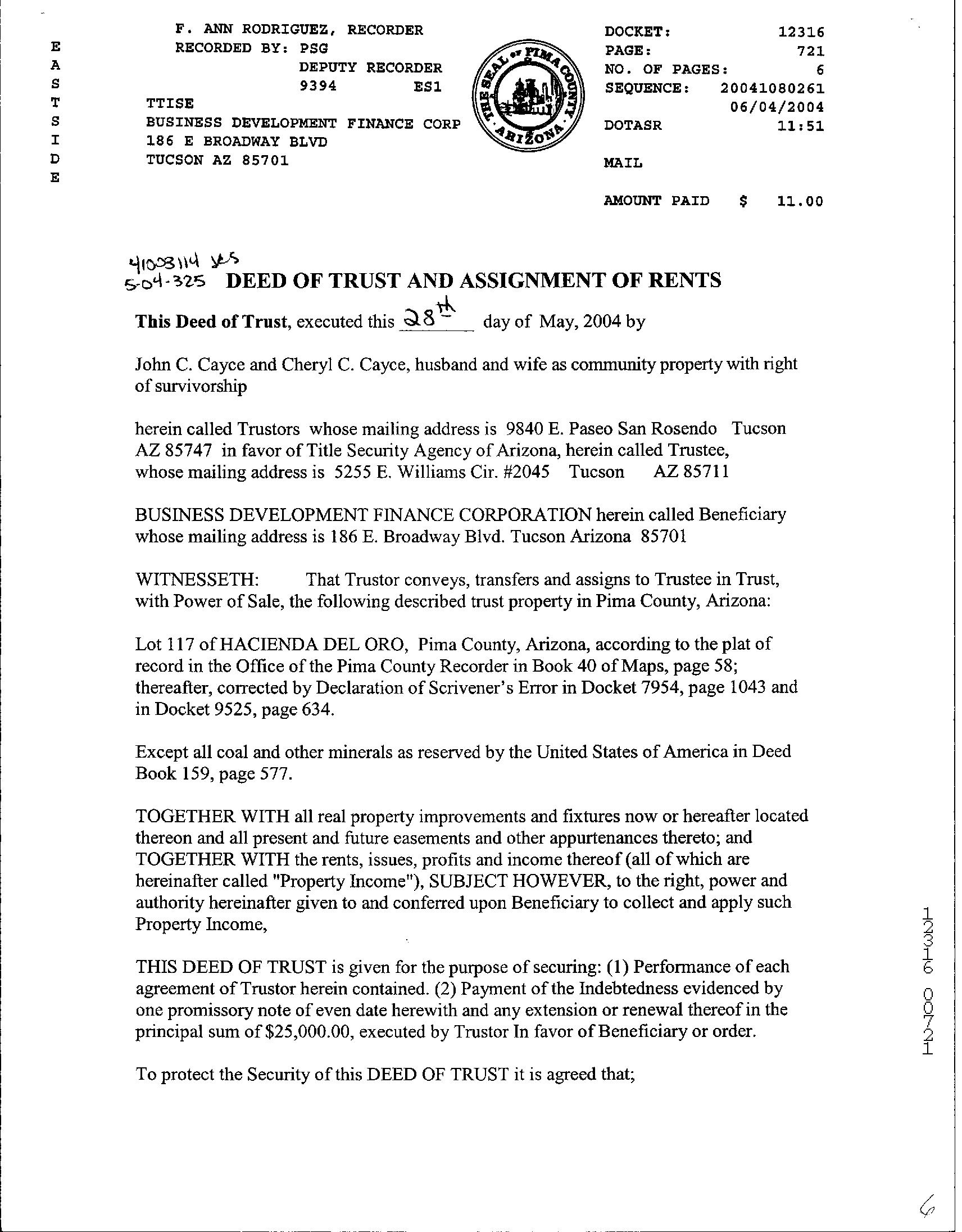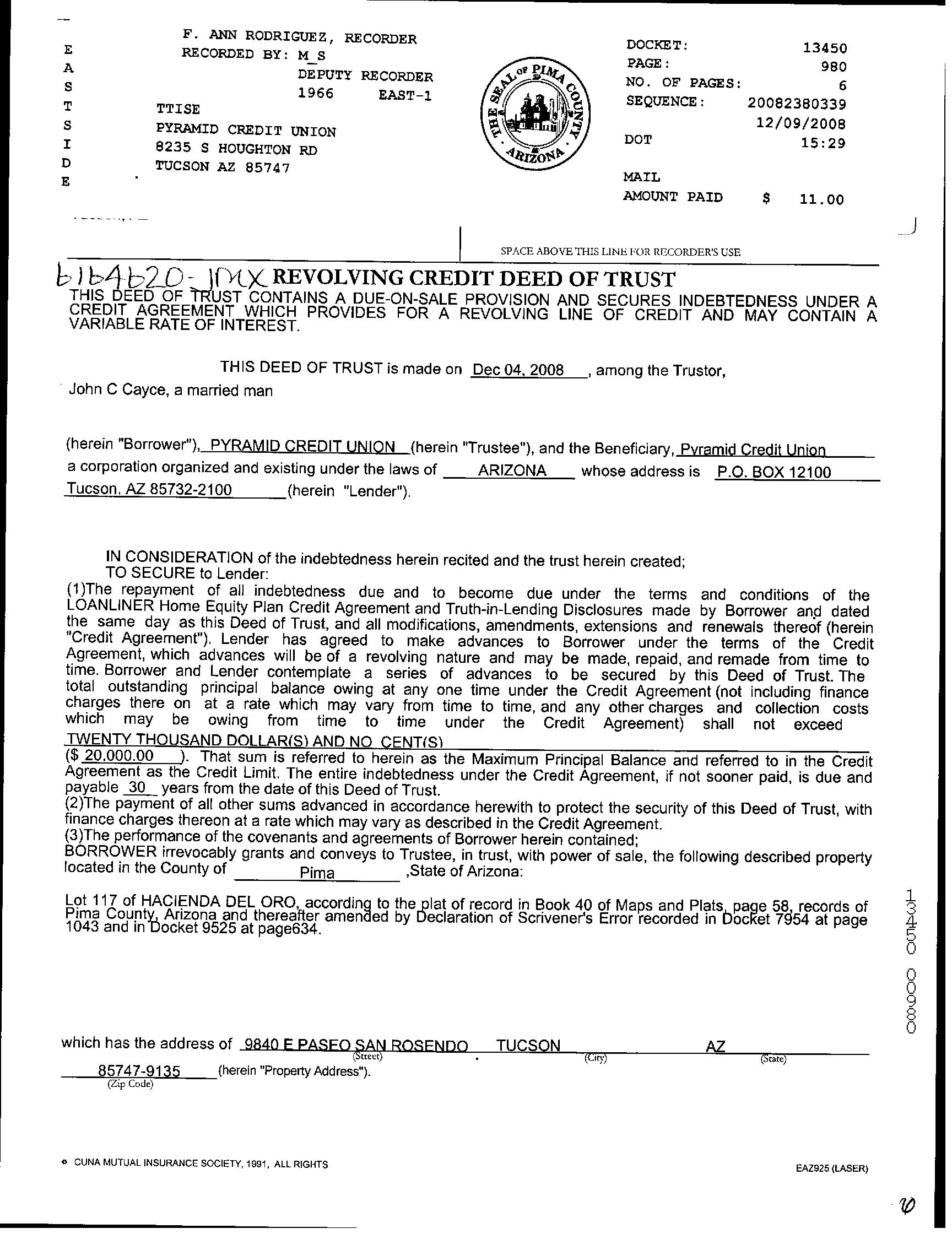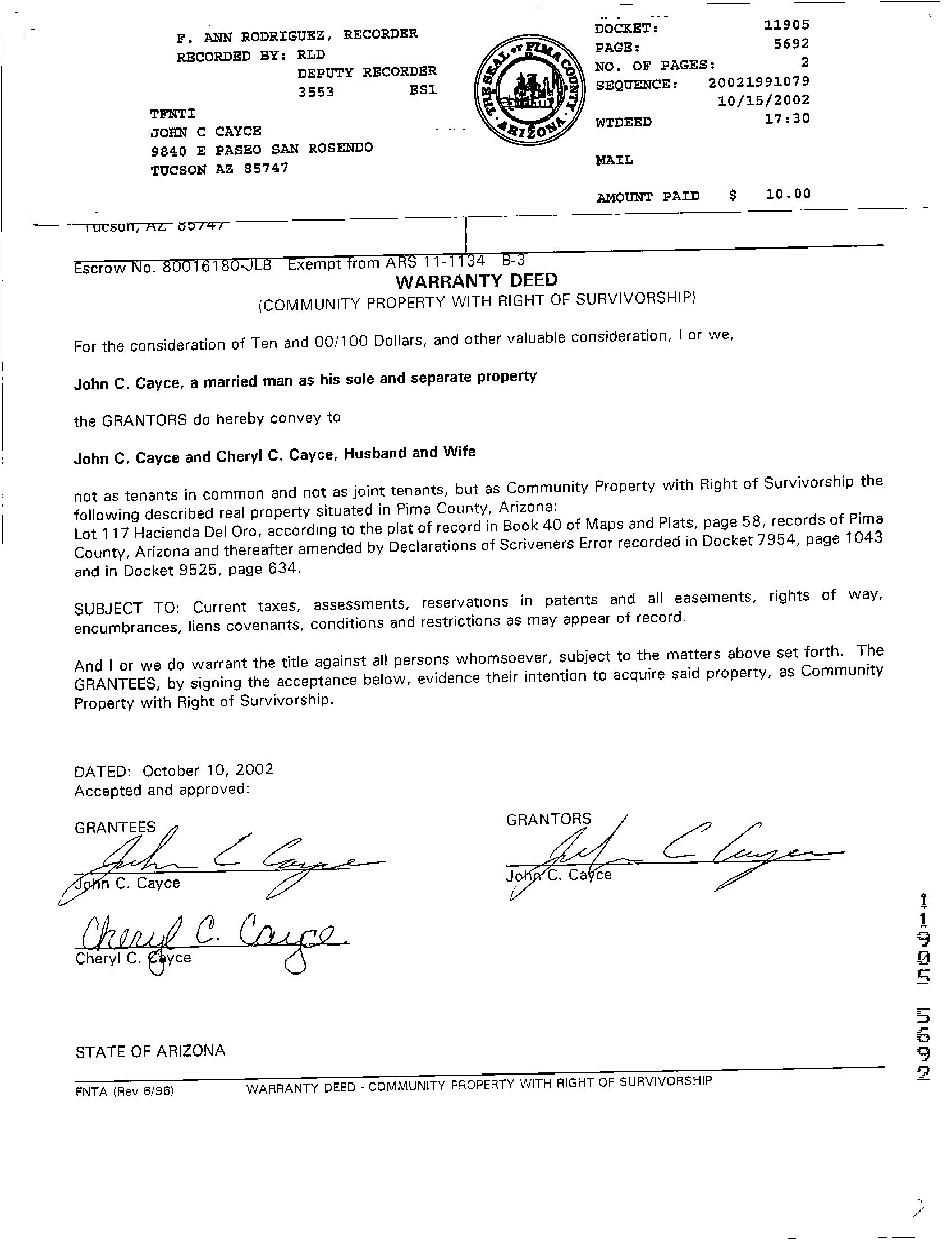Owner Name: Cayce John C /Cayce Cheryl C APN / Alternate APN: 141-19-1170 / Deed Type: Warranty Deed Land Use: Sfr Subdivision / Tract: Hacienda Del Oro / Lot Size: 9,191 Year Built / Eff: 1993 / Rec. Date / Price: 10/15/2002 / $130,000 Living Area: 1,710 # of units: Document #: 11905-5680 Bedrooms: Pool: Pool Total Tax Value: $178,867 Bath(F/H): / #1 9792 E Via De Sisneroz Tucson Az 85747